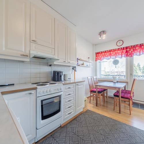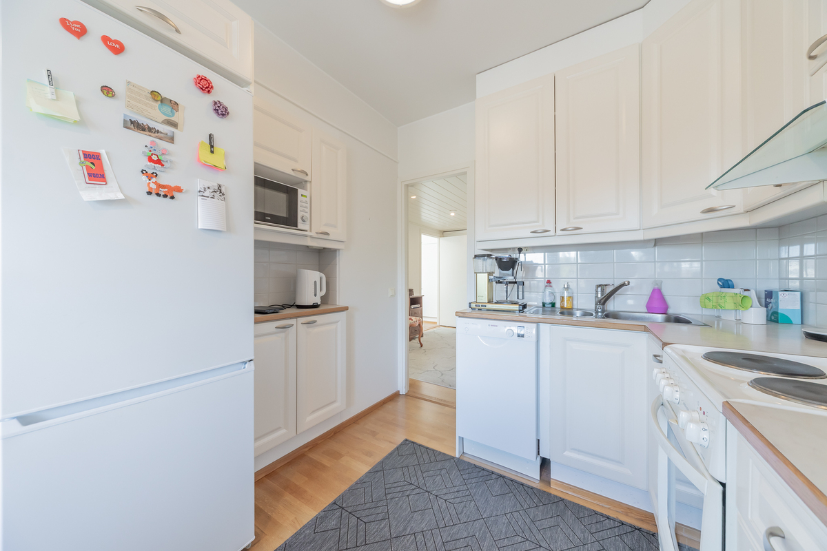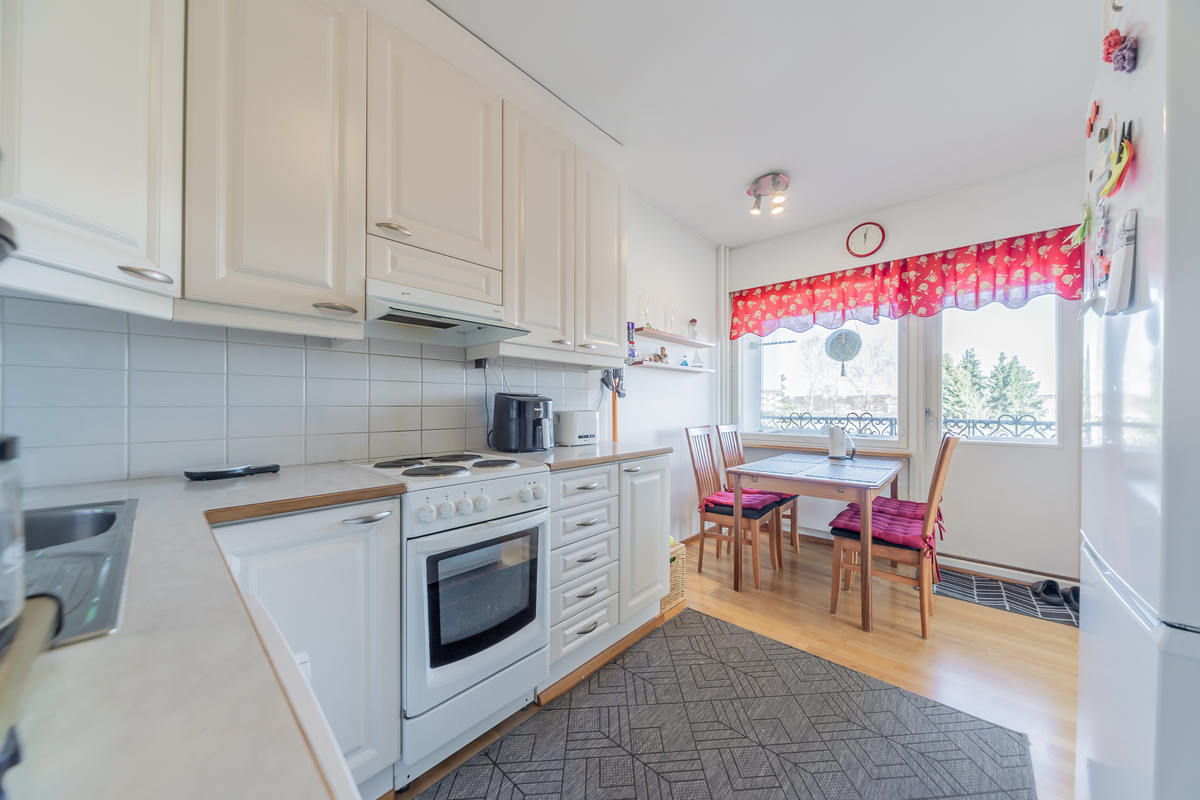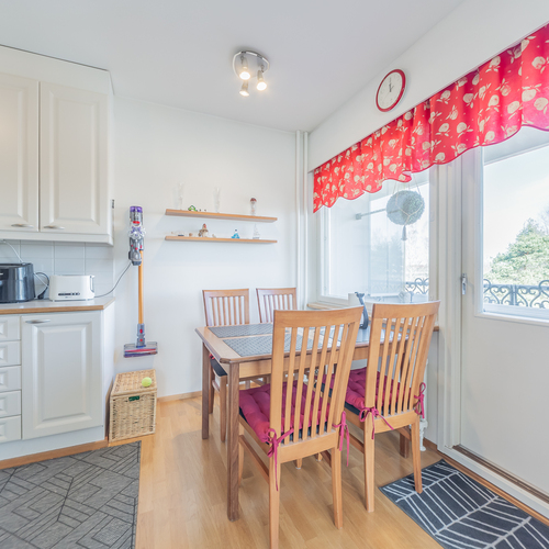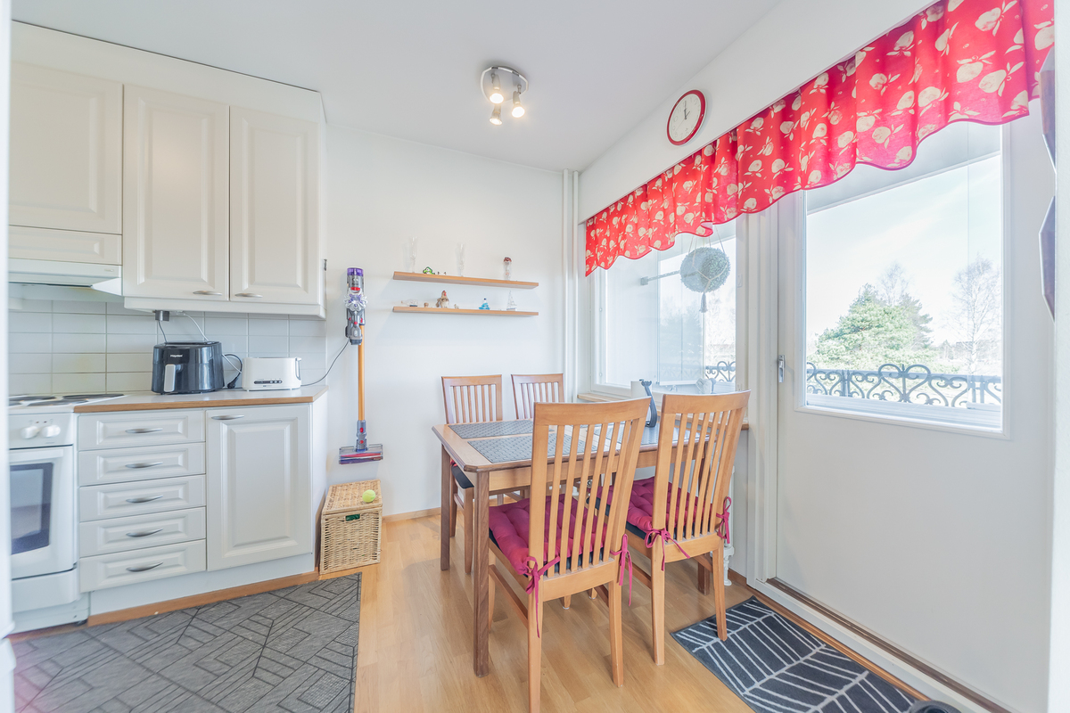 Vaaleassa keittiössä on paljon kaappeja ja hyvin työtilaa, lisäksi paikka ruokapöydälle, sopivasti ikkunan edessä, ikkunasta kun pääsee katselemaan upeaa jokimaisemaa. Keittiöstä on käynti lasitetulle parvekkeelle, joka jo nyt kevätauringon paistaessa houkuttaa viihtymään.