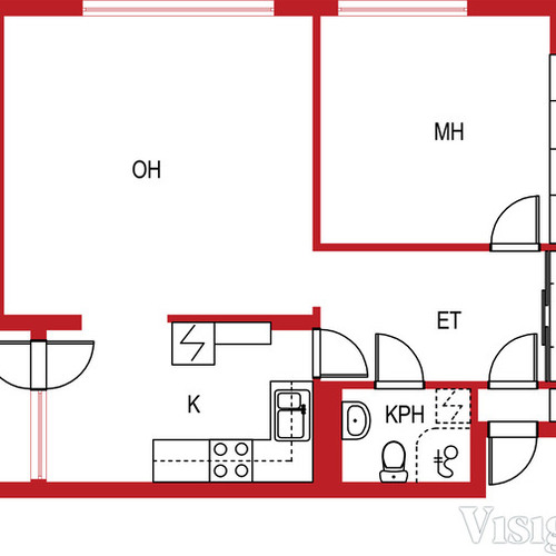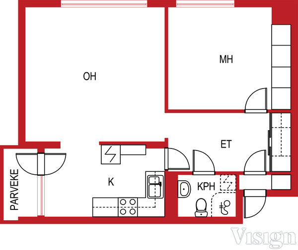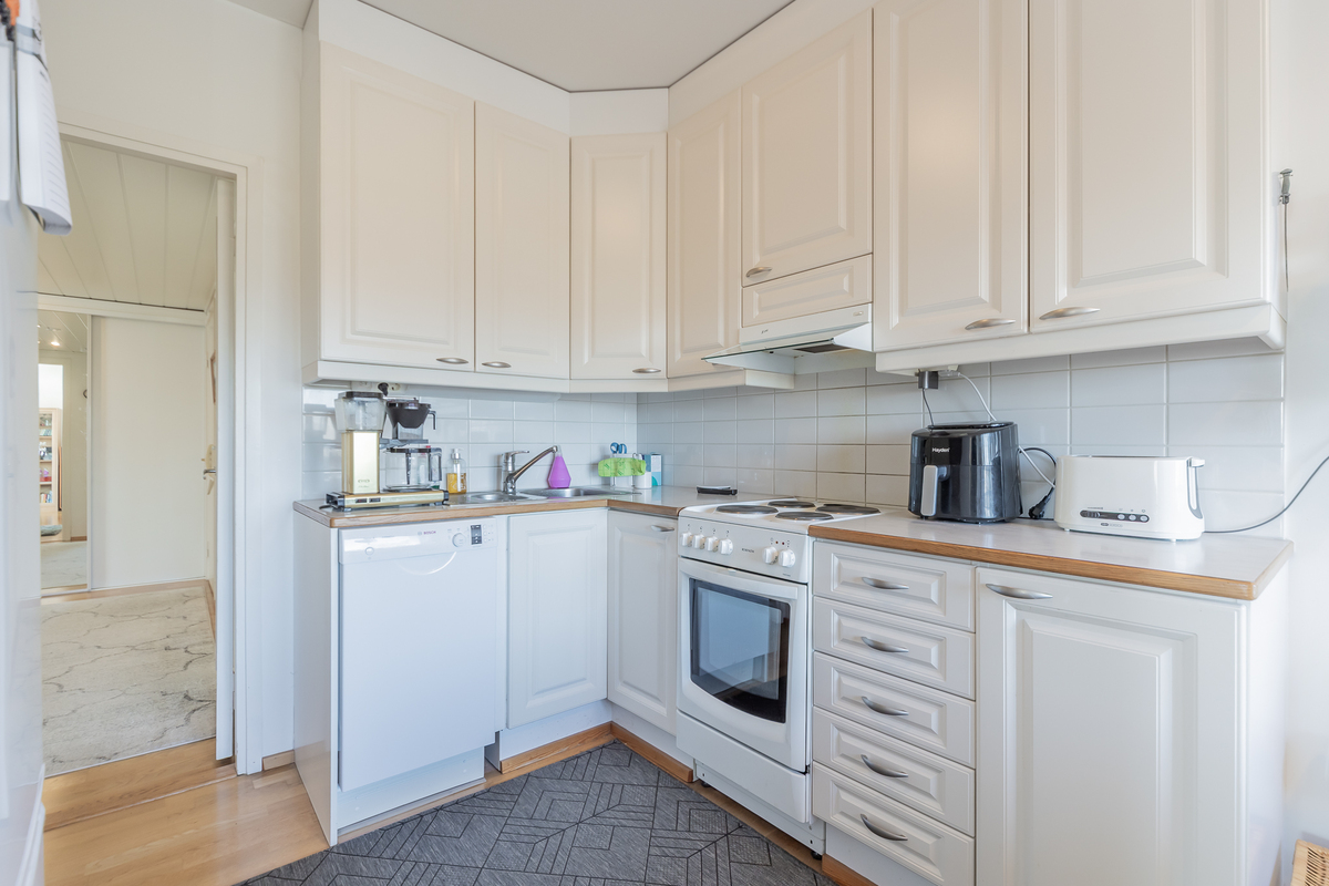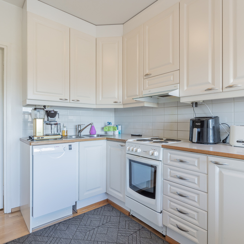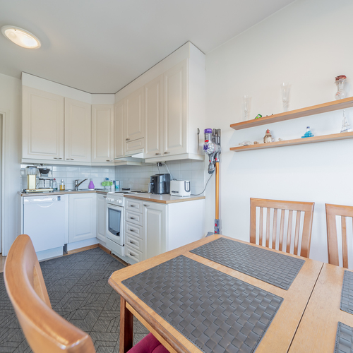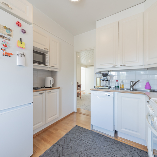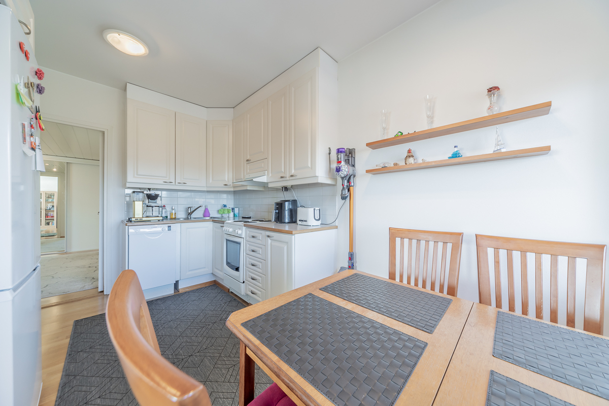 Vaaleassa keittiössä on paljon kaappeja ja hyvin työtilaa, lisäksi paikka ruokapöydälle, sopivasti ikkunan edessä, ikkunasta kun pääsee katselemaan upeaa jokimaisemaa. Keittiöstä on käynti lasitetulle parvekkeelle, joka jo nyt kevätauringon paistaessa houkuttaa viihtymään.