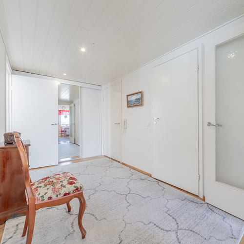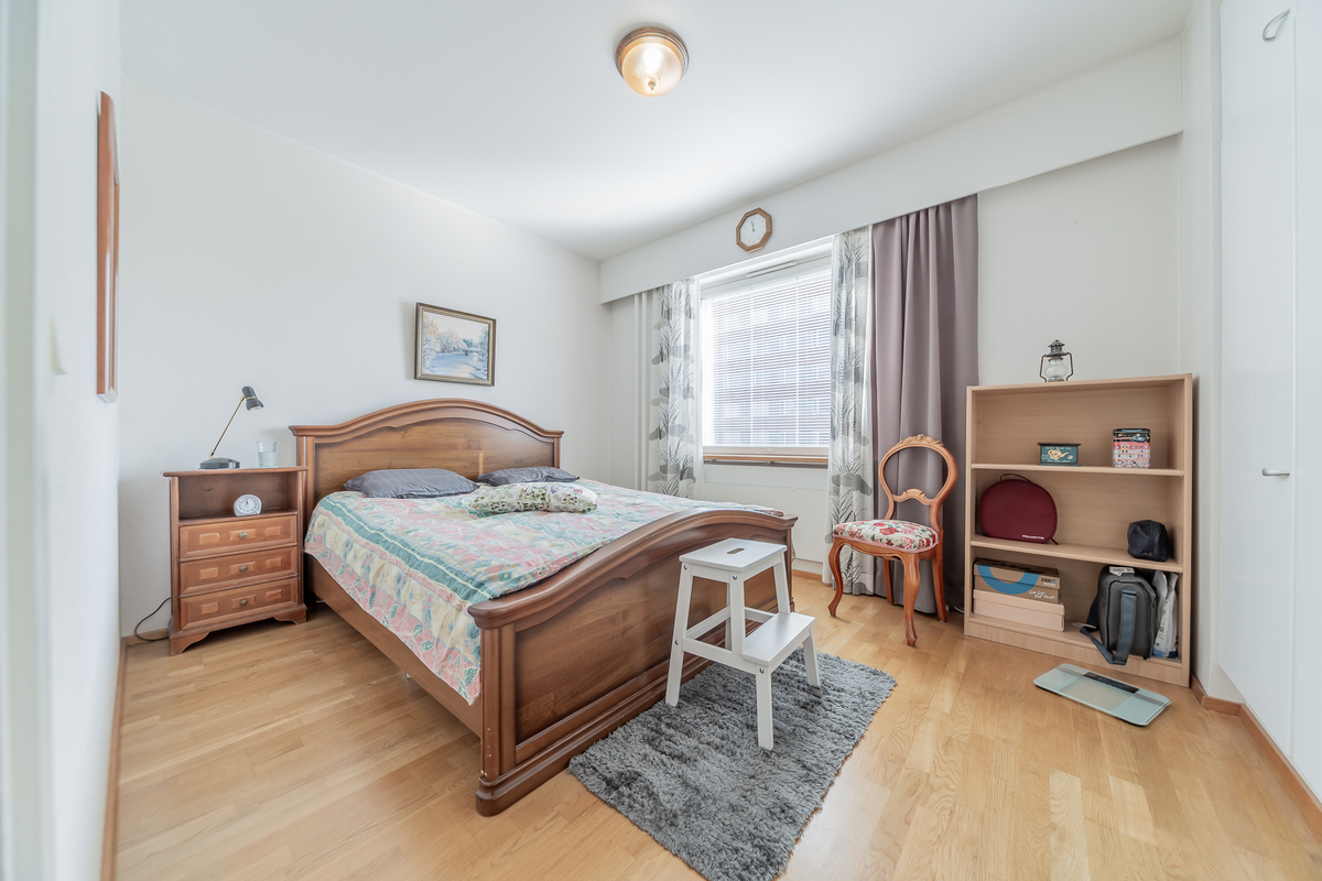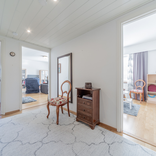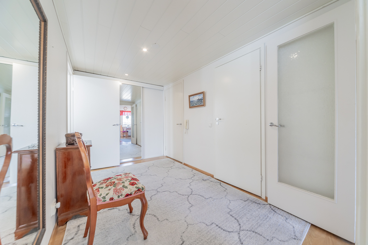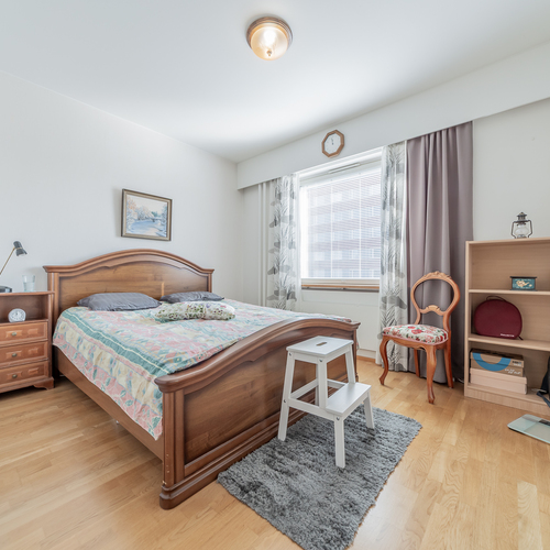 Hyvänkokoisessa makuuhuoneessa on reippaasti säilytystilaa, toki lisää säilytystilaa on upeassa eteisaulassa, siellä peililiukuovien takana. Tuo tilava eteisaula toivottaa tulijansa tervetulleeksi tähän kauniiseen kotiin.