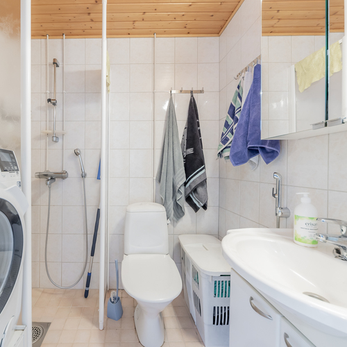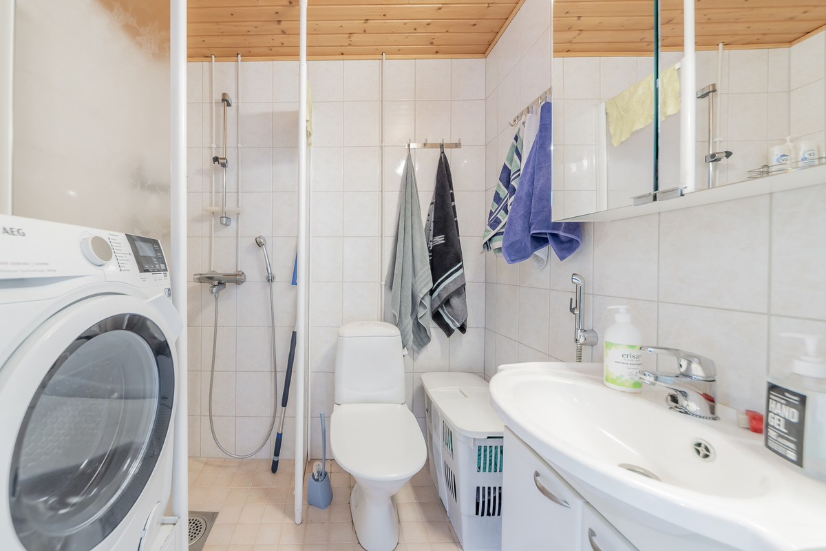 Laatoitetussa kylpyhuoneessa on suihkuseinällä varustettu suihkutila, suojaisa paikka pyykinpesukoneelle sekä kalustettu wc.