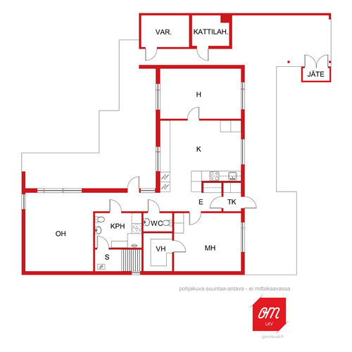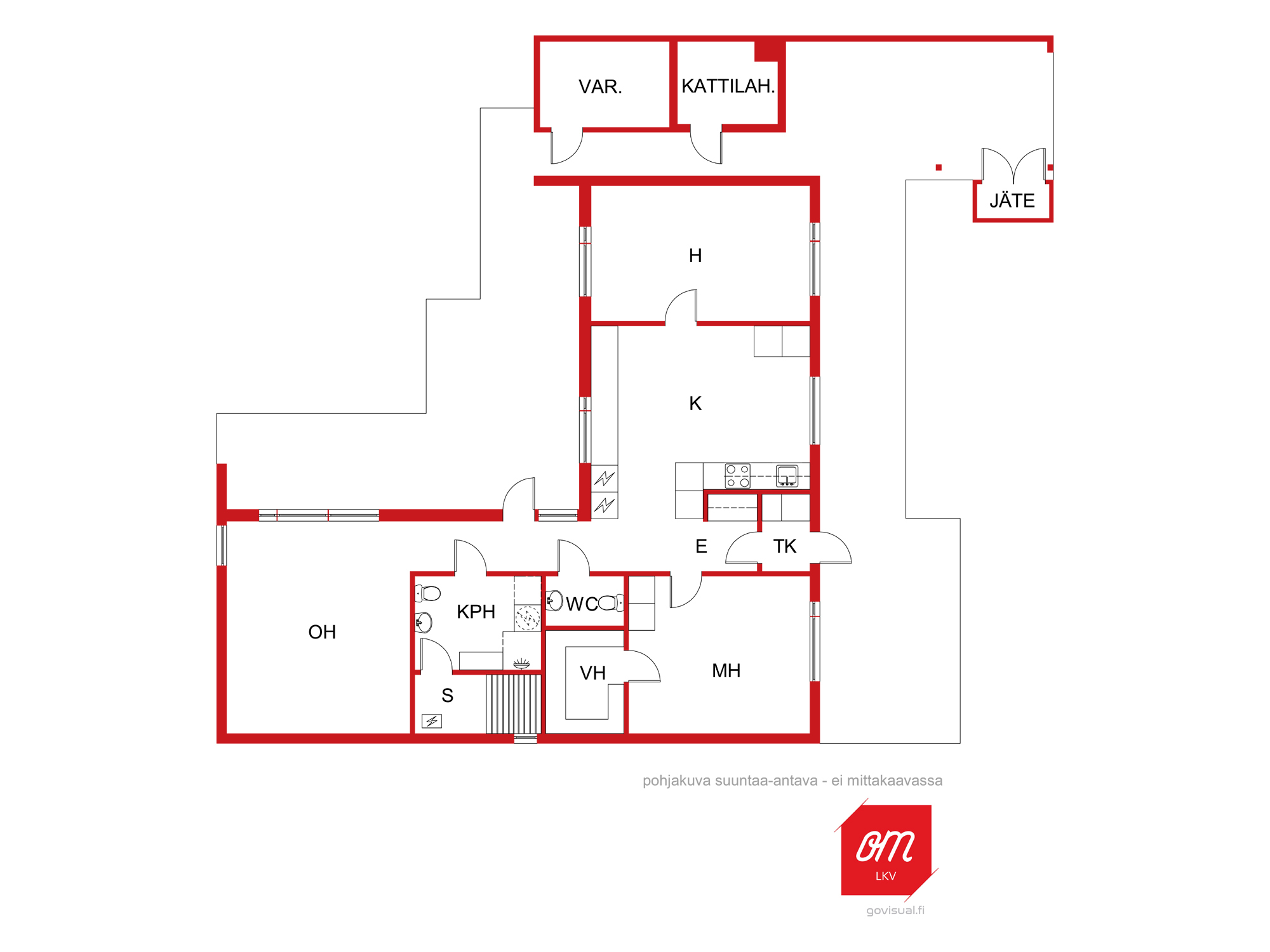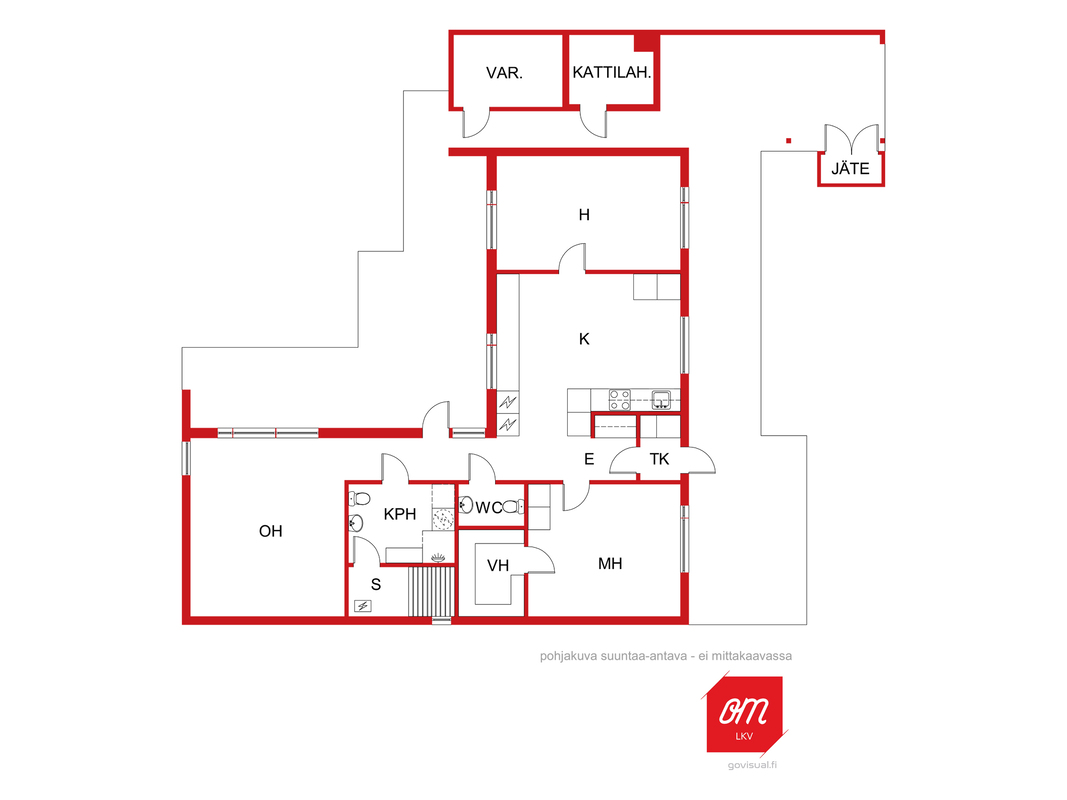 Varusteet: jääkaappipakastin, astianpesukone, sähköliesi, liesituuletin hormilla