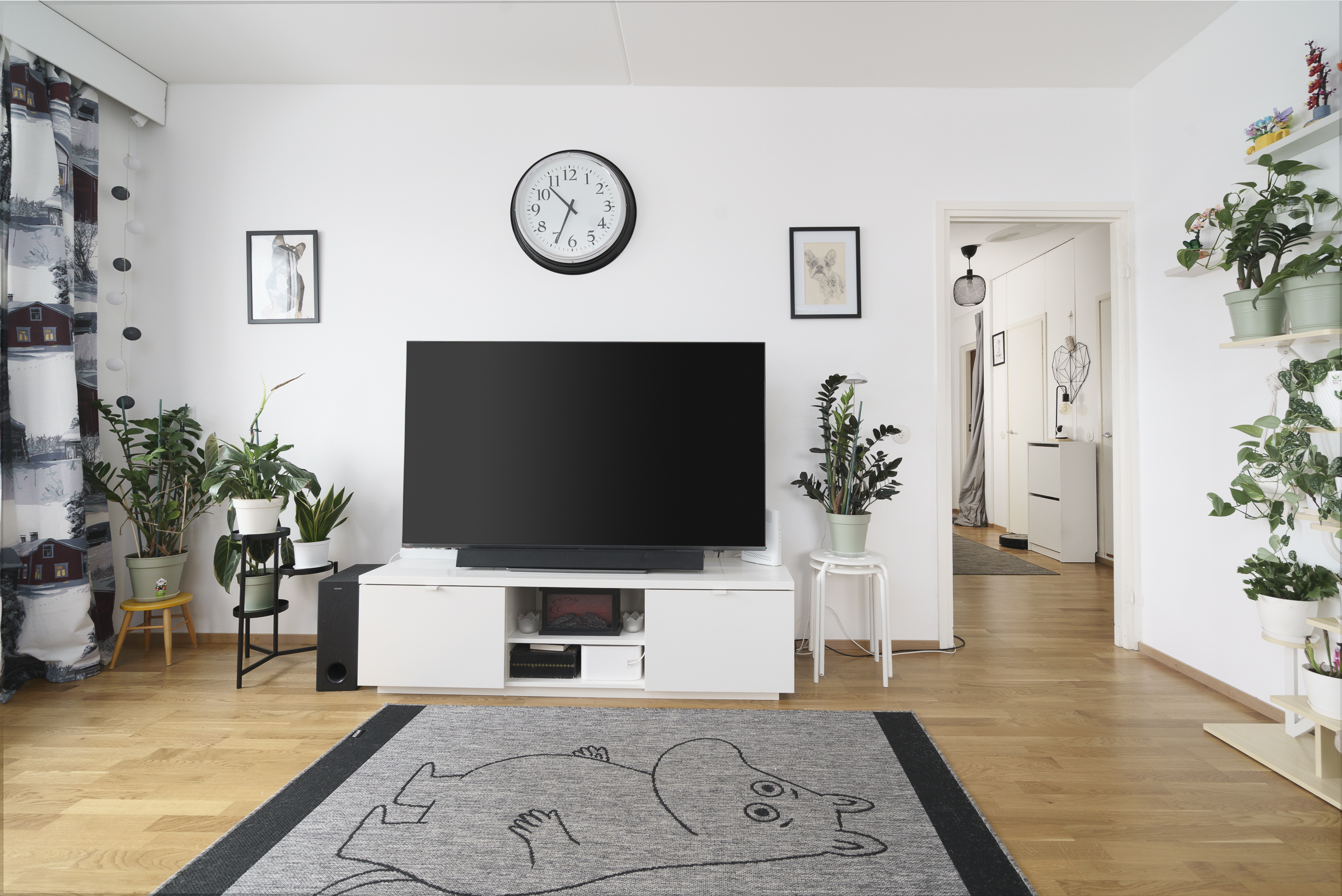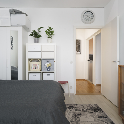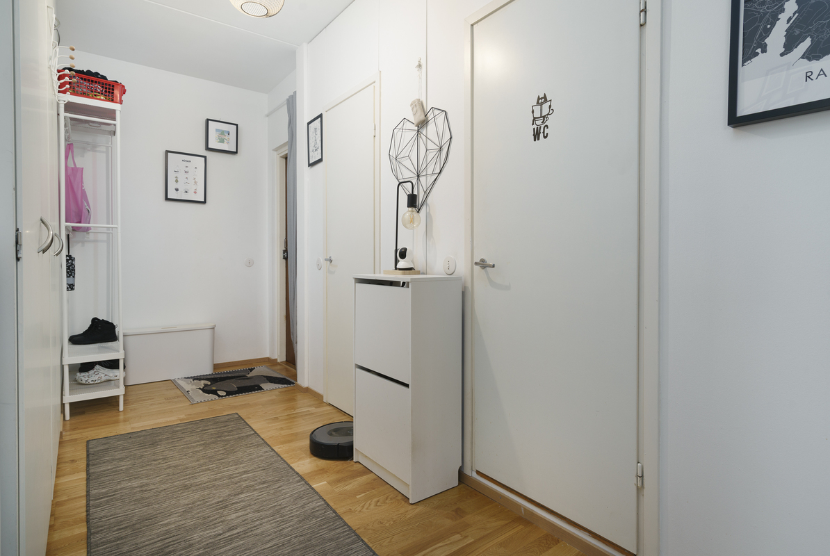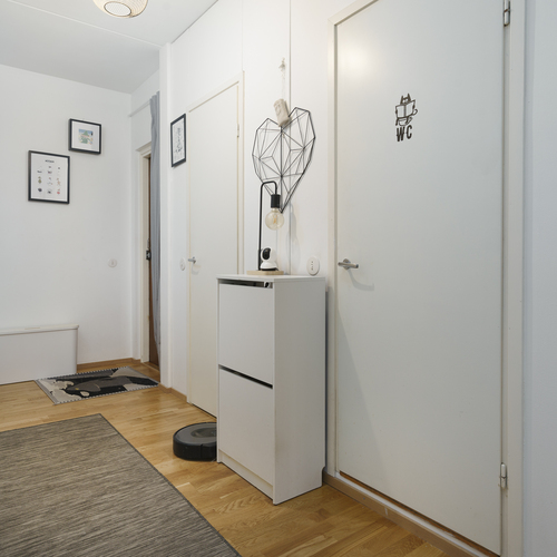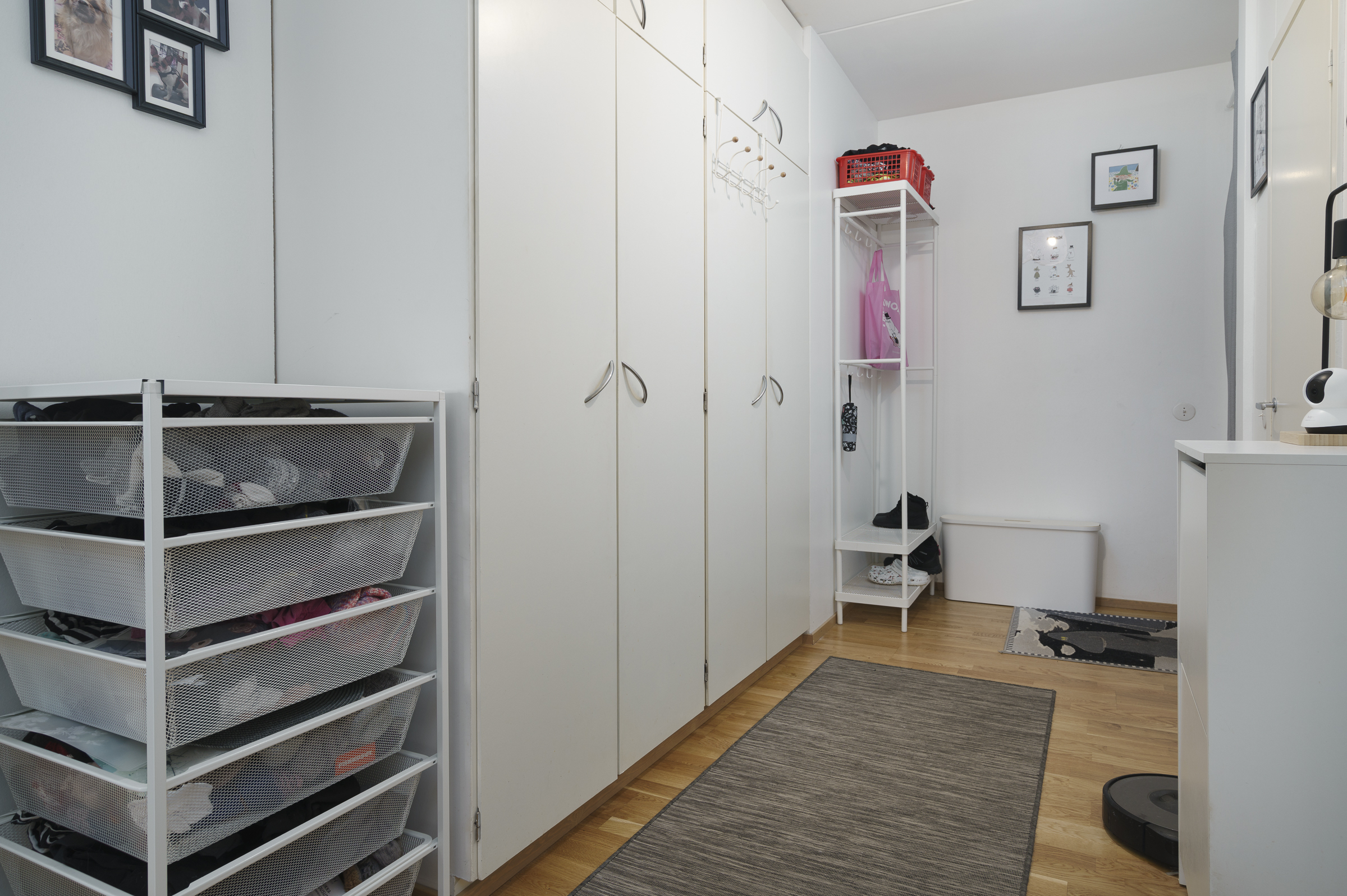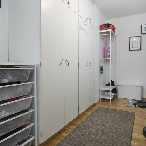 Maalatut seinät ja laminaattilattia. Eteisestä löytyy kaapisto ja naulakko.