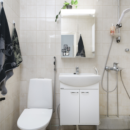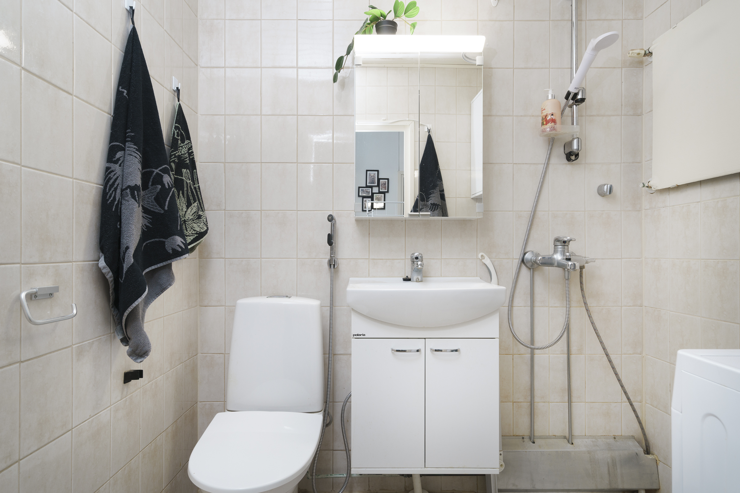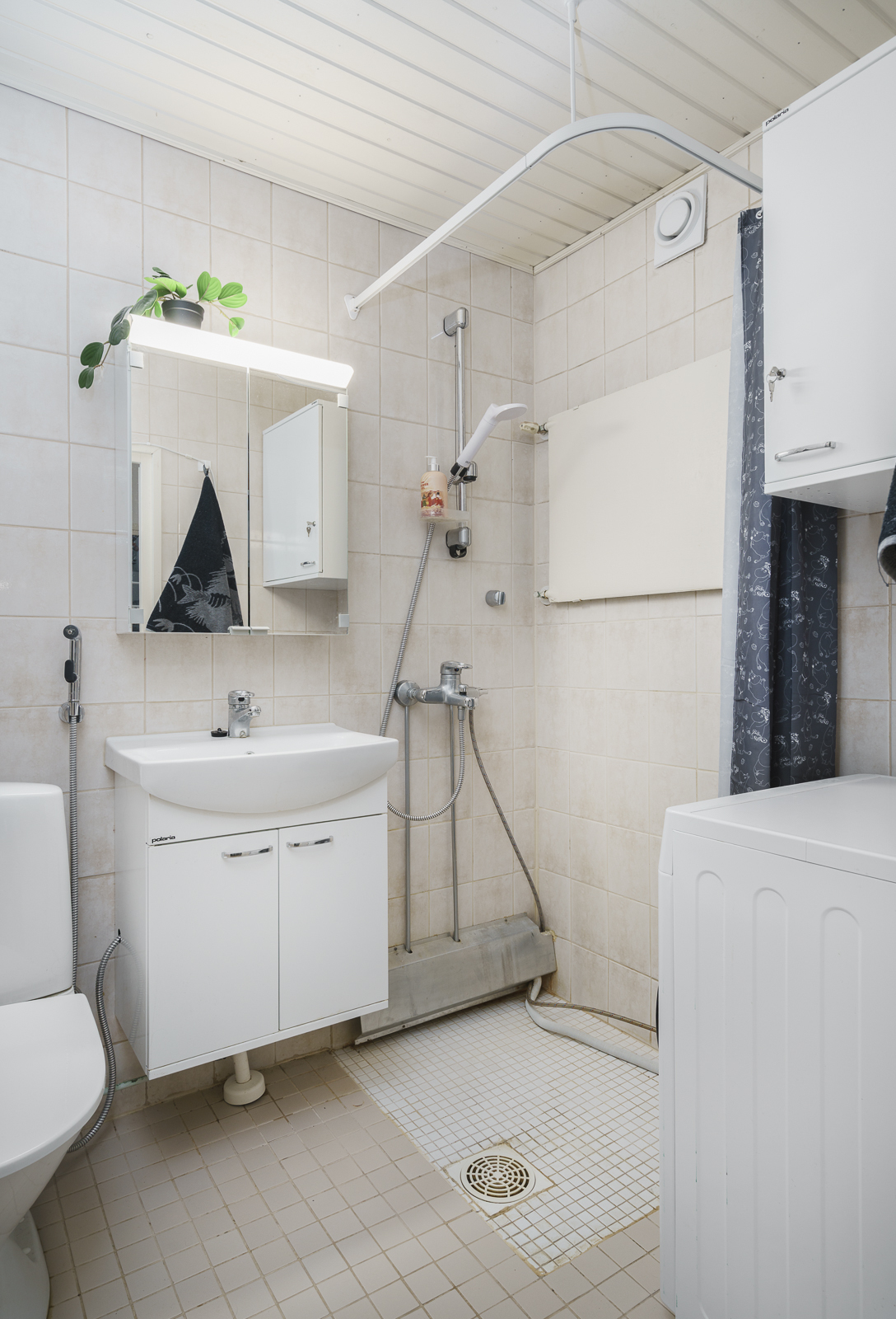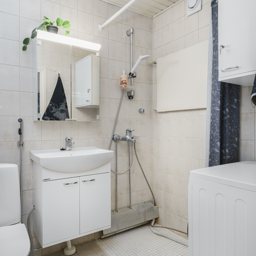 Varusteet: suihku, pesukoneliitäntä, allaskaappi, peilikaappi