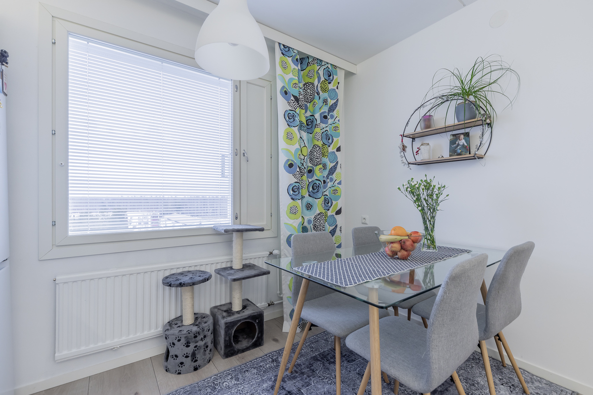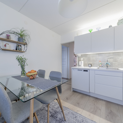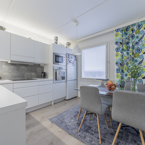 Keittiö remontoitu 2017, jääkaappipakastin, induktioliesitaso, erillisuuni, liesituuletin, mikroaaltouuni, astianpesukona, seinillä maali, laminaattilattia