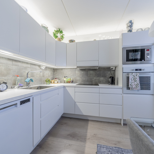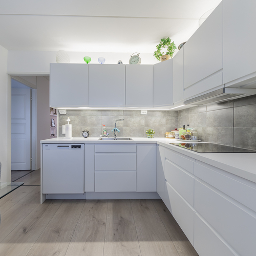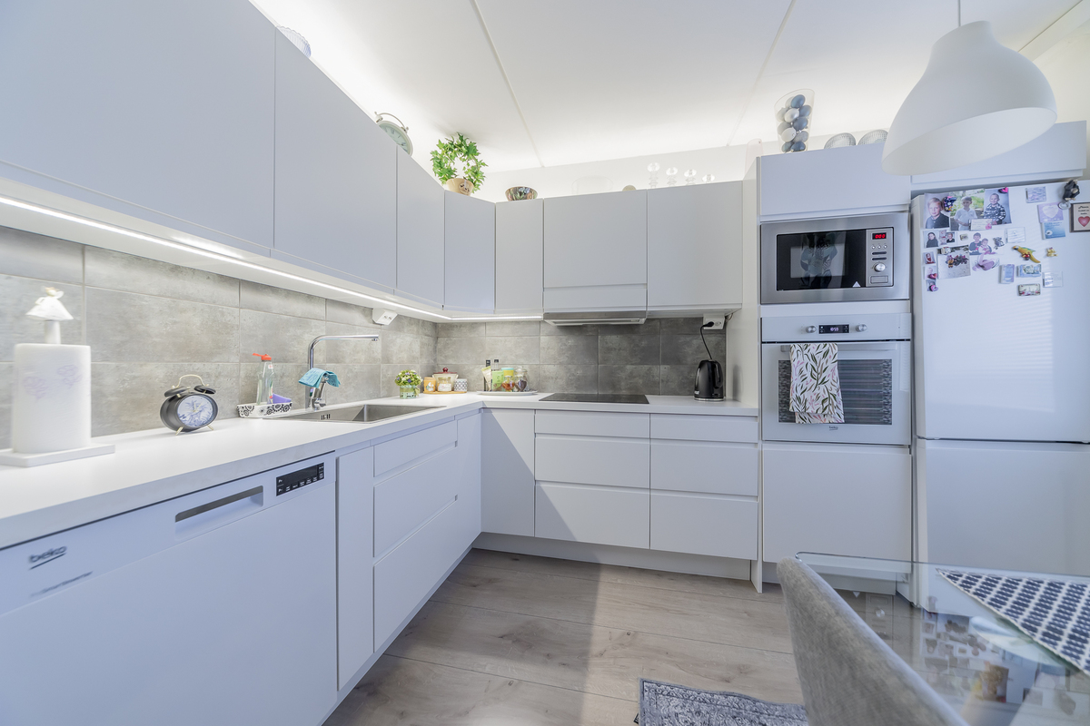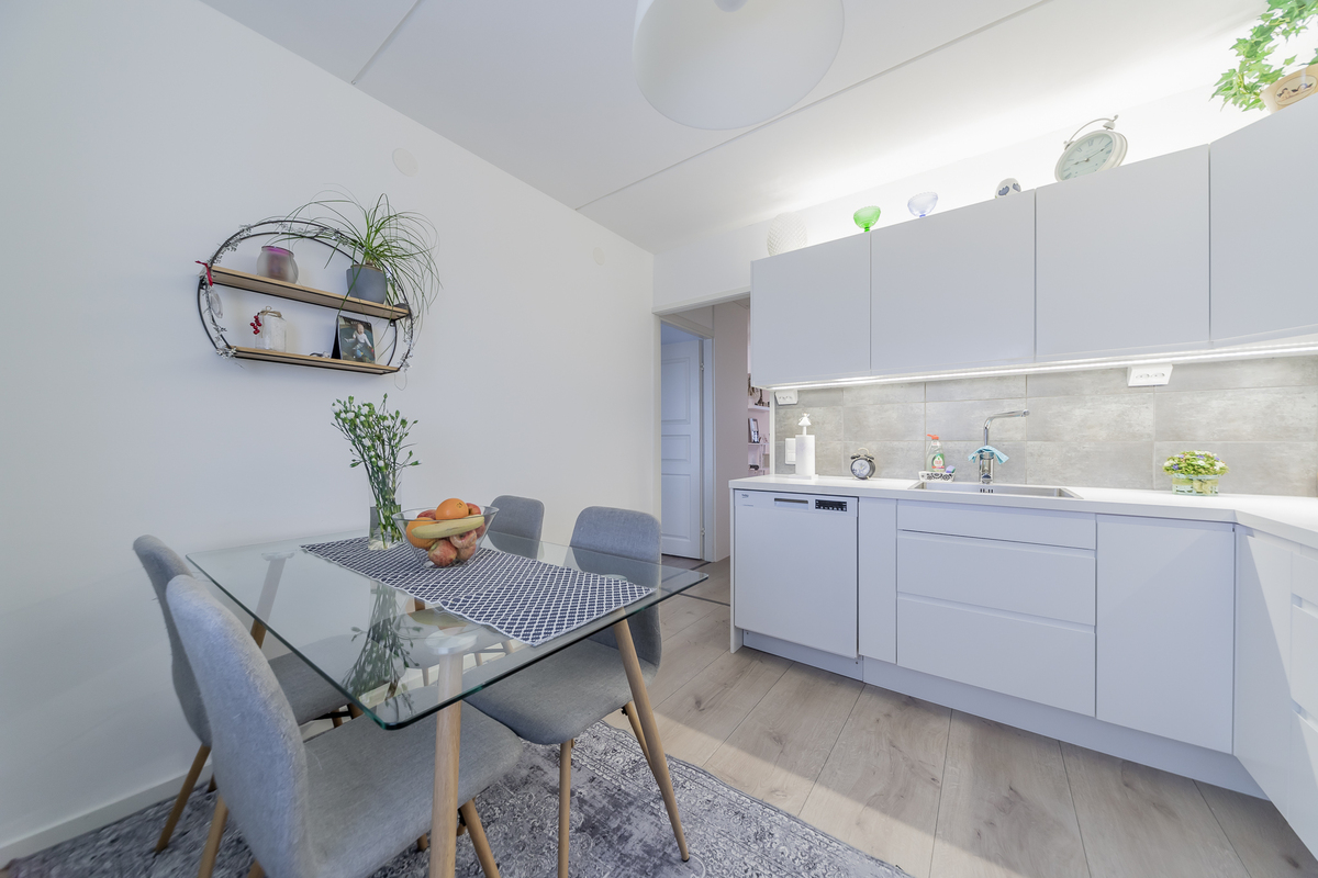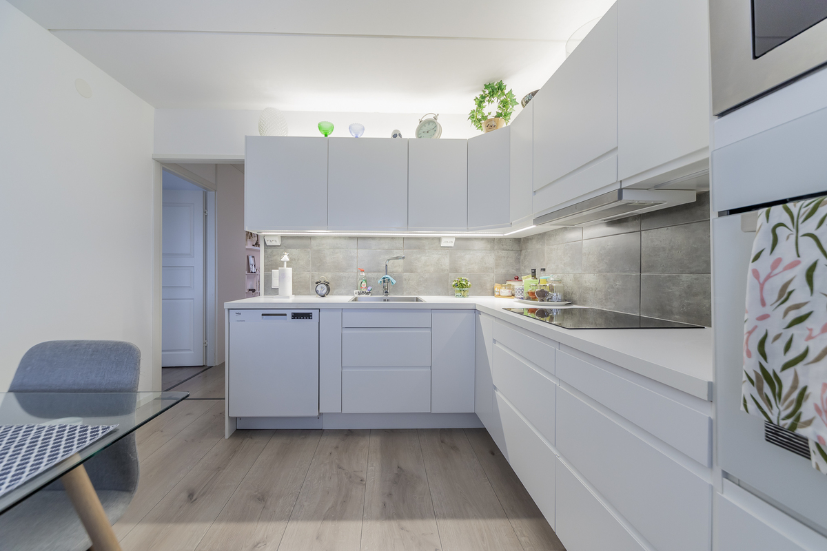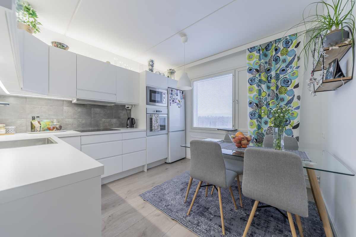 Upea vuonna 2017 remontoitu vaalea keittiö, jossa paljon kaapistoa ja runsaasti työtasoa sekä reilu paikka ruokapöydälle.
