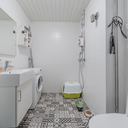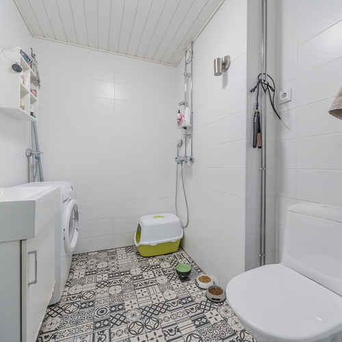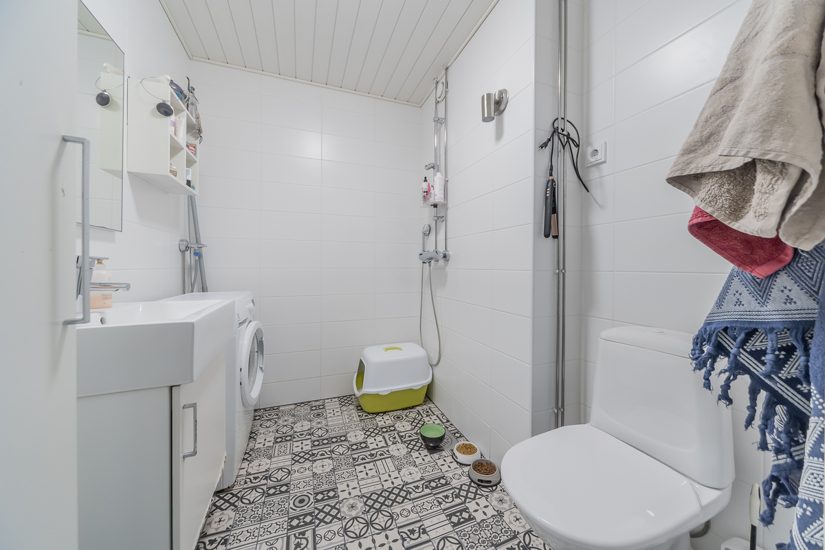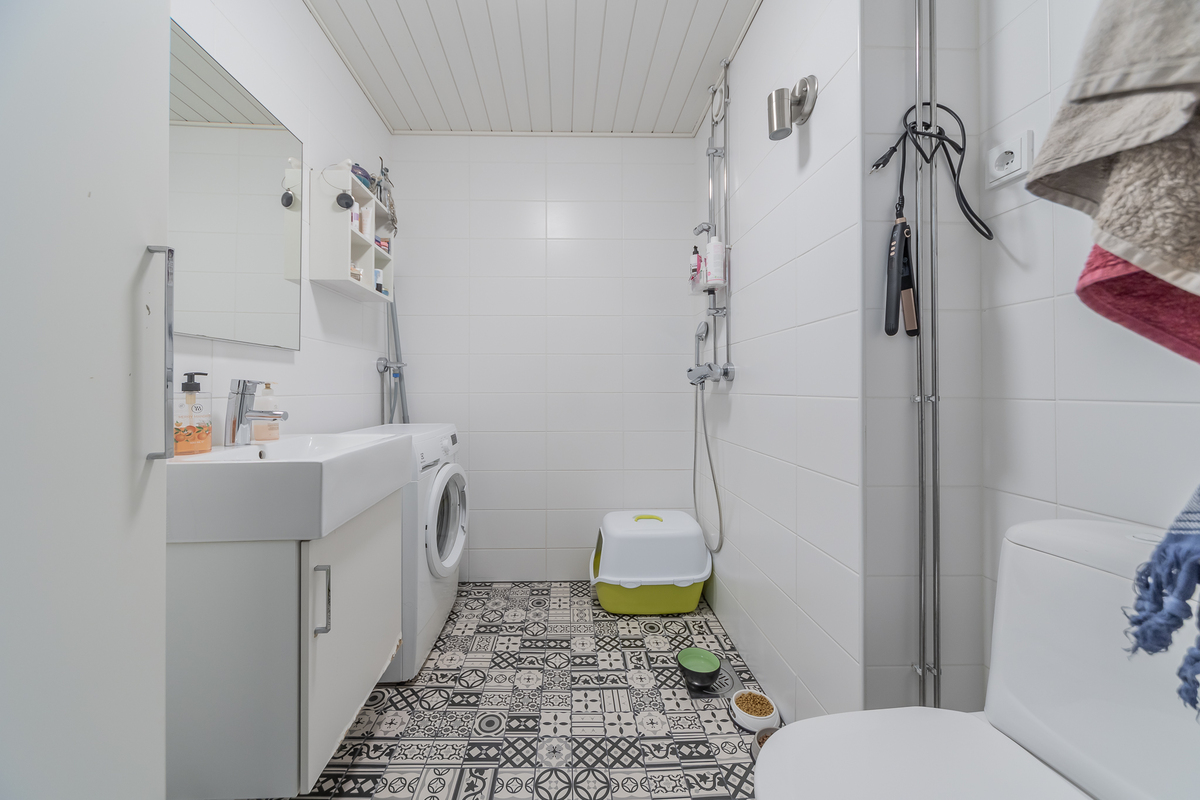 Vieressä oleva kylpyhuone on remontoitu myös 2017 ja se tarjoaakin nyt tasokkaan kylpyhetken, kylpyhuoneen yhteydessä on myös wc sekä paikka pyykinpesukoneelle.