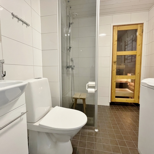Sauna Asunnossa on sauna Sähkölämmitteinen kiuas, ikkuna, seinillä paneeli, laattalattia