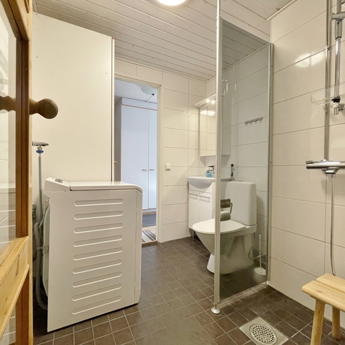 Kylpyhuoneen kuvaus Laatoitus, suihkuseinä, suihku, pesukoneliitäntä, allas, allaskaappi, peilikaappi, wc-istuin