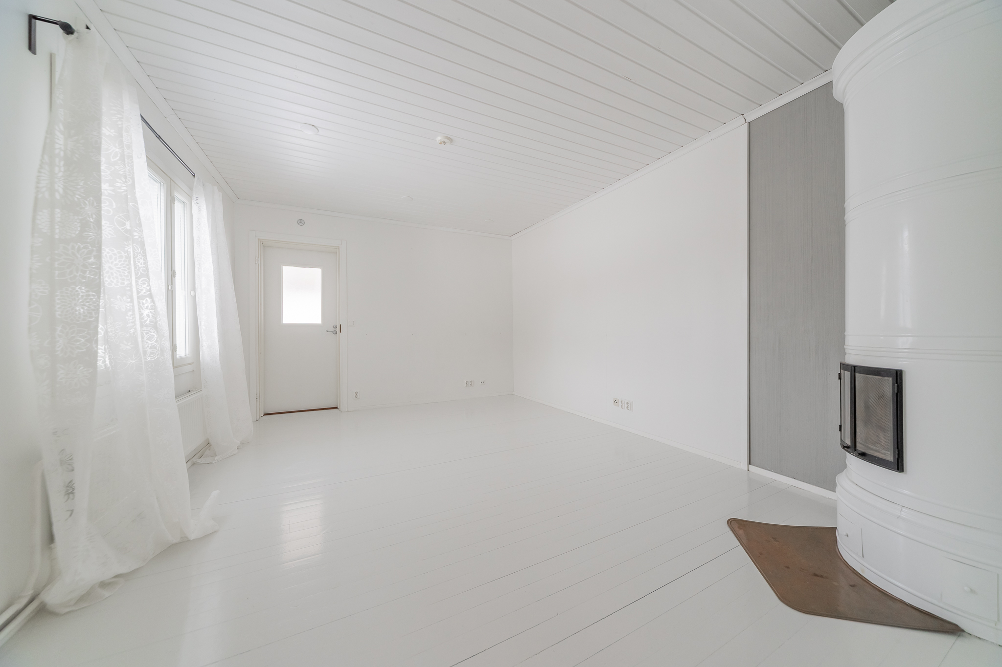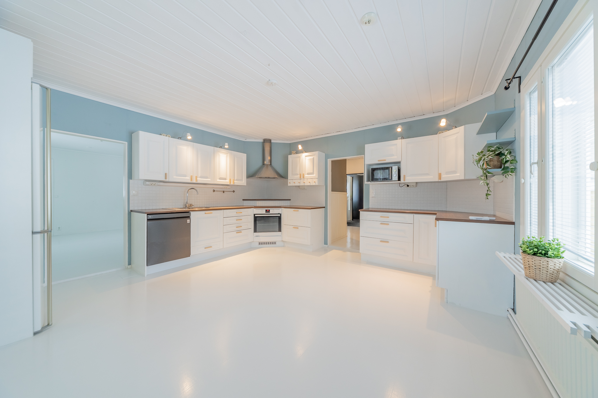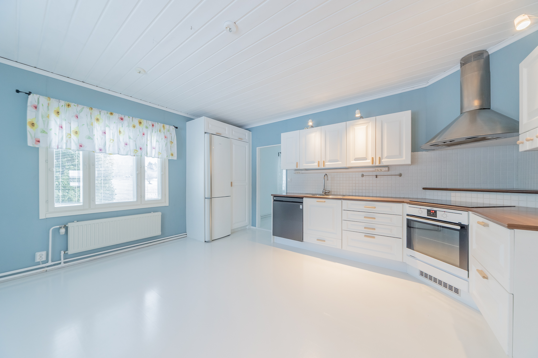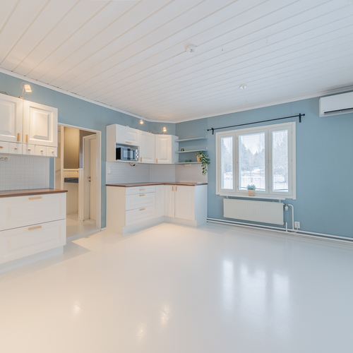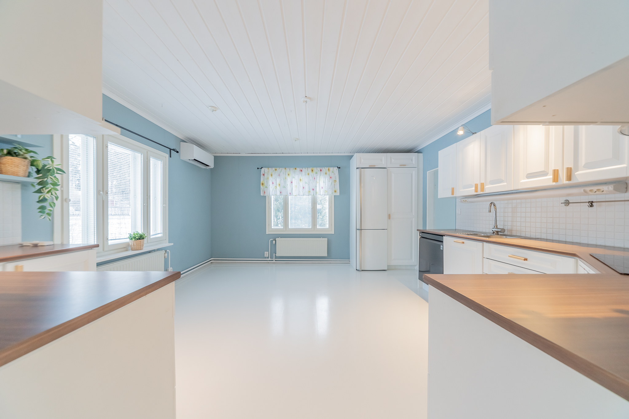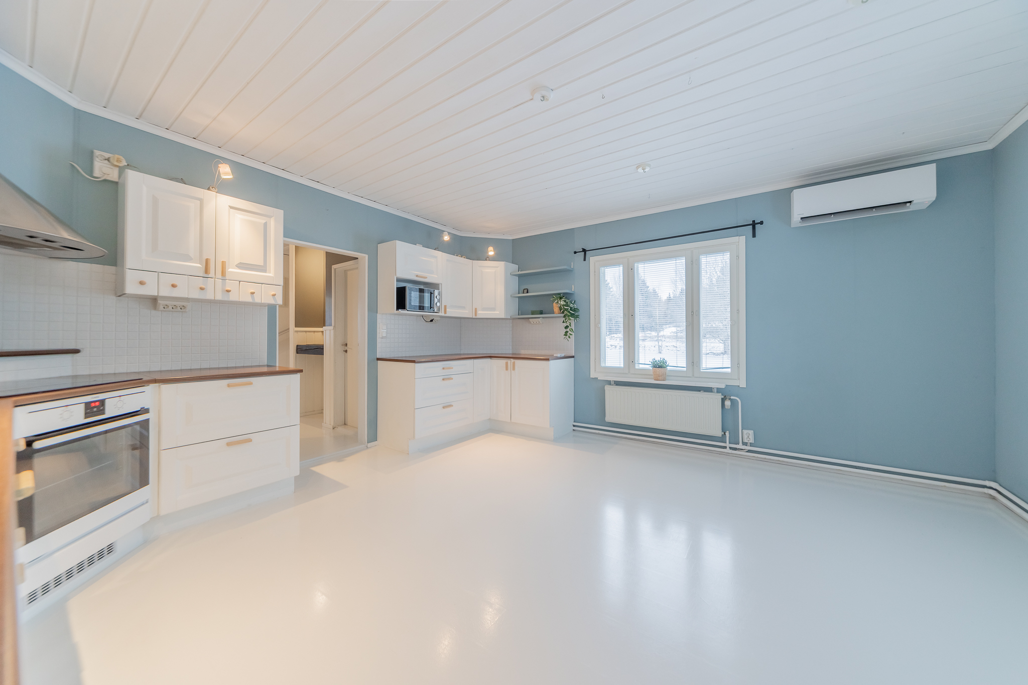 Iso valoisa keittiö, jossa tasokkaat kodinkoneet, paikka isolle ruokapöydälle ja seinälle asennettu ilmalämpöpumppu. Keittiön vieressä kauniilla pönttöuunilla varustettu olohuone, josta pääsee pujahtamaan piha-alueelle.
