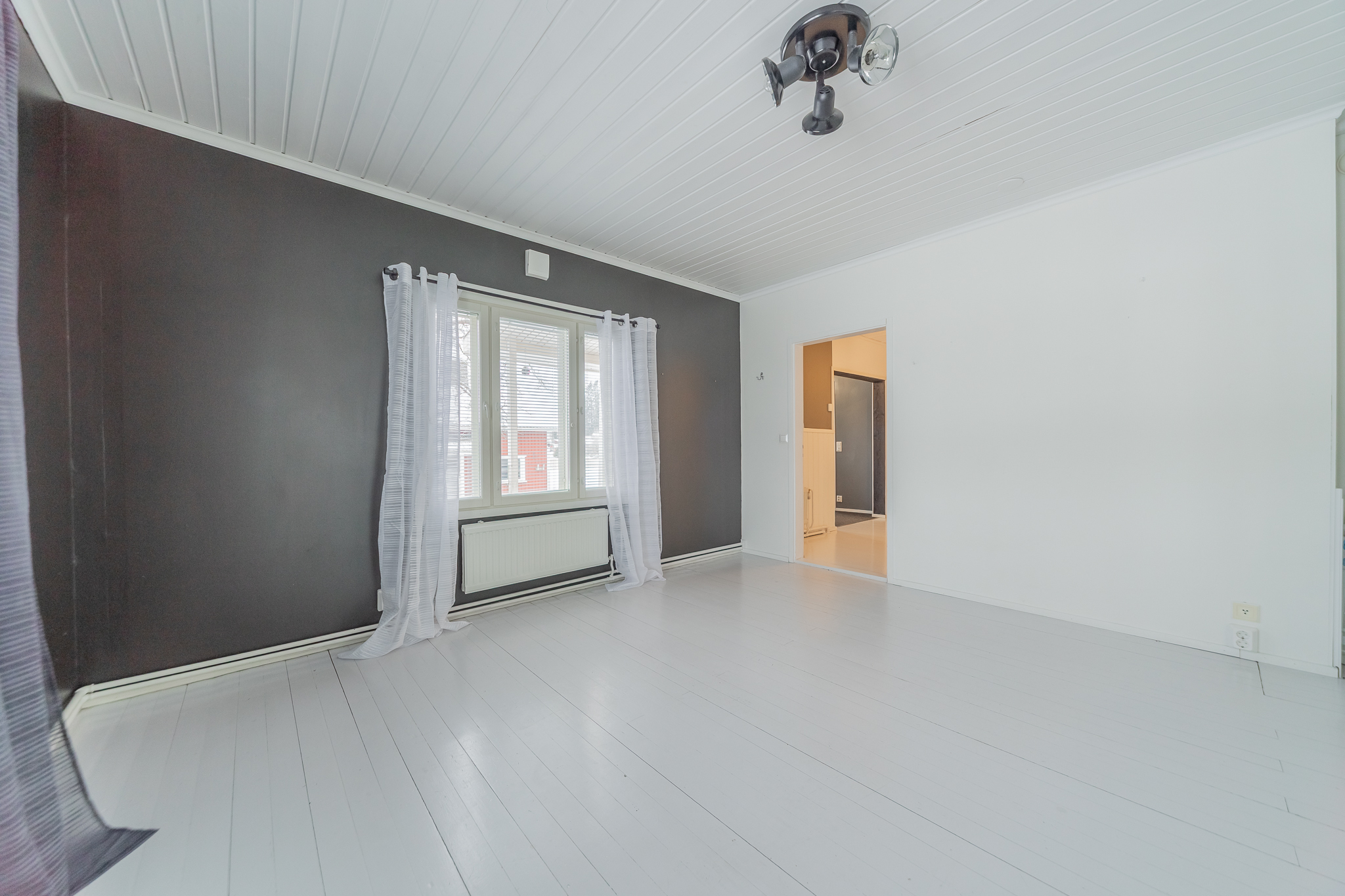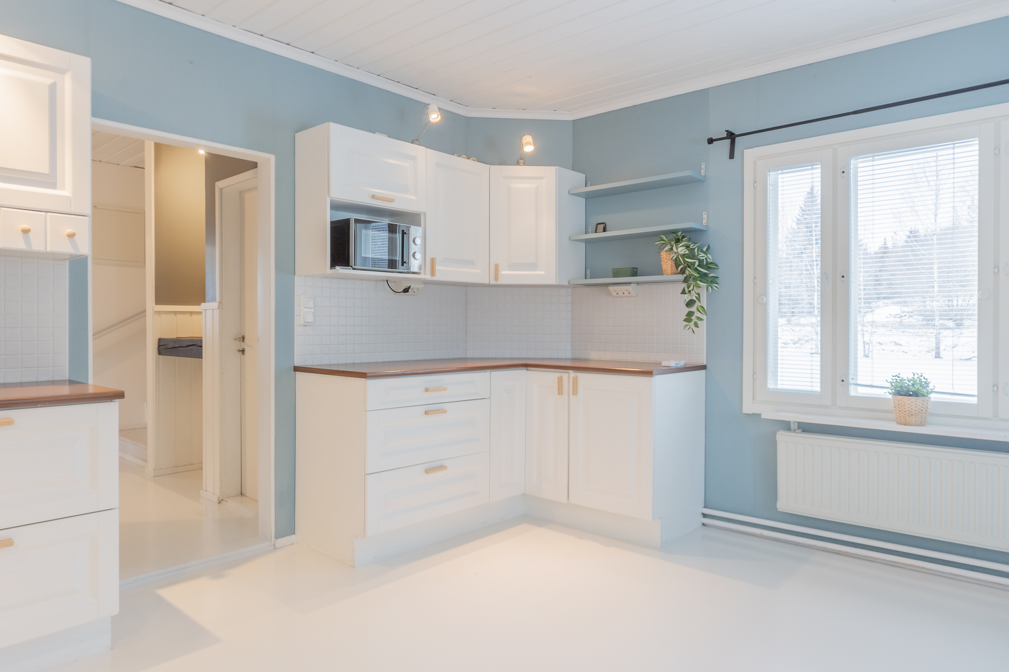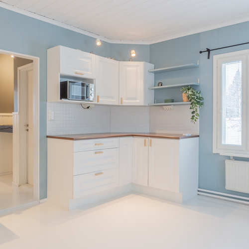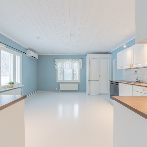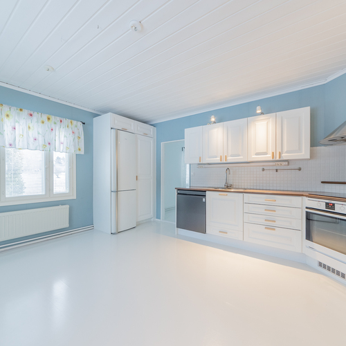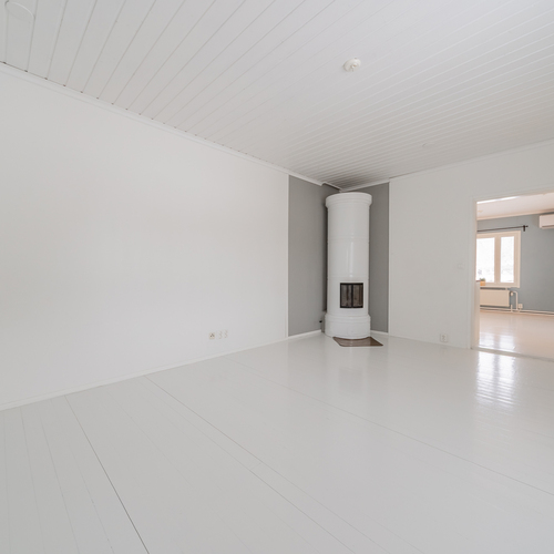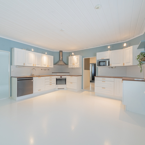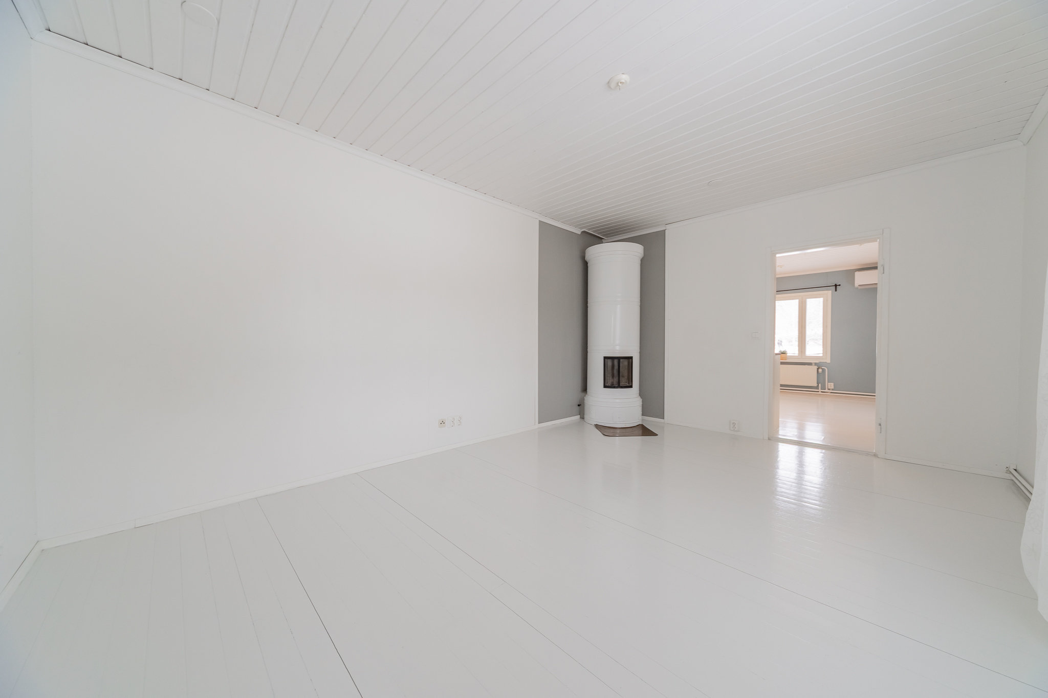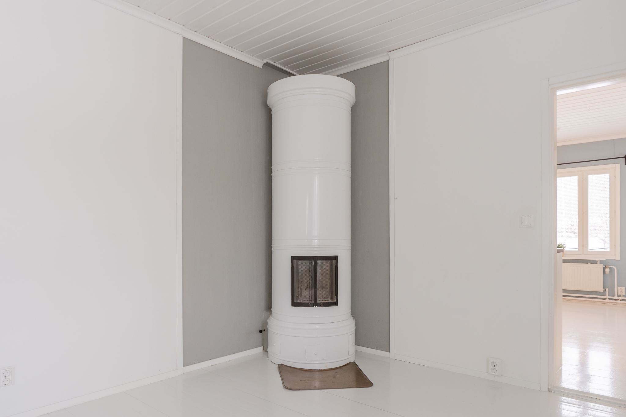 Iso valoisa keittiö, jossa tasokkaat kodinkoneet, paikka isolle ruokapöydälle ja seinälle asennettu ilmalämpöpumppu. Keittiön vieressä kauniilla pönttöuunilla varustettu olohuone, josta pääsee pujahtamaan piha-alueelle.