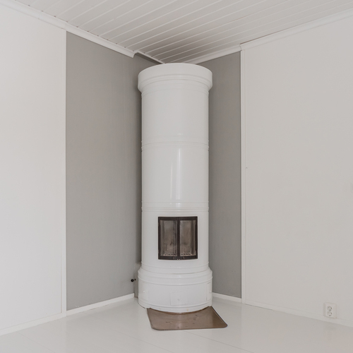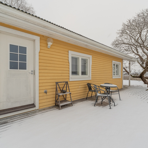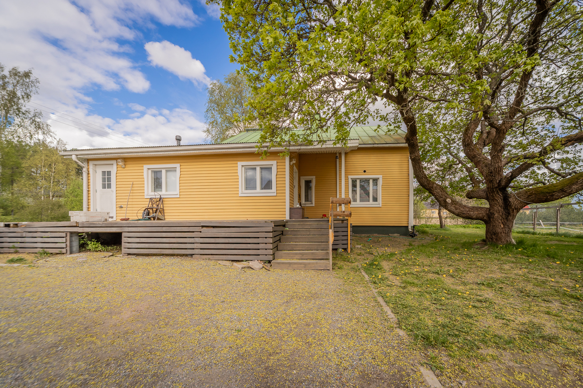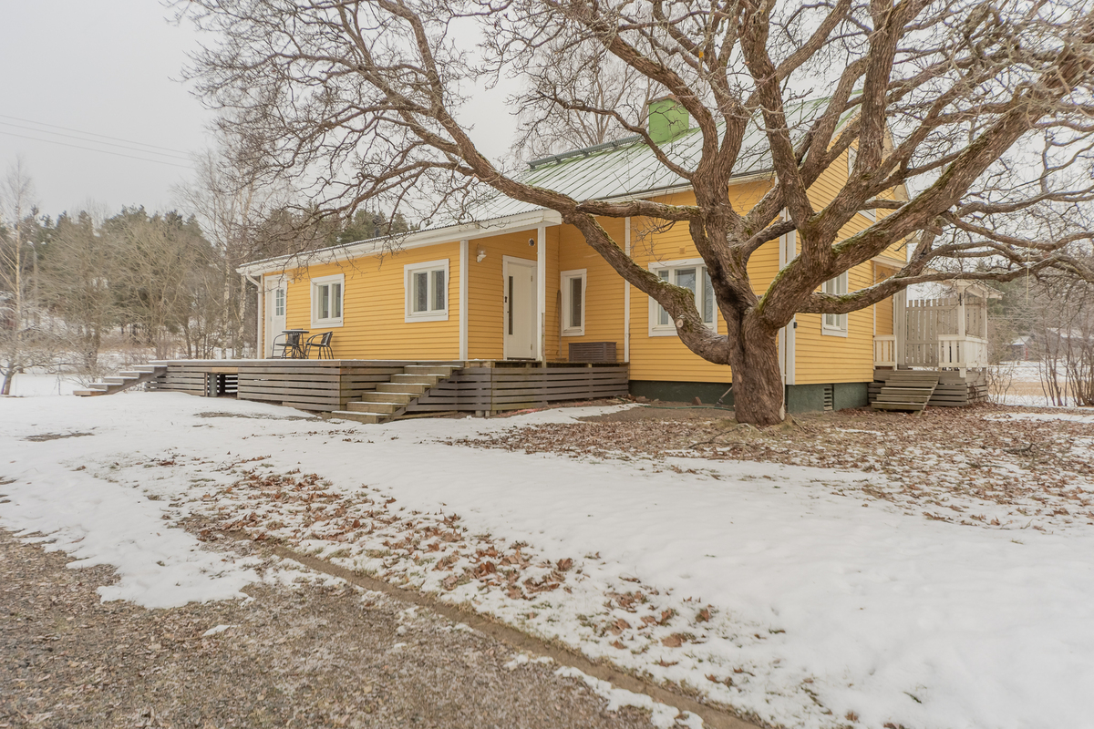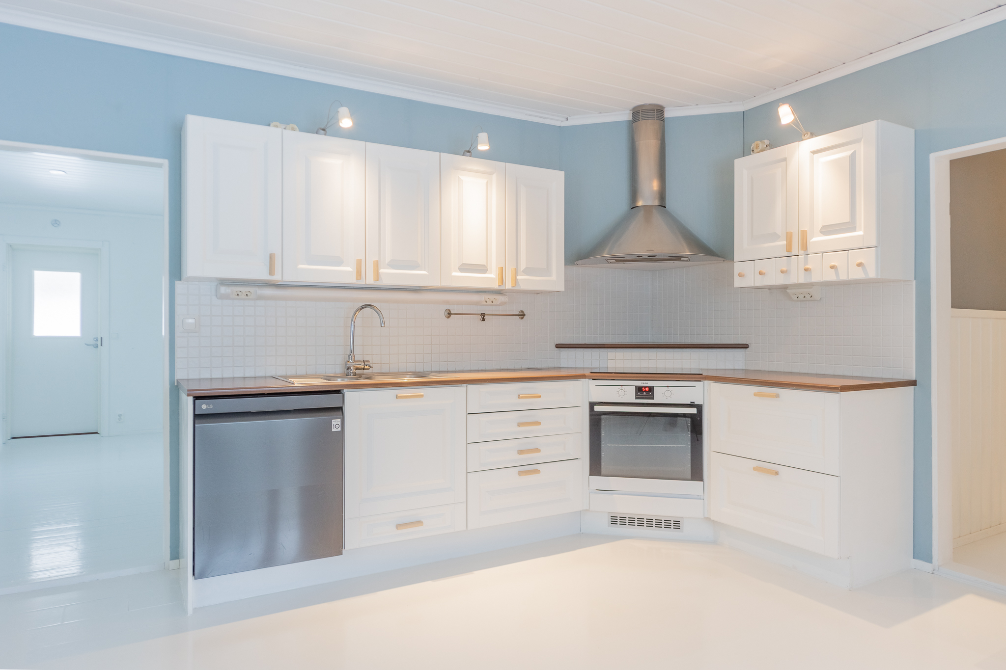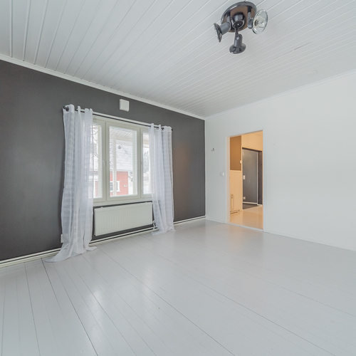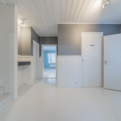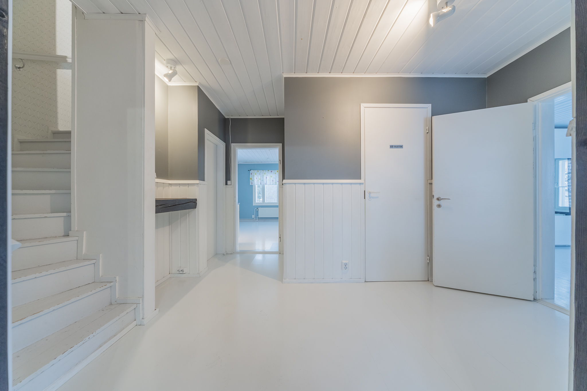 Iso valoisa keittiö, jossa tasokkaat kodinkoneet, paikka isolle ruokapöydälle ja seinälle asennettu ilmalämpöpumppu. Keittiön vieressä kauniilla pönttöuunilla varustettu olohuone, josta pääsee pujahtamaan piha-alueelle.