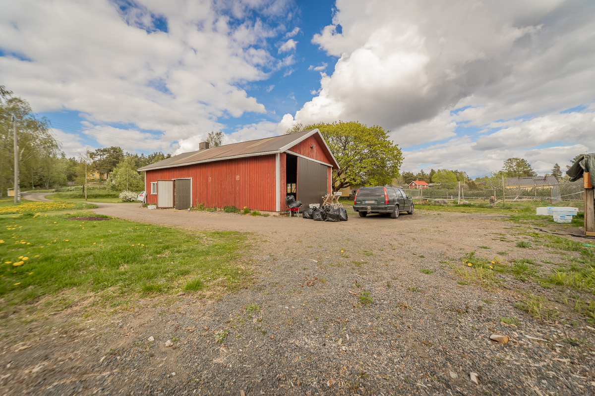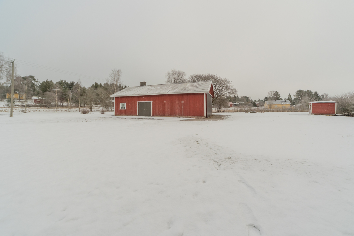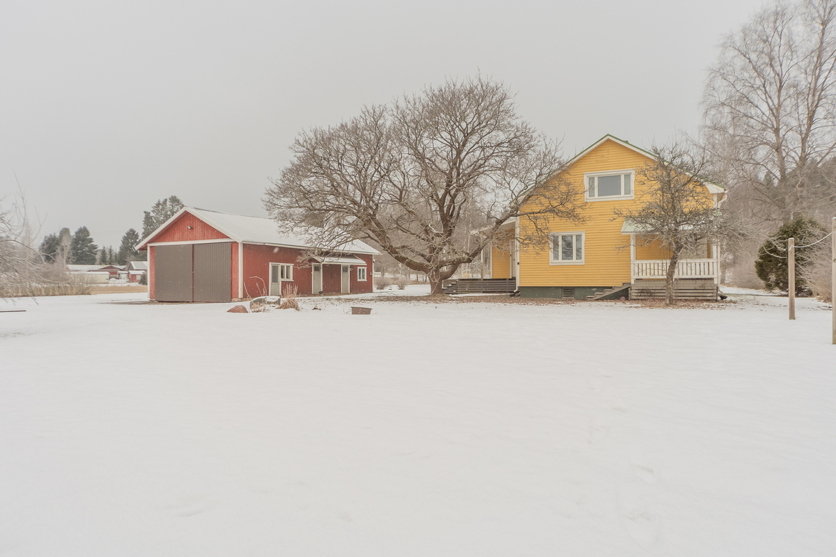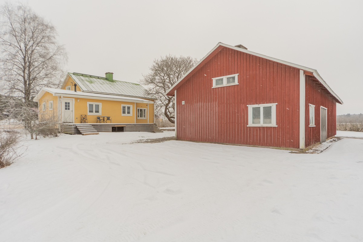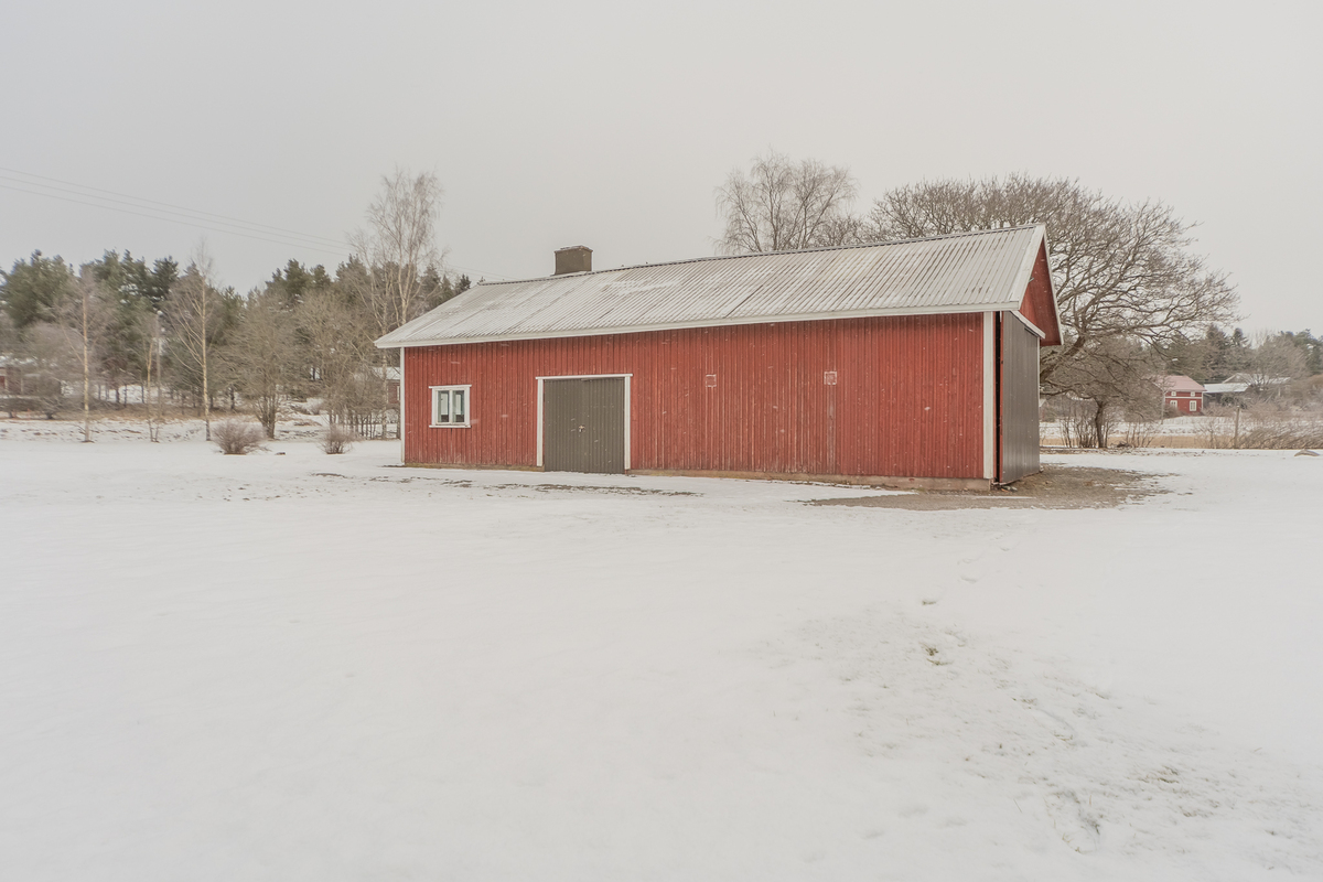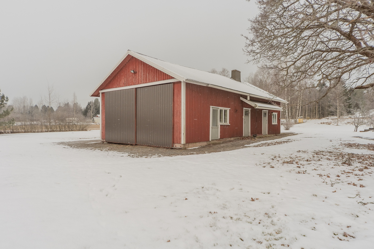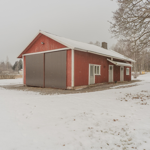 Pihassa on 70 m²:n suuruinen talousrakennus, jonka toisessa päädyssä iso autotalli, tien puoleisessa päädyssä varastotilaa.