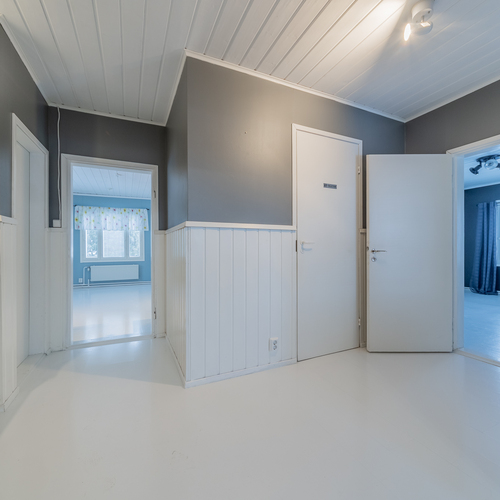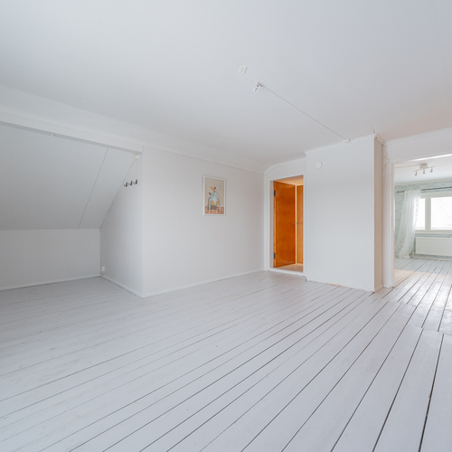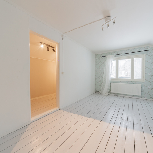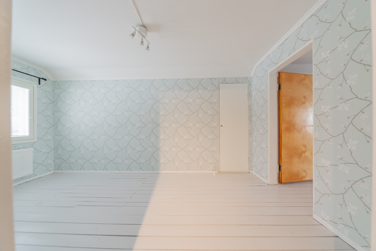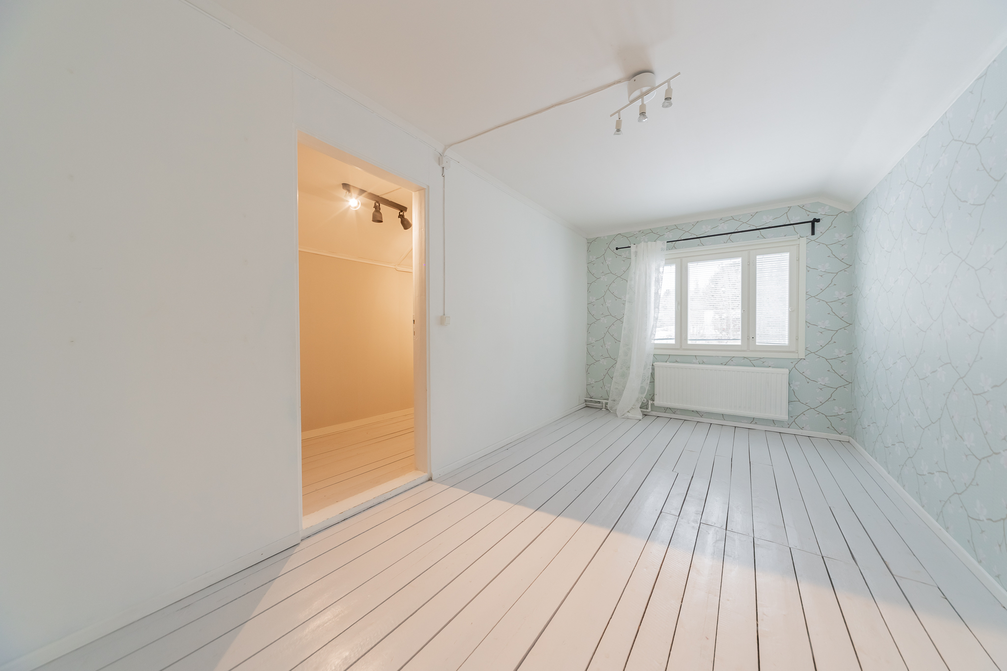 Yksi makuuhuoneista on alakerrassa, siellä liukuovikaapisto, seinillä maali, lankkulattia, yläkerrassa kaksi makuuhuonetta, seinillä tapetti, lankkulattiat