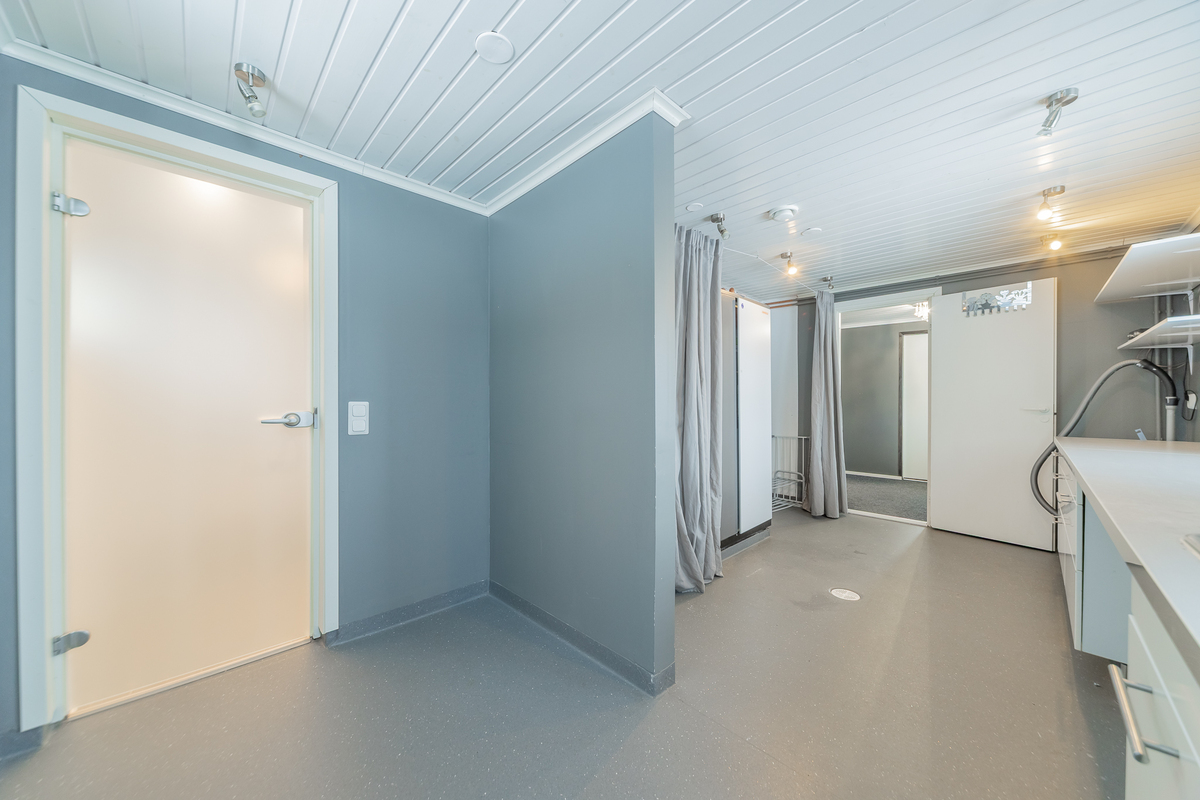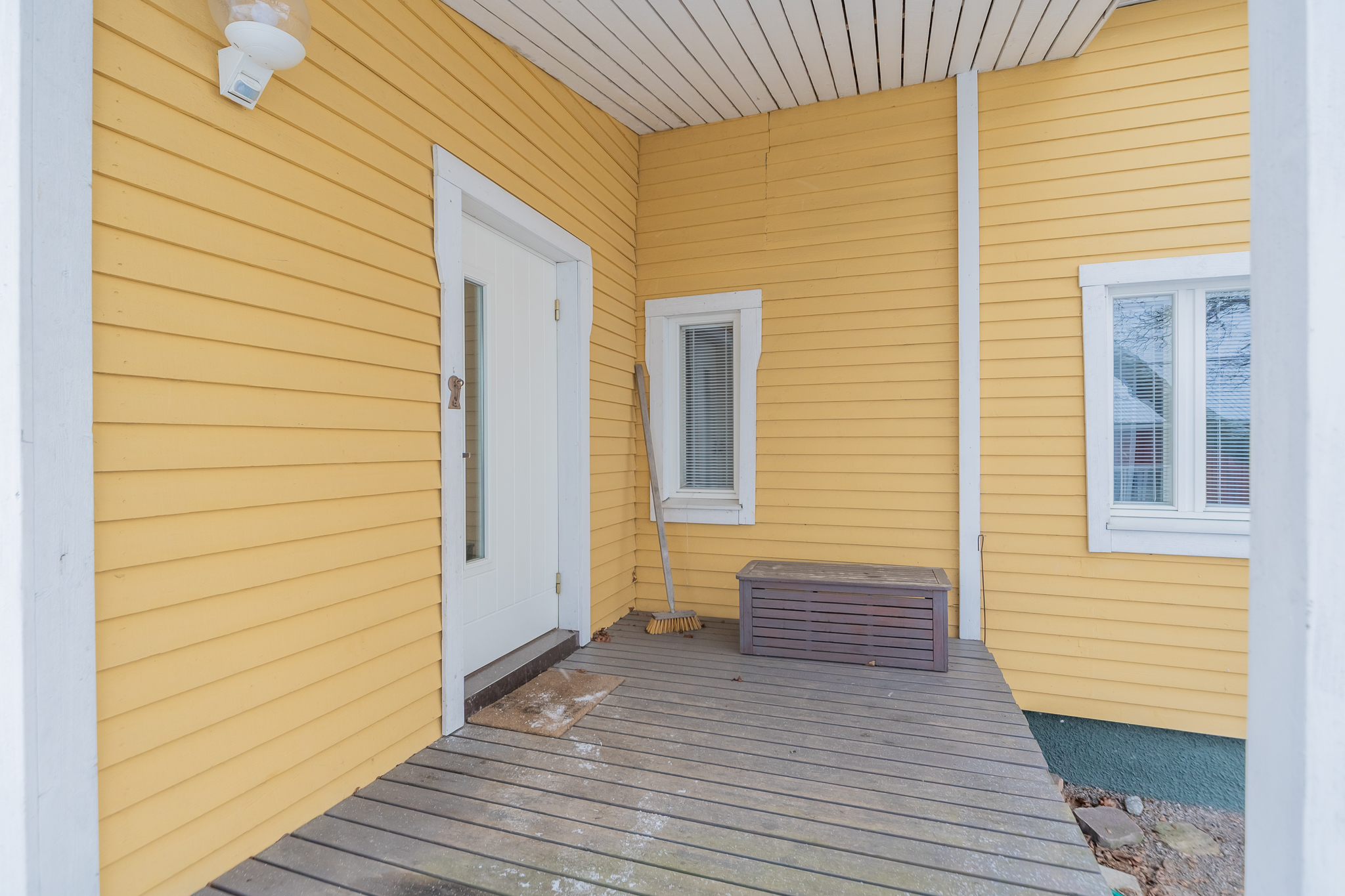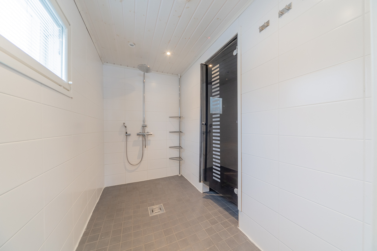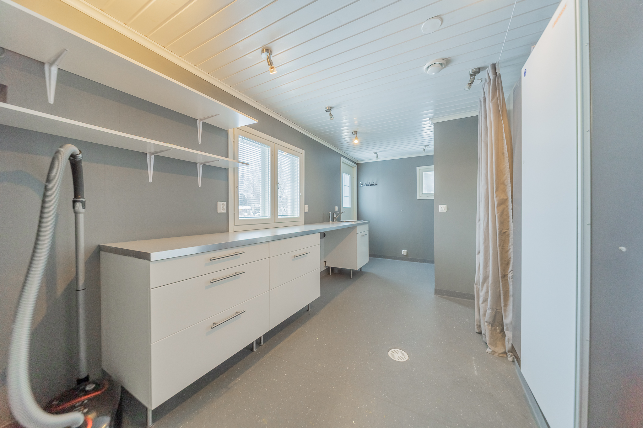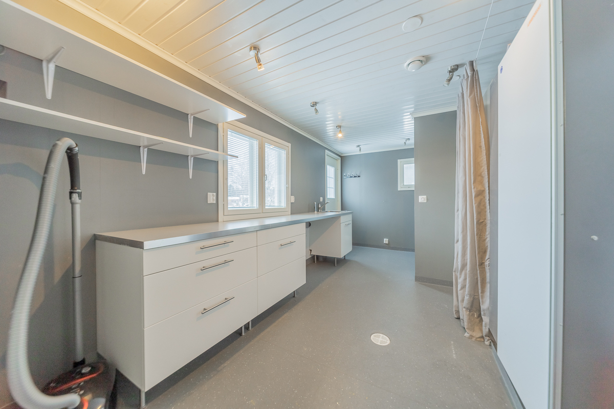 Isossa kodinhoitohuoneessa on mielekästä touhuta perheen pyykkihuollon kanssa, siellä lisäksi hyvin säilytystilaa. Kodinhoitohuoneesta käynti terassille. Hyväkuntoinen kylpyhuone tarjoaa laadukkaan kylpyhetken ja sauna muhevat löylyt. Eteistilassa on kalustettu wc.