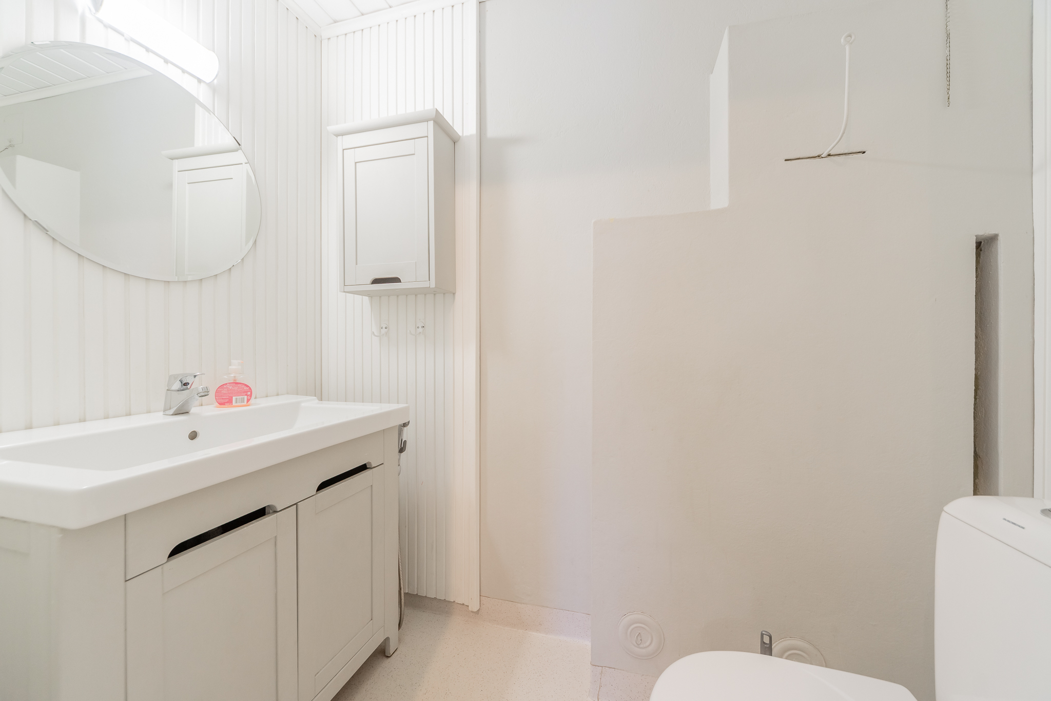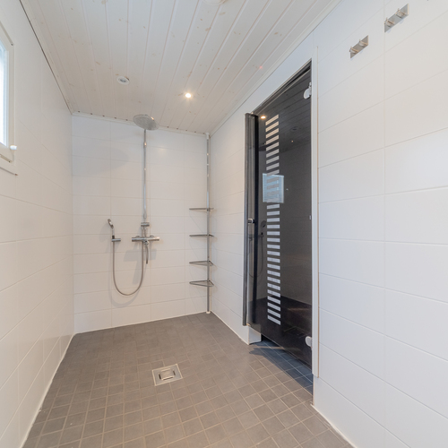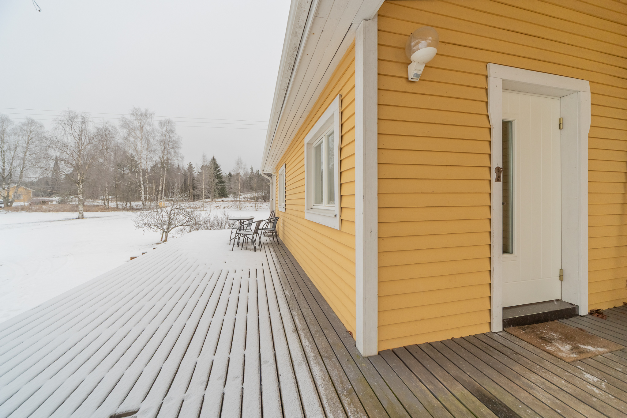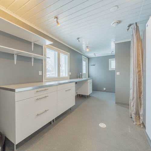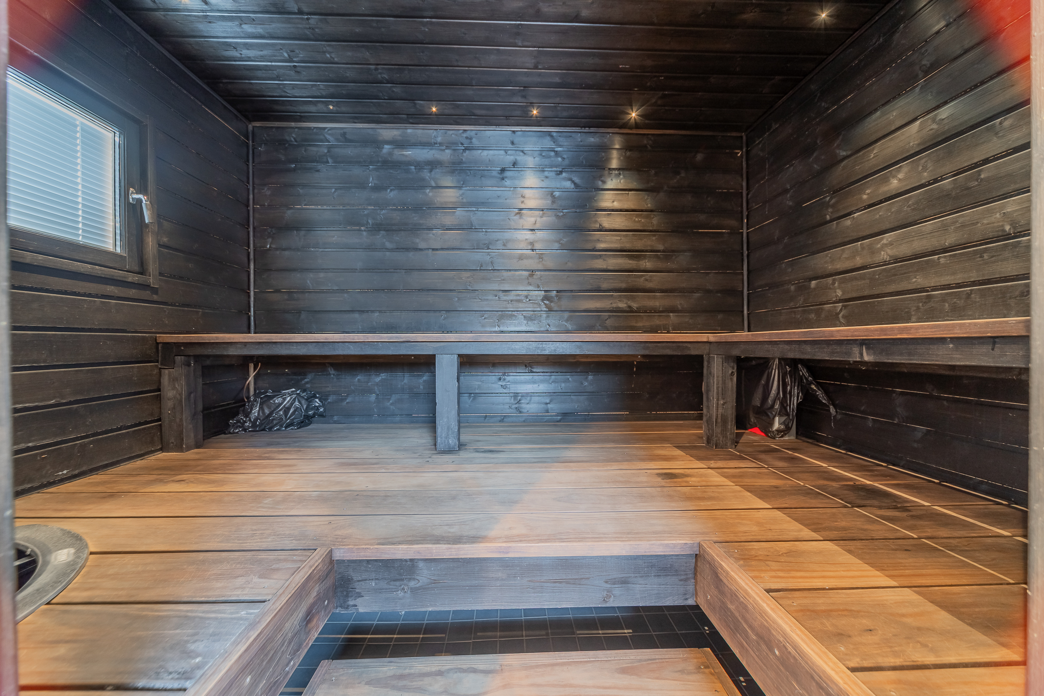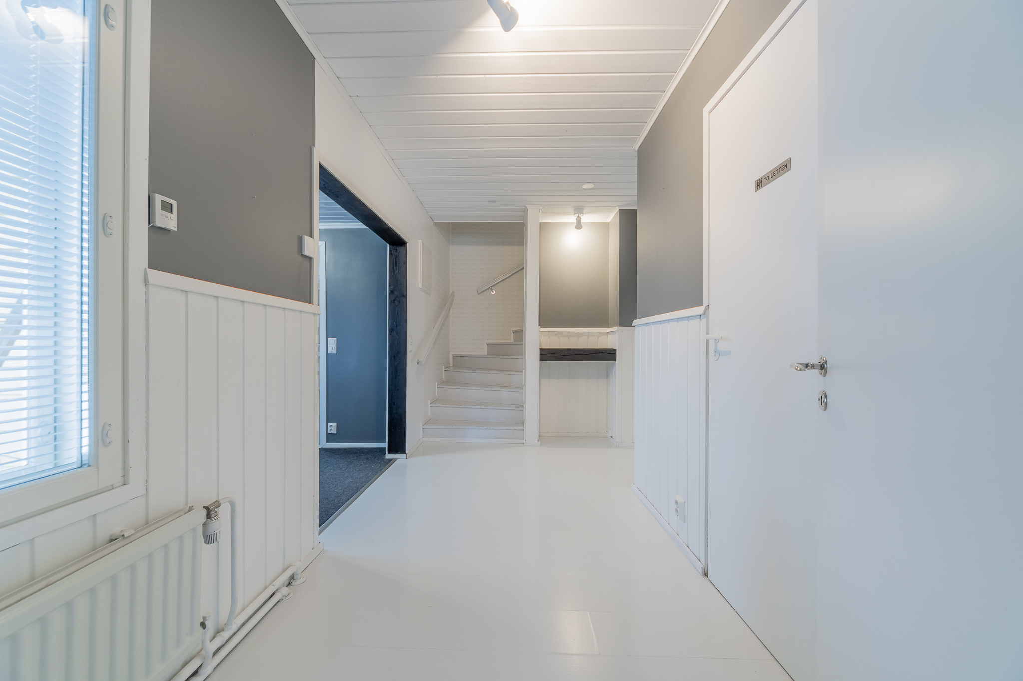 Isossa kodinhoitohuoneessa on mielekästä touhuta perheen pyykkihuollon kanssa, siellä lisäksi hyvin säilytystilaa. Kodinhoitohuoneesta käynti terassille. Hyväkuntoinen kylpyhuone tarjoaa laadukkaan kylpyhetken ja sauna muhevat löylyt. Eteistilassa on kalustettu wc.