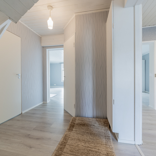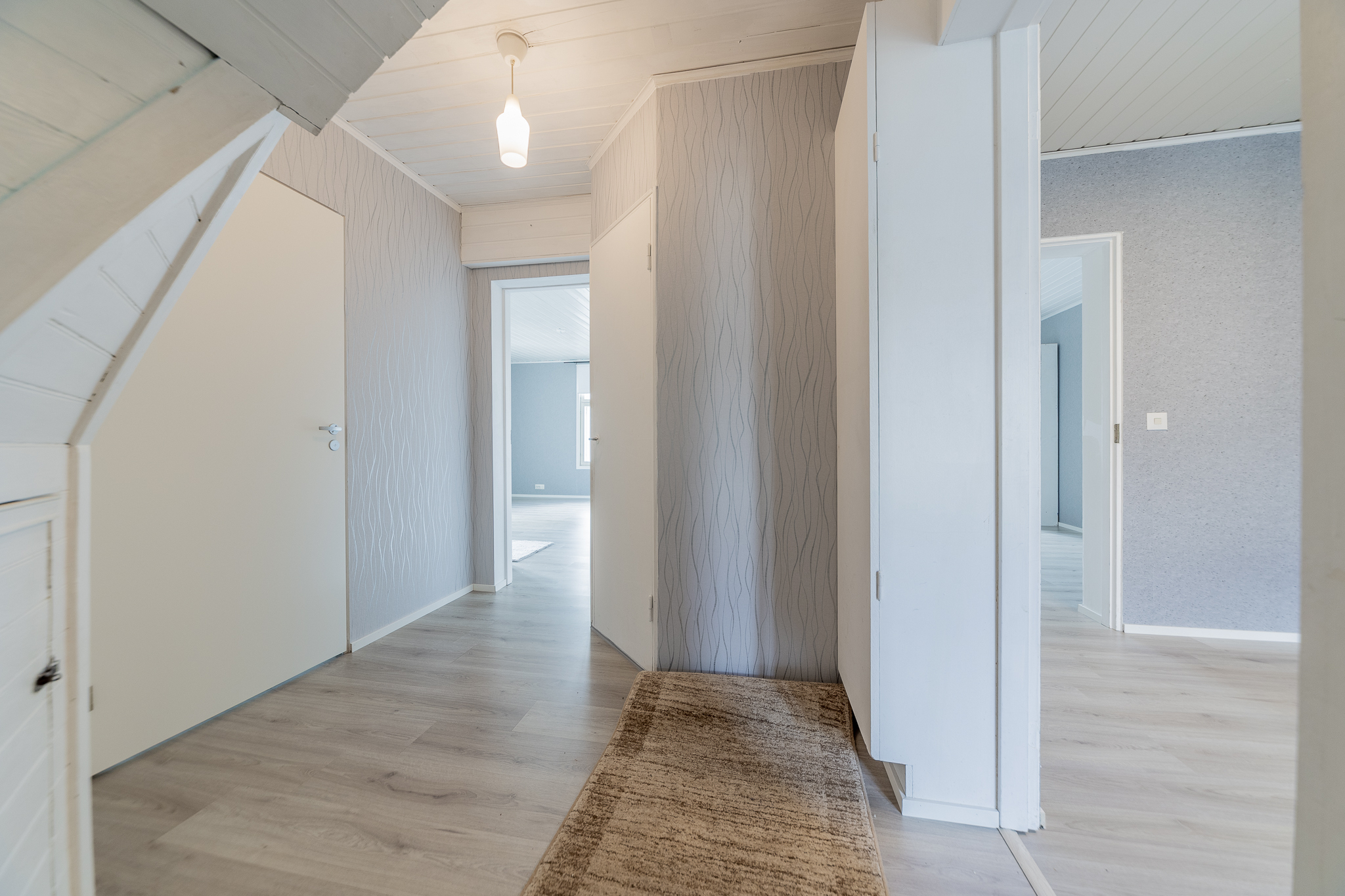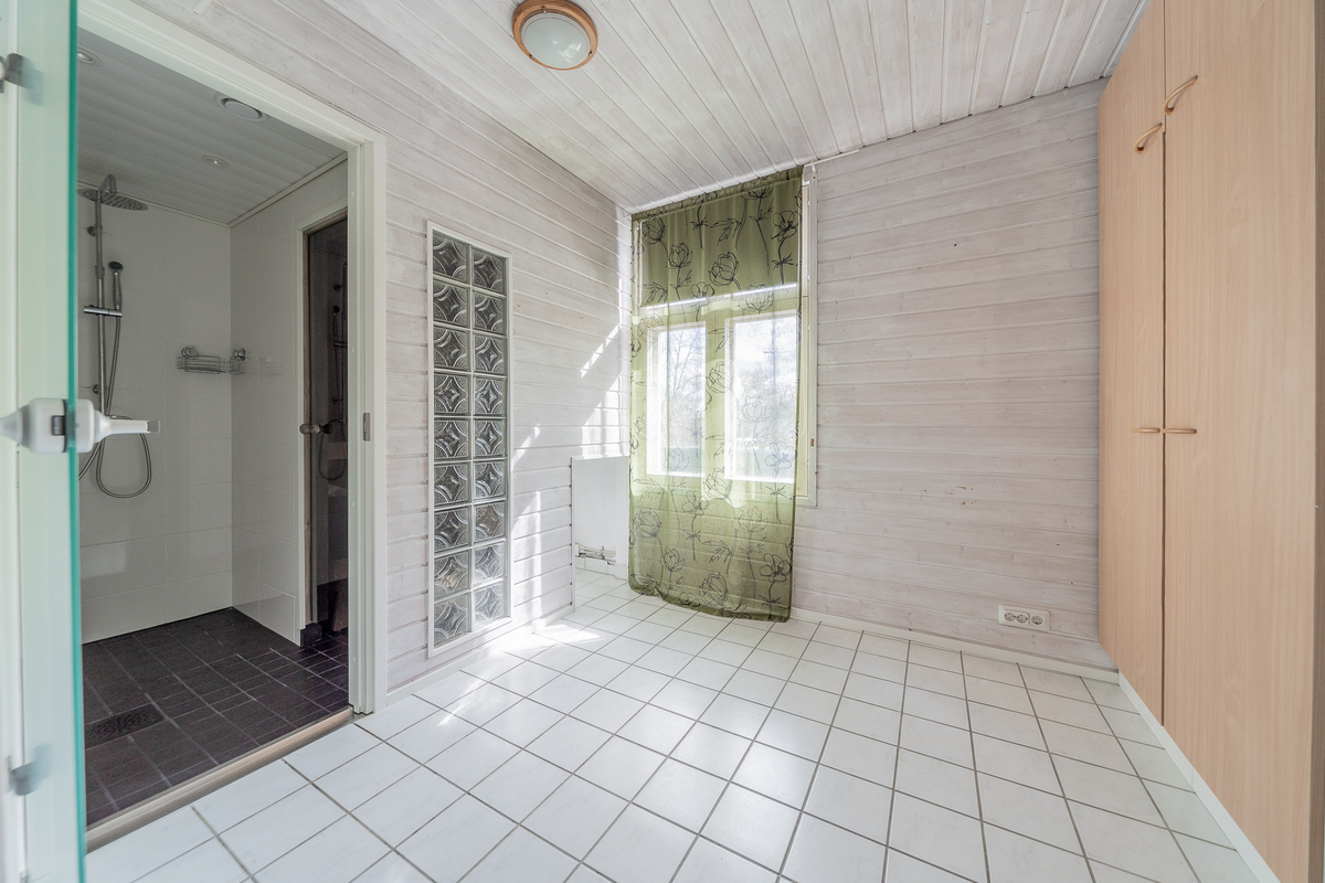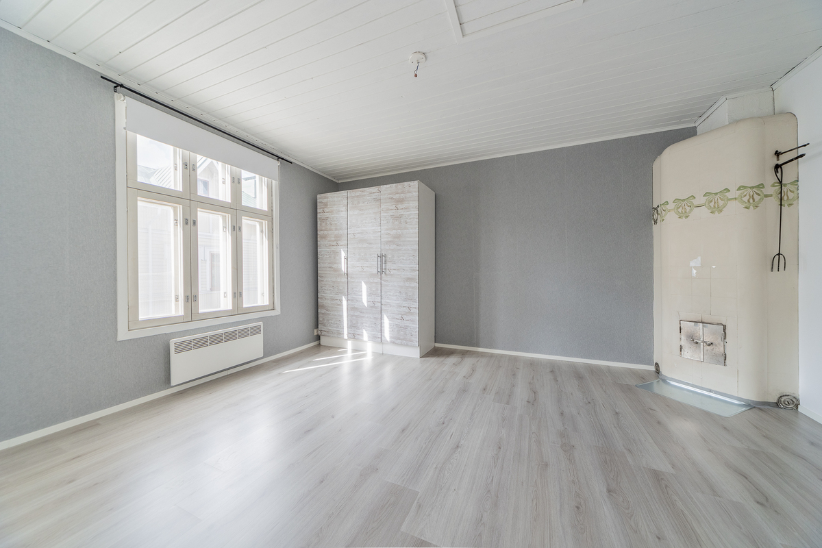 Alakerran makuuhuoneessa kaunis kaakelitakka, seinillä tapetti, laminaattilattia, yläkerran makuuhuoneen yhteydessä vaatehuone, maalatut seinät, laminaattilattia