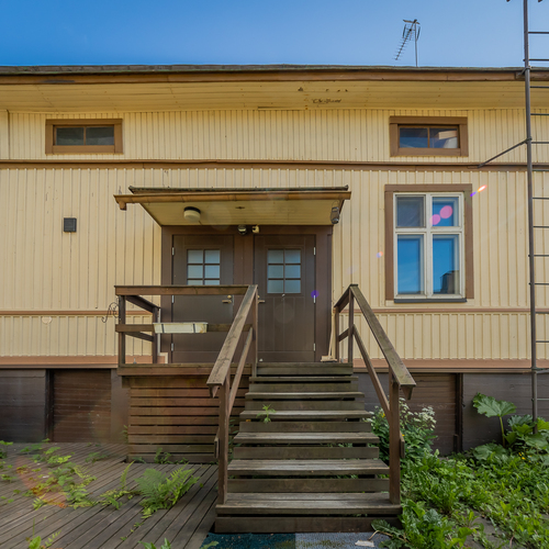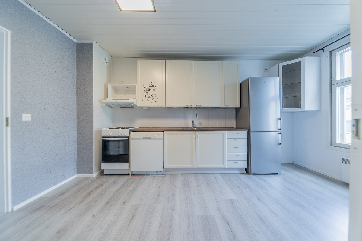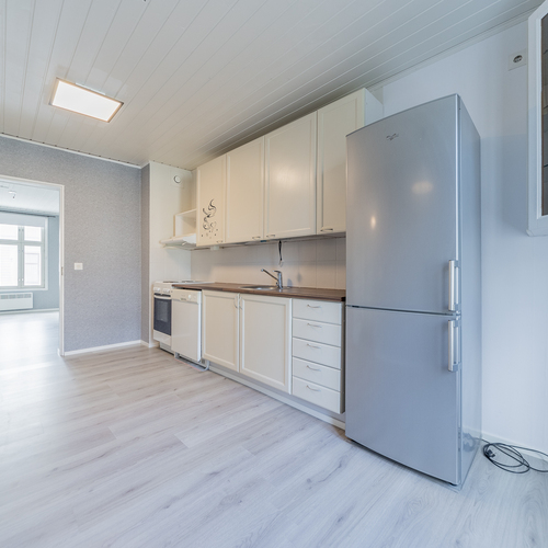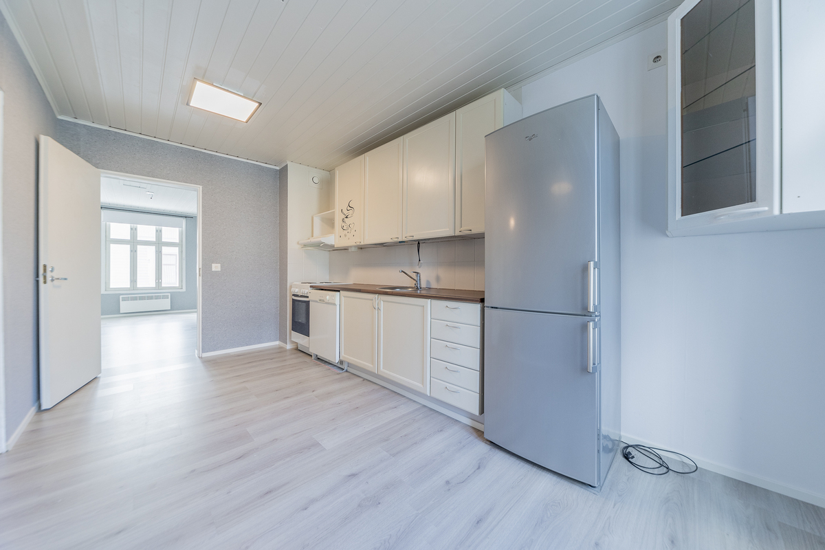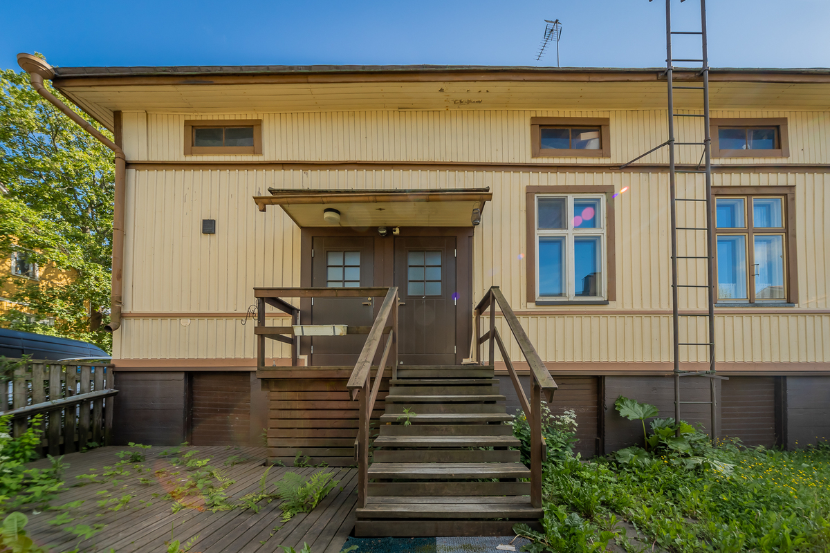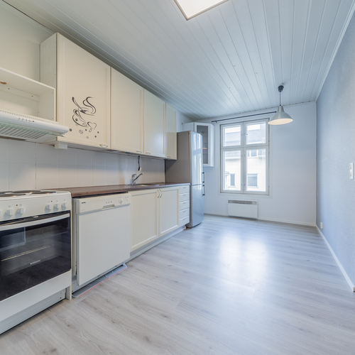 Asunto on hetki sitten remontoitu ja kylpyhuone-saunaosasto uusittu kokonaan. Asunnon tilava keittiö sijoittuu pihan puolelle, samoin sauna- ja pesutilat.