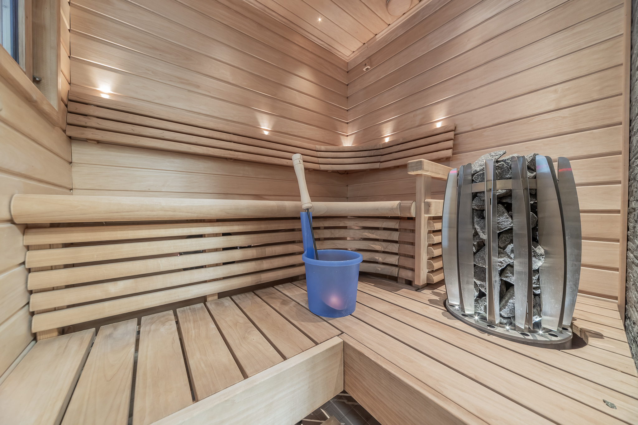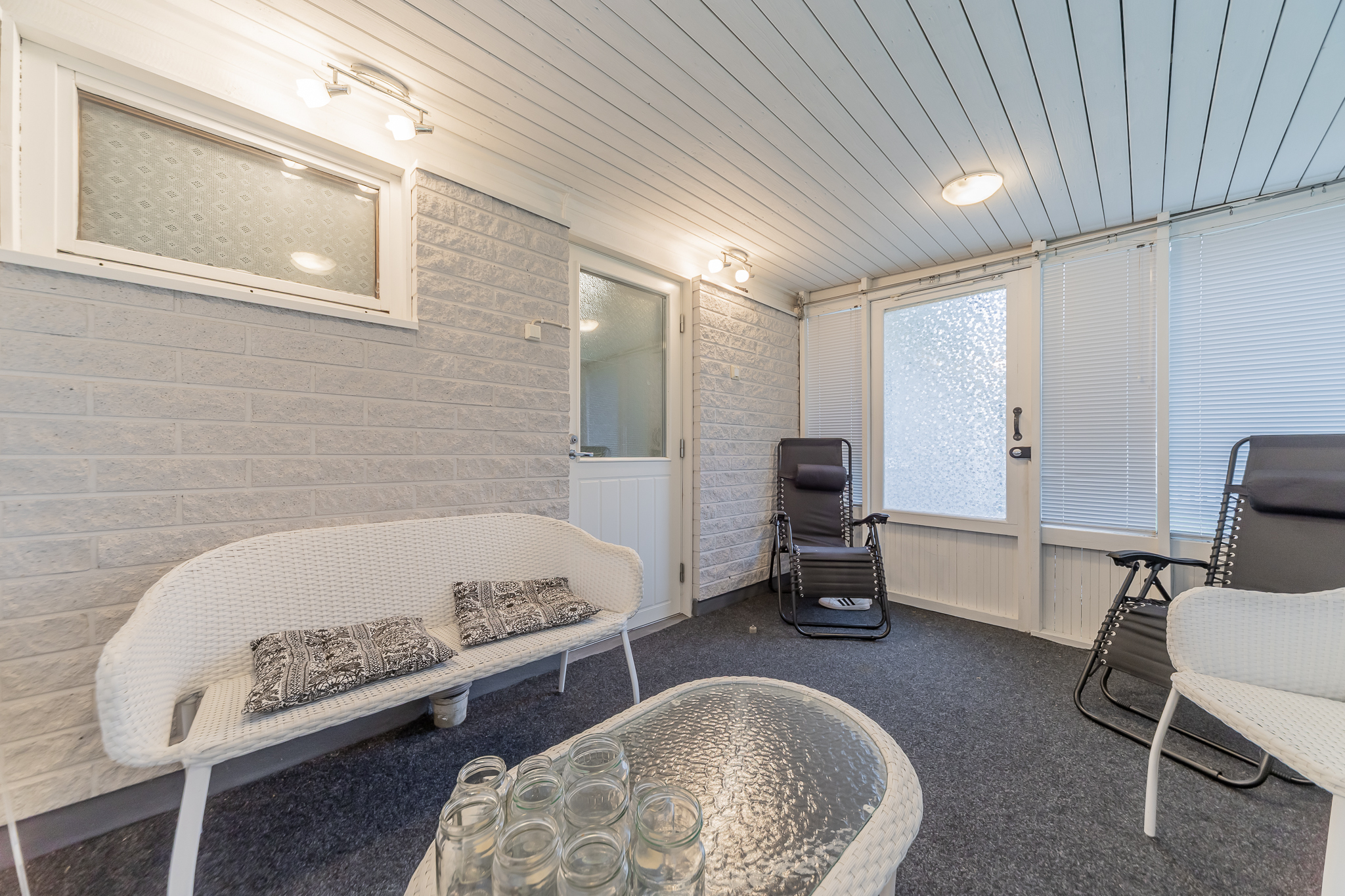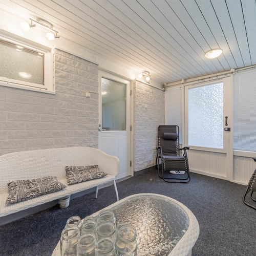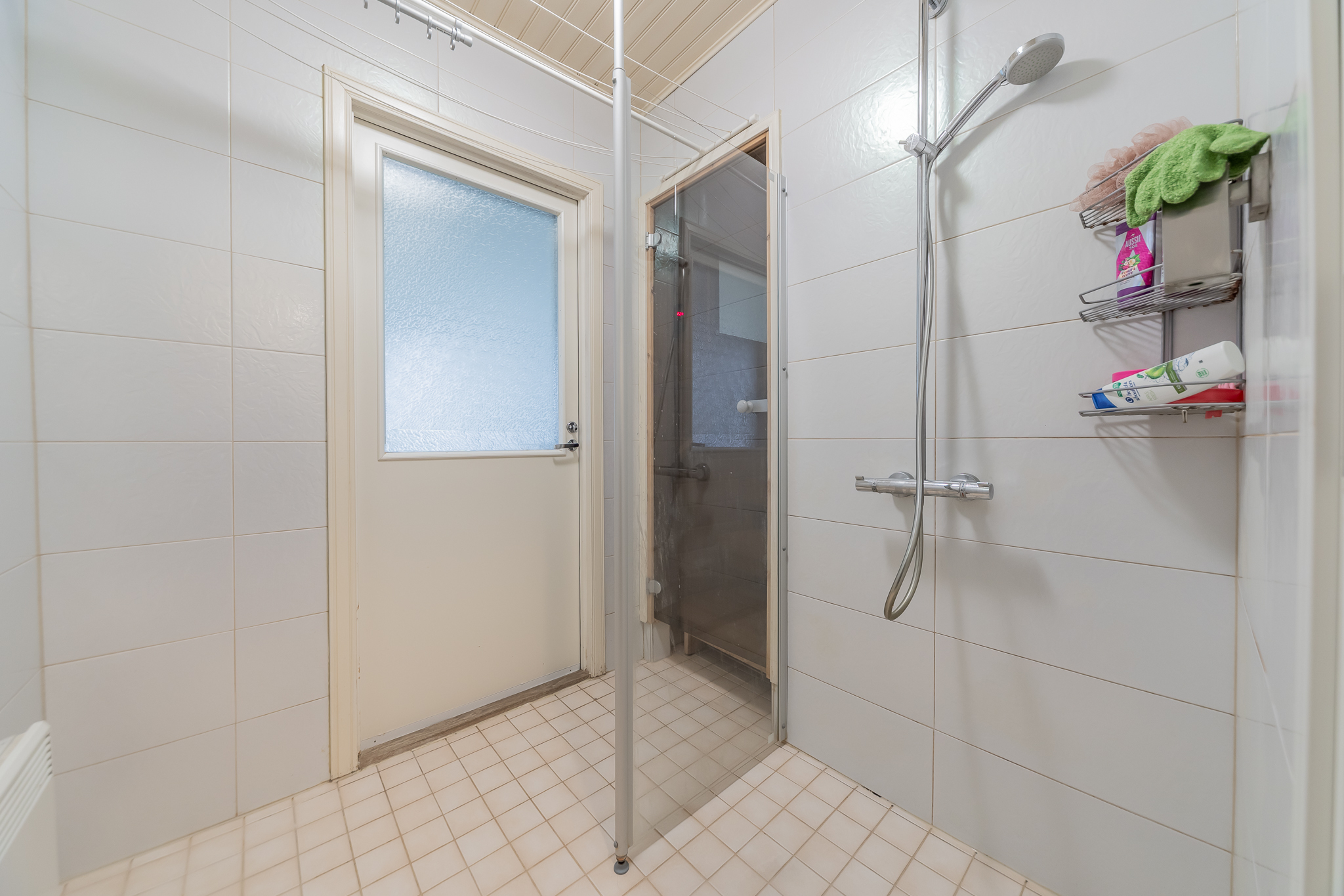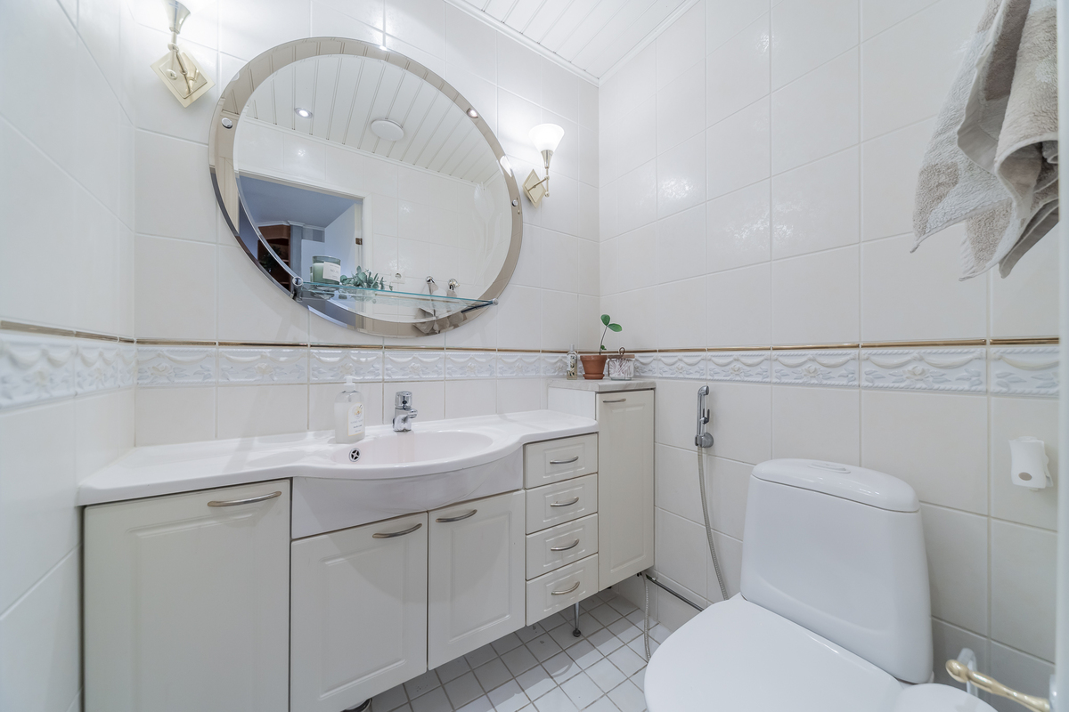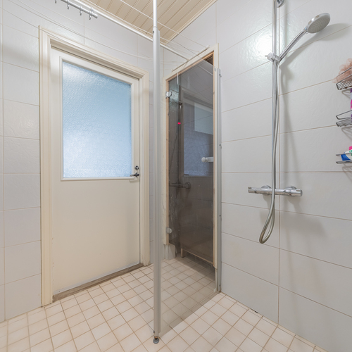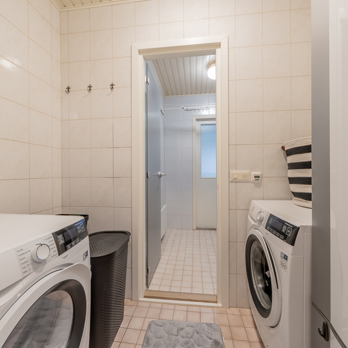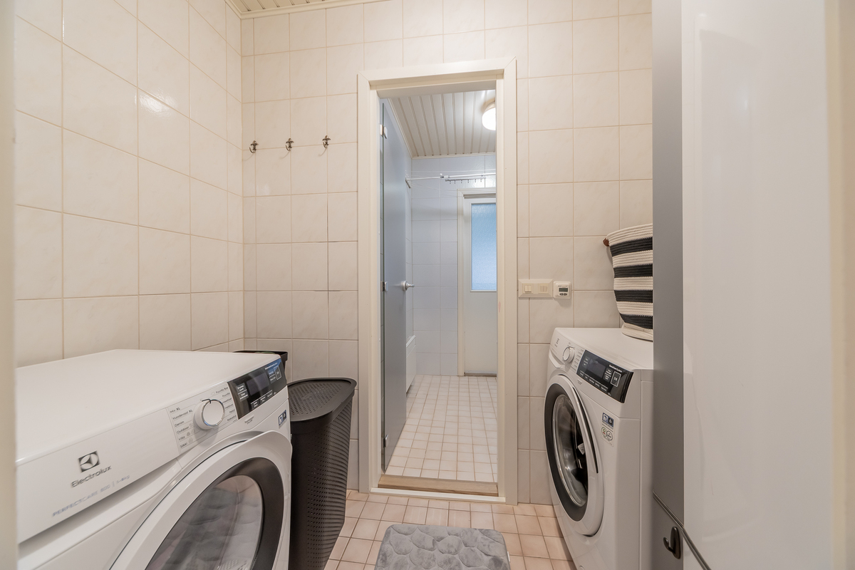 Kodinhoitohuoneessa paikka niin pyykinpesukoneelle kuin kuivausrummulle. Kylpyhuone on uusittu 2013, sieltä on käynti isolle suojaisalle terassille. Myös hyvät löylyt tarjoava sauna on uusittu 2013.