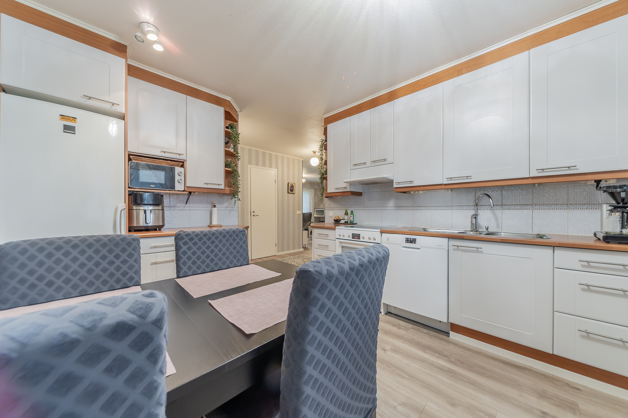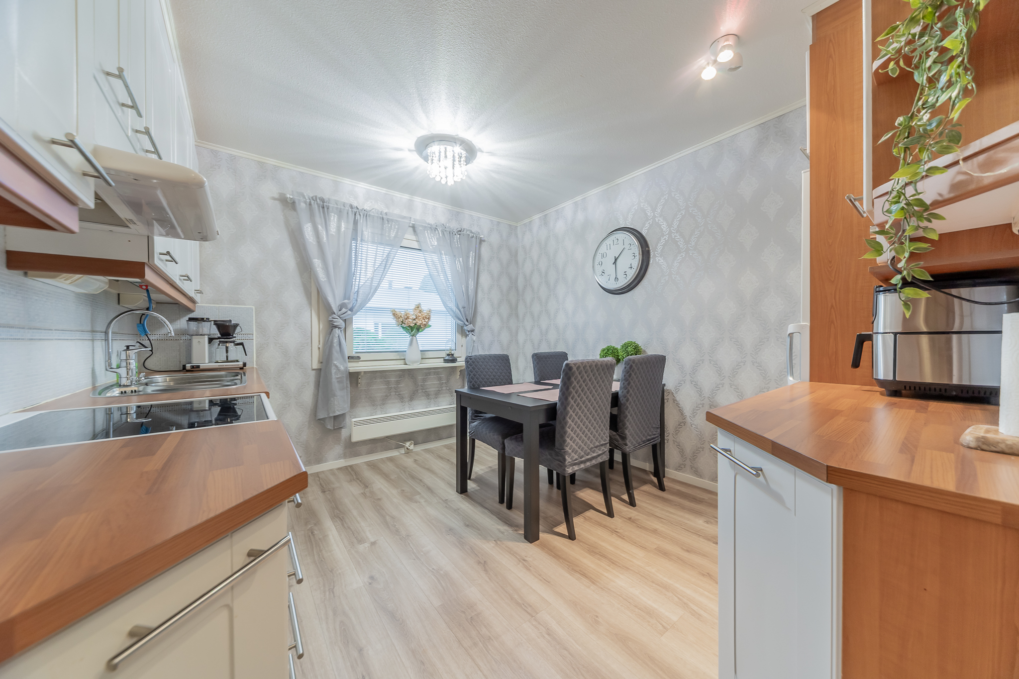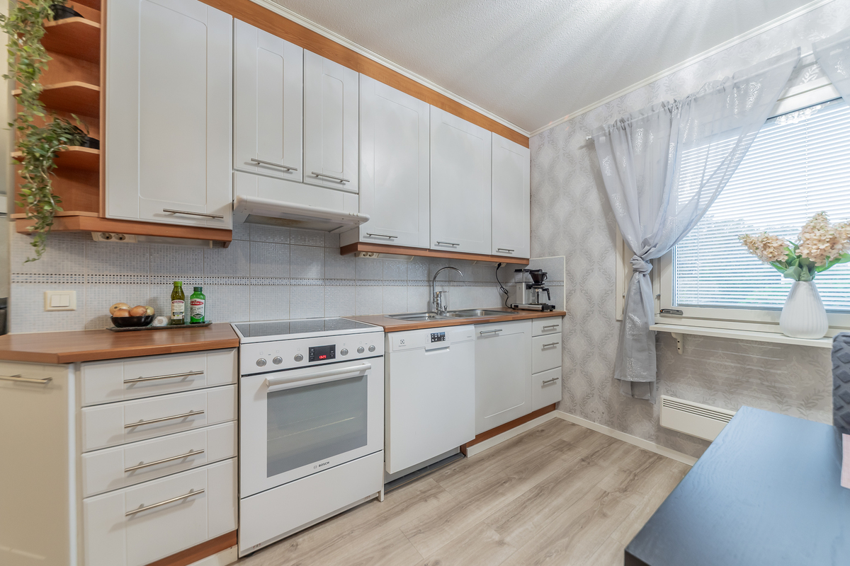 Vaaleasävyinen keittiö, jossa reilusti kaappeja ja työtasotilaa ja paikka ruokapöydälle.