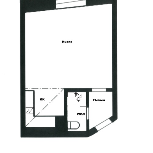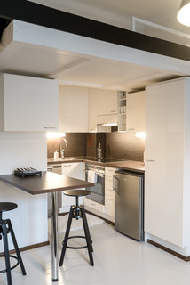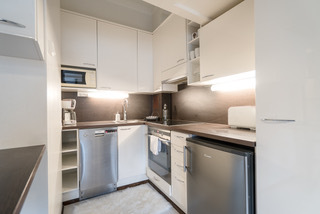 Induktioliesitaso, kalusteuuni, jääkaappi, astianpesukone, mikroaaltouuni, kiinteät valaisimet. Lautalattia, seinät ja katto maalattu..