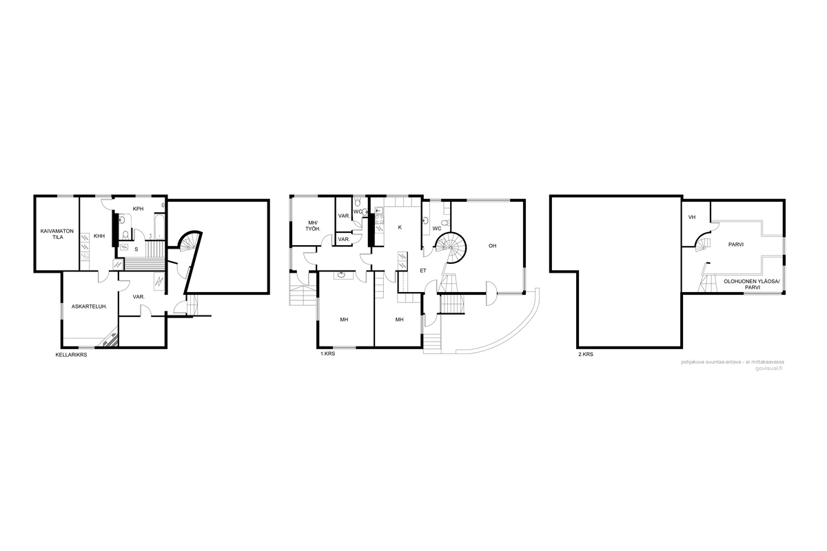 Talossa on kolme makuuhuonetta, joissa kaapistoa. Kaunis vaalea keittiö, jossa reilusti kaappi- ja työtasotilaa ja hyväkuntoiset kodinkoneet. Keittiössä myös paikka ruokapöydälle. Asuinkerrroksessa on myös kaksi kalustettua ja ikkunallista wc:tä.