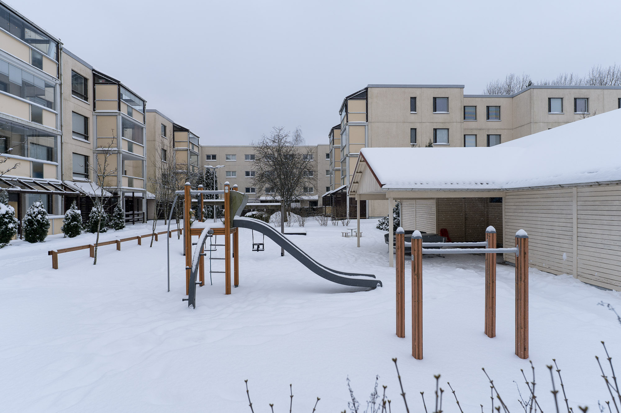 Jätepiste, tamppaus ja pyykinkuivaus, lasten leikkipaikka, kiipeilyteline, oleskelualueet, kasvillisuus, esteettömät kulkuväylät
