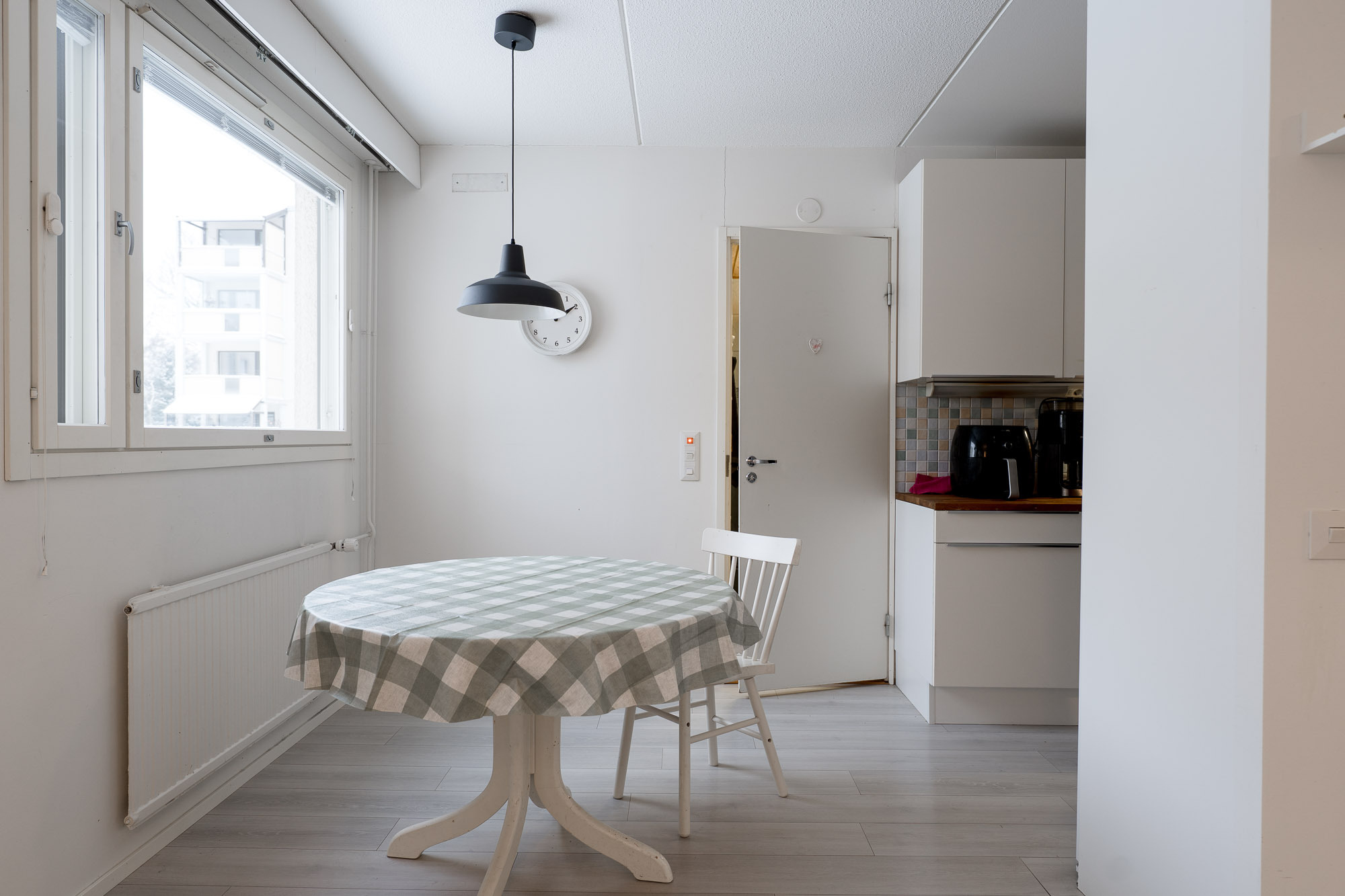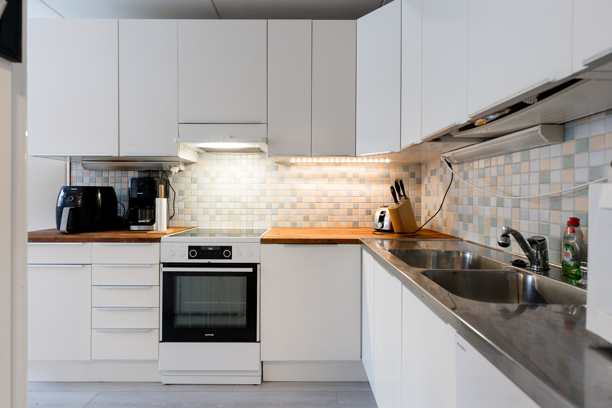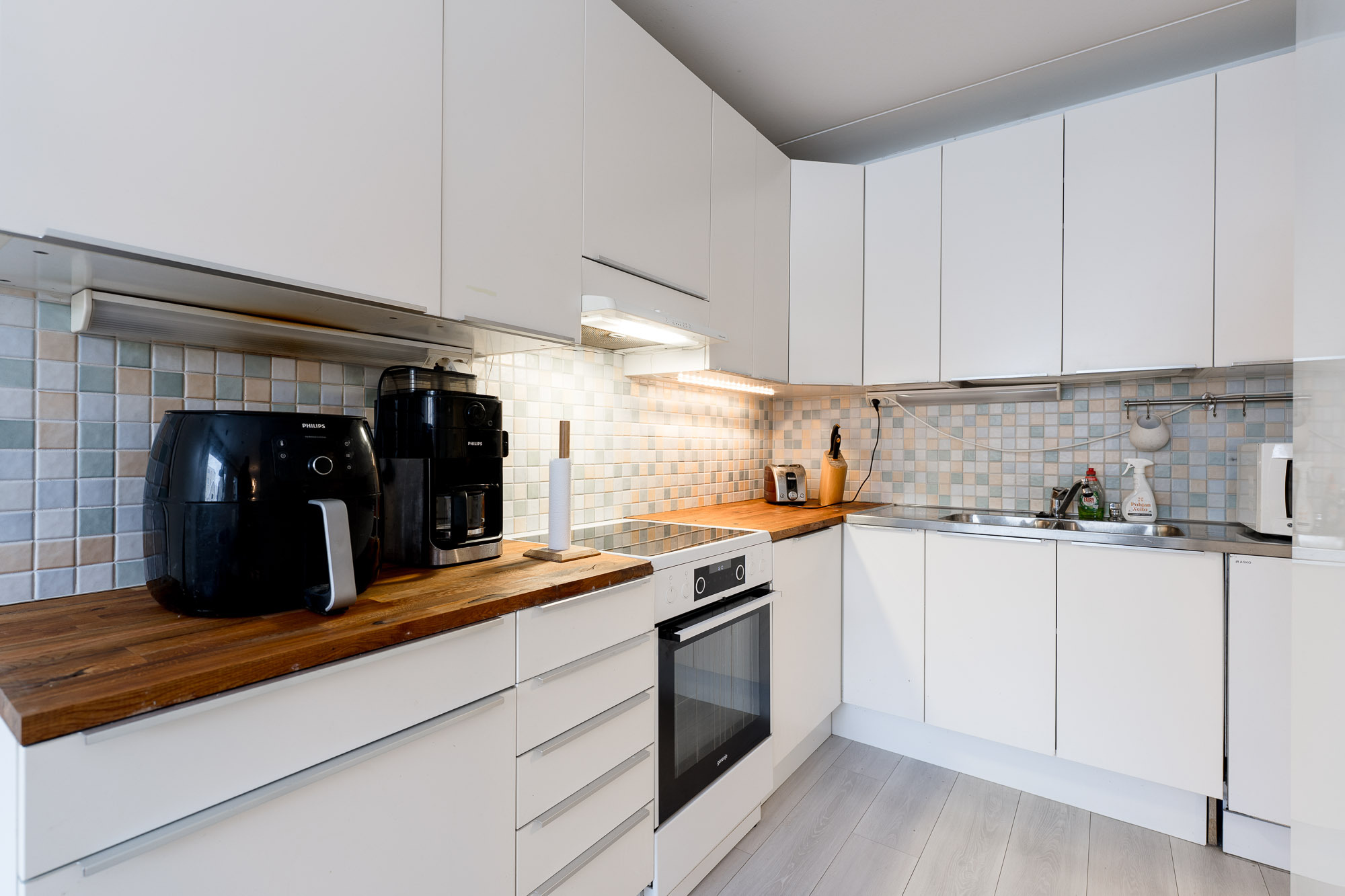 Keraaminen liesi, liesituuletin (suodatin), astianpesukone,, jääkaappi, pakastin. Rosteritiskipöytä, puutaso, välitila laatta. Kiinteät välitilavalaisimet. Lattia laminaattia, seinät ja katto maalattu.