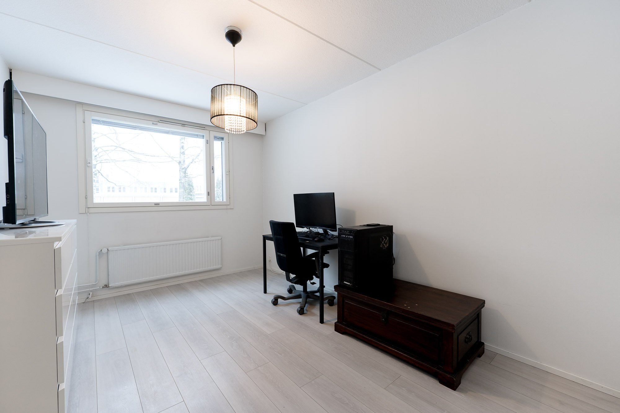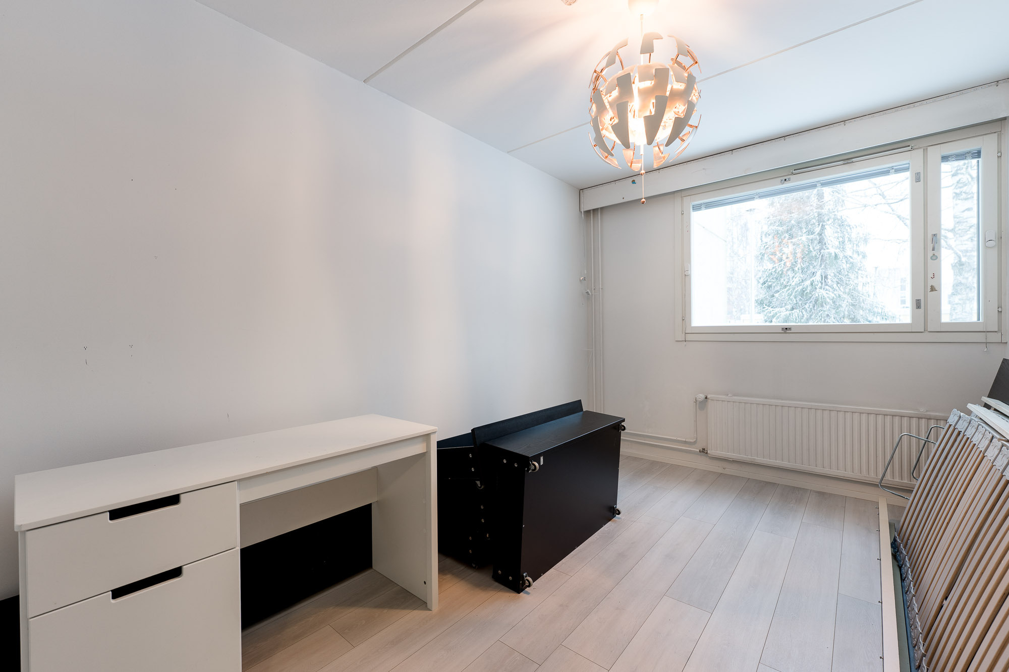 Makuuhuone 3: Mh 3. Kaapisto, lattia laminaattia, seinät ja katto maalattu. Ikkunassa sälekaihtimet.