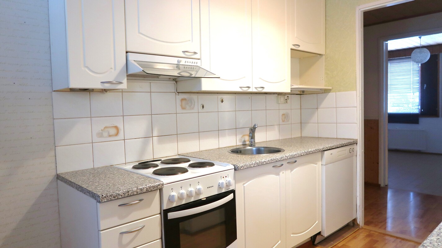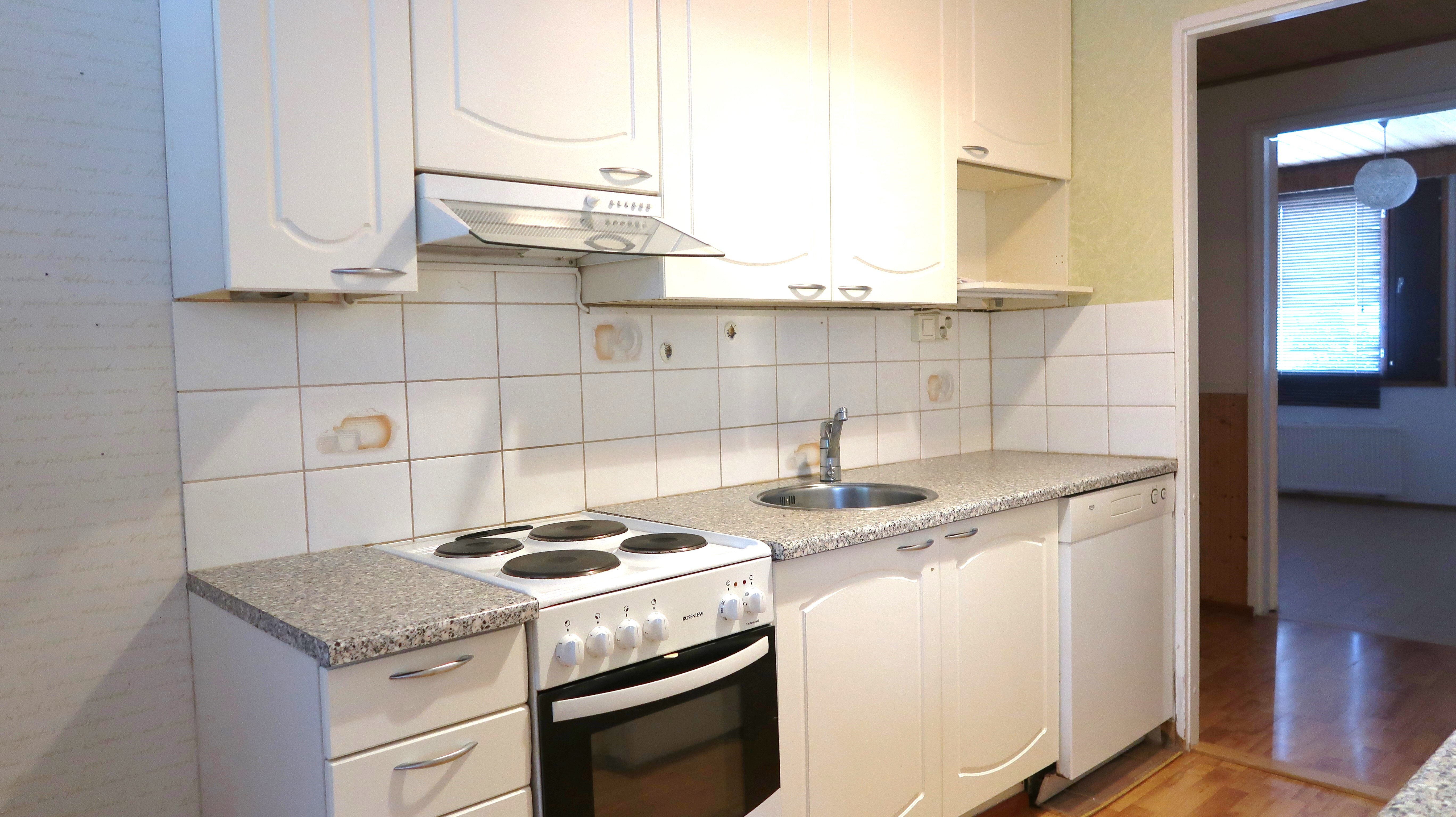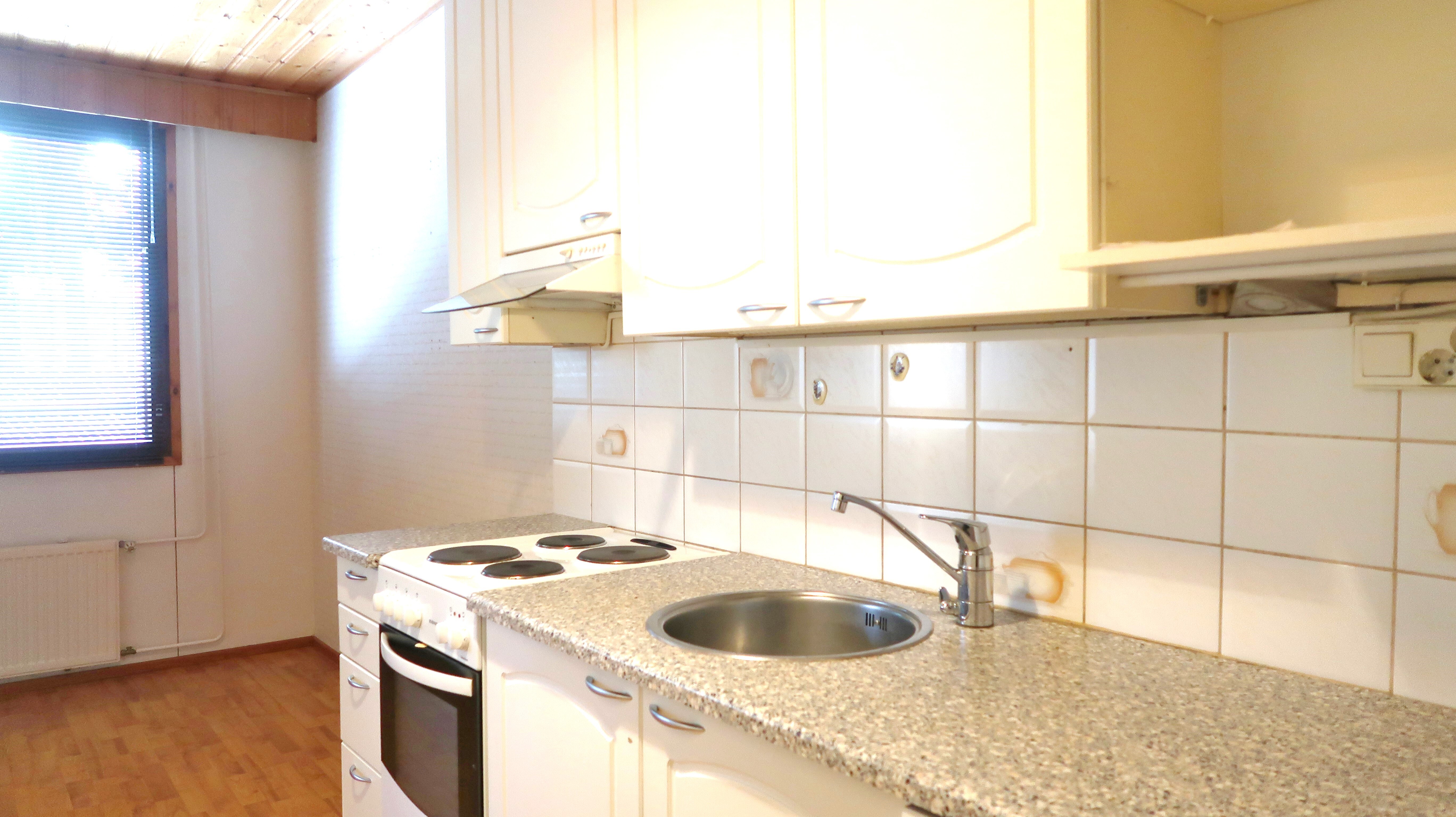 Varusteet: jääkaappipakastin, astianpesukone, sähköliesi, liesituuletin hormilla
