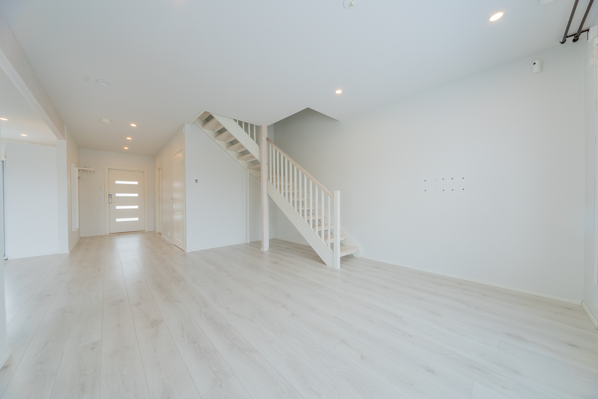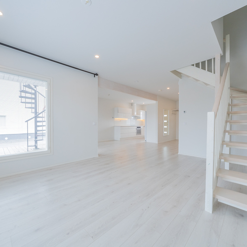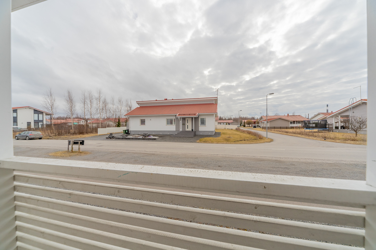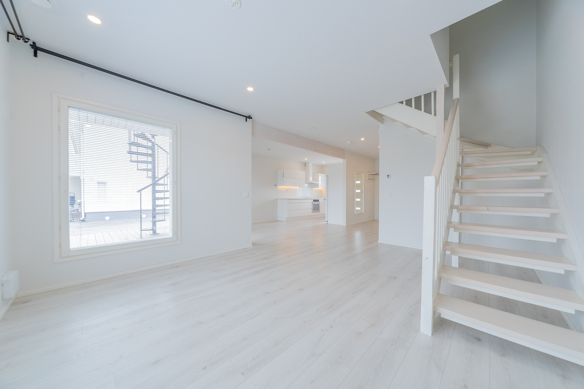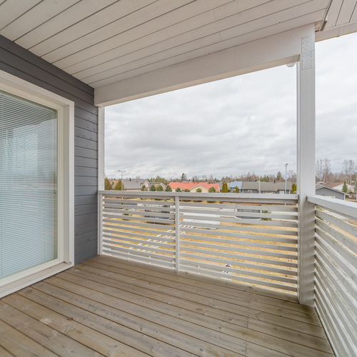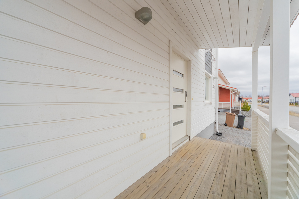 Tilavalta terassilta pääset suoraan ulkokautta johdettuja kierreportaita toisen kerroksen asuintiloihin.
