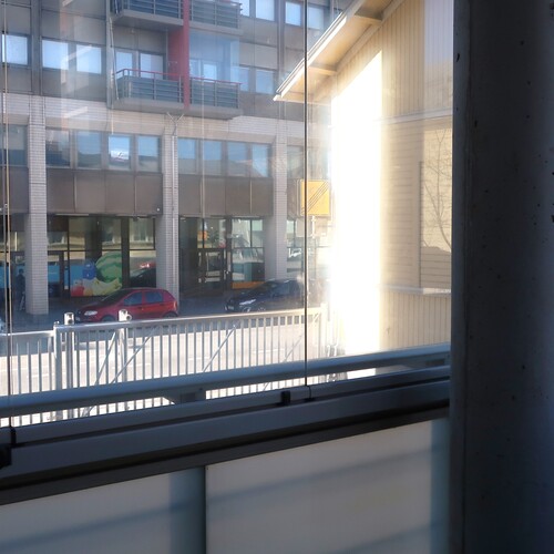Hissi maan tasalta ja lasitetulta parvekkeelta näkymät useampaan suuntaan.