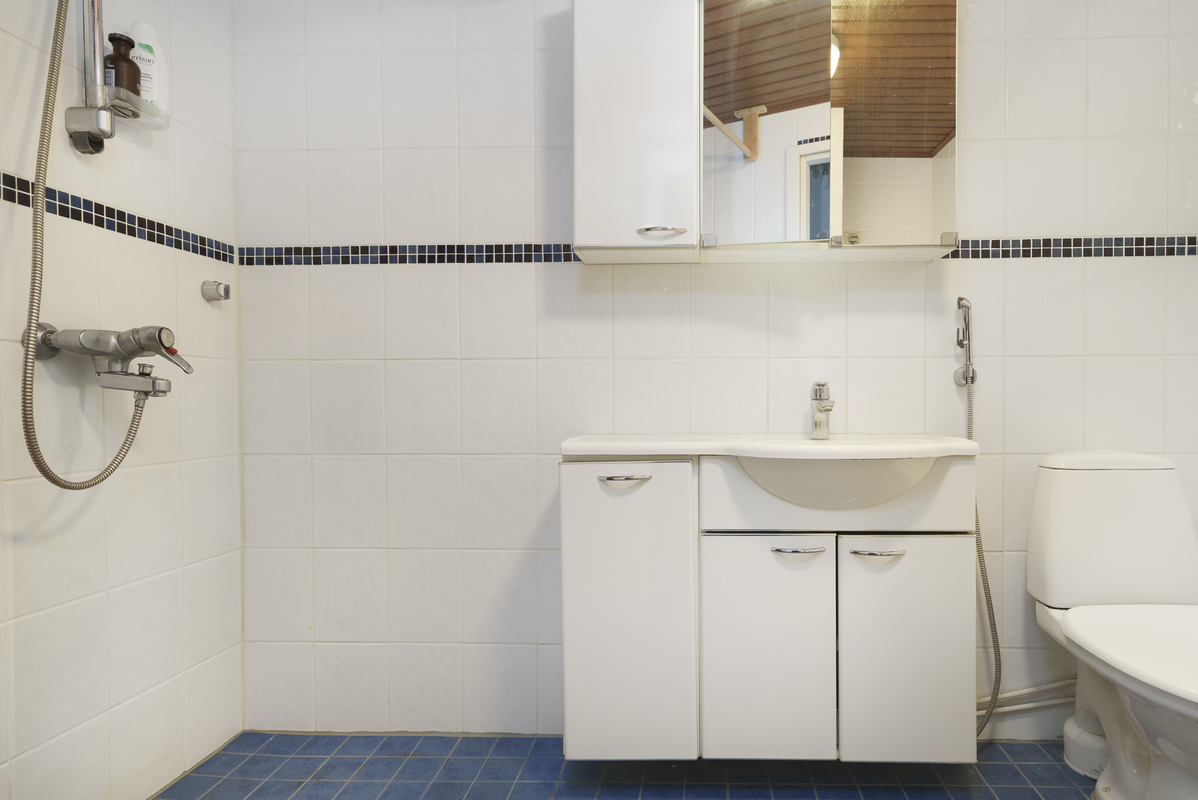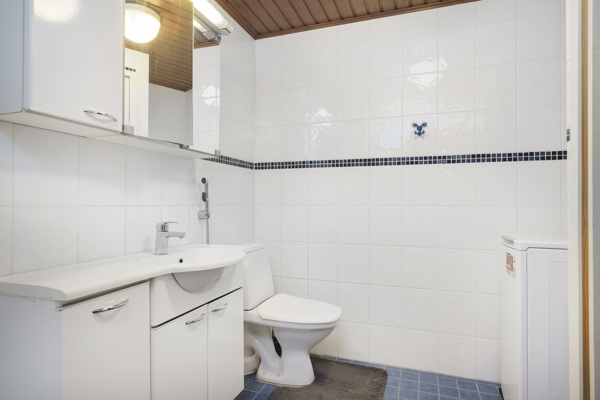 Suihkuverho, allas- ja peilikaappi, bideesuihku, pesukoneliitäntä. Sähkölattialämmitys. Kokonaan laatoitettu.