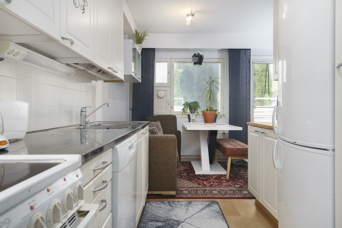 Avokeittiö: Jääkaappi-pakastin, keraaminen liesi, liesituuletin hormissa, astianpesukone.
