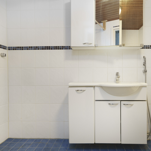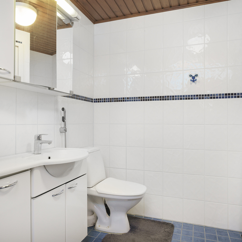 Suihkuverho, allas- ja peilikaappi, bideesuihku, pesukoneliitäntä. Sähkölattialämmitys. Kokonaan laatoitettu.