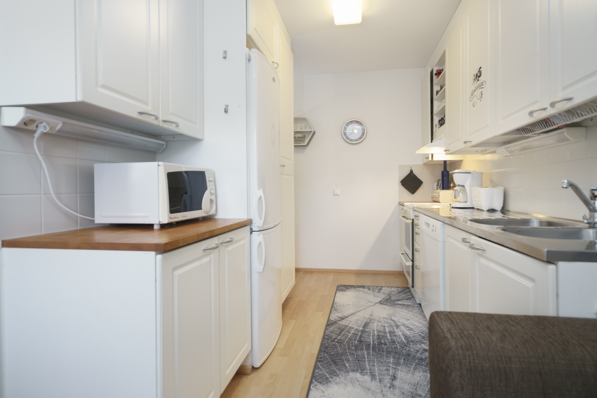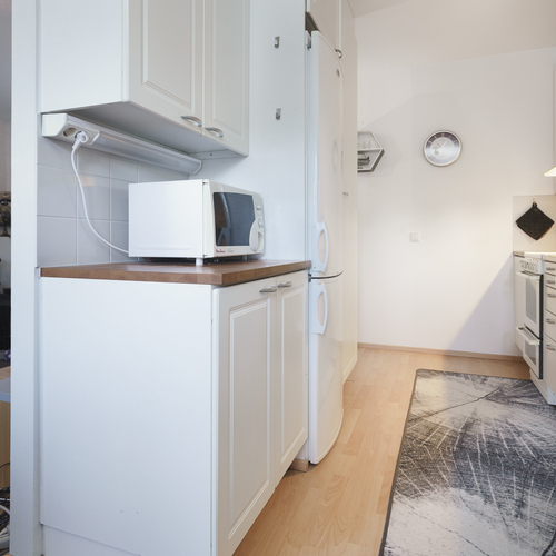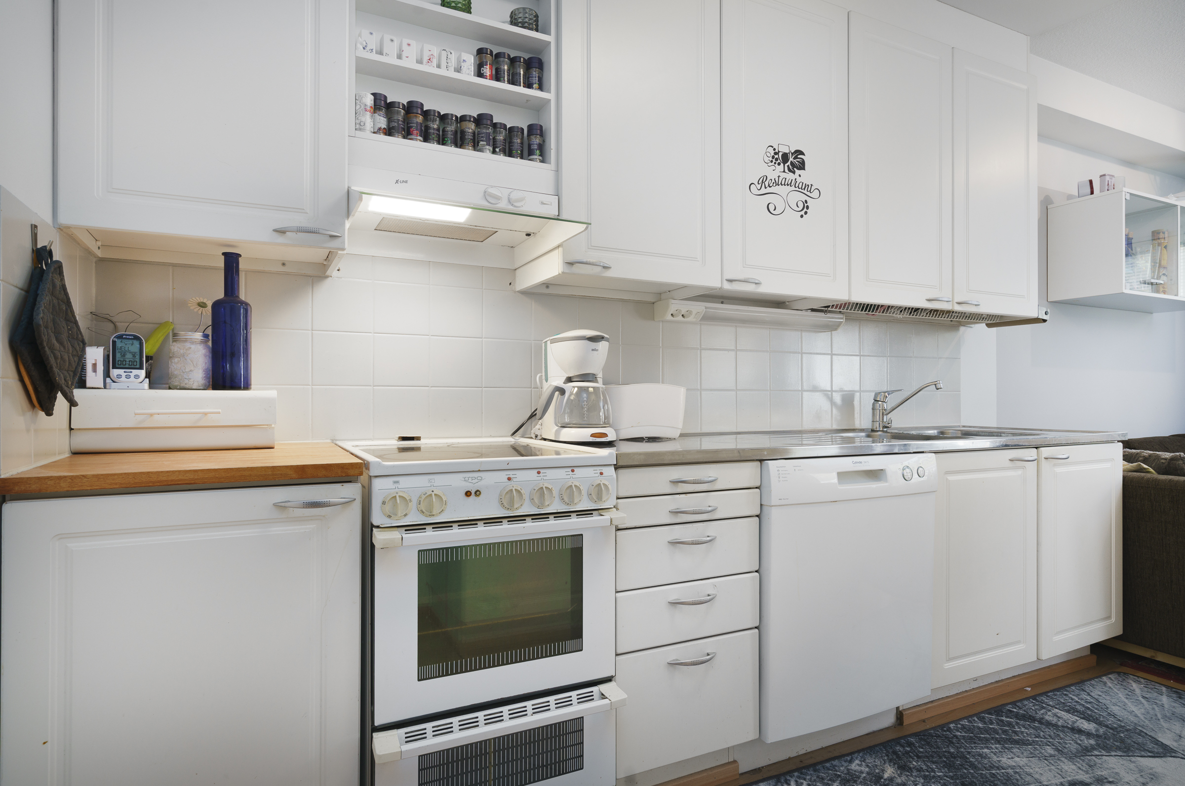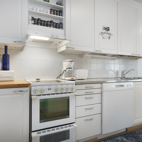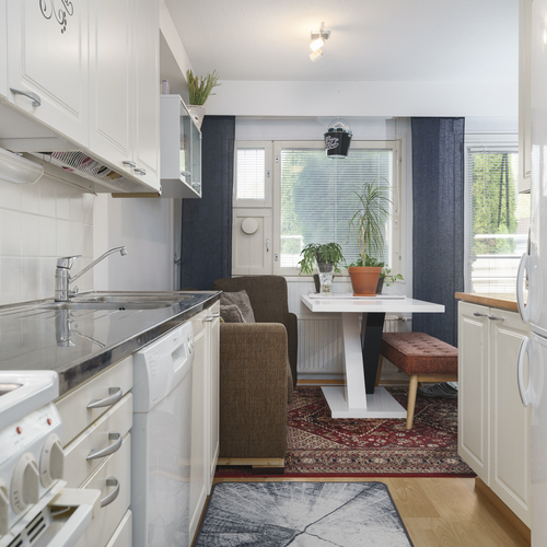 Avokeittiö: Jääkaappi-pakastin, keraaminen liesi, liesituuletin hormissa, astianpesukone.