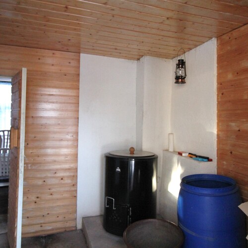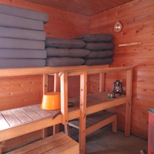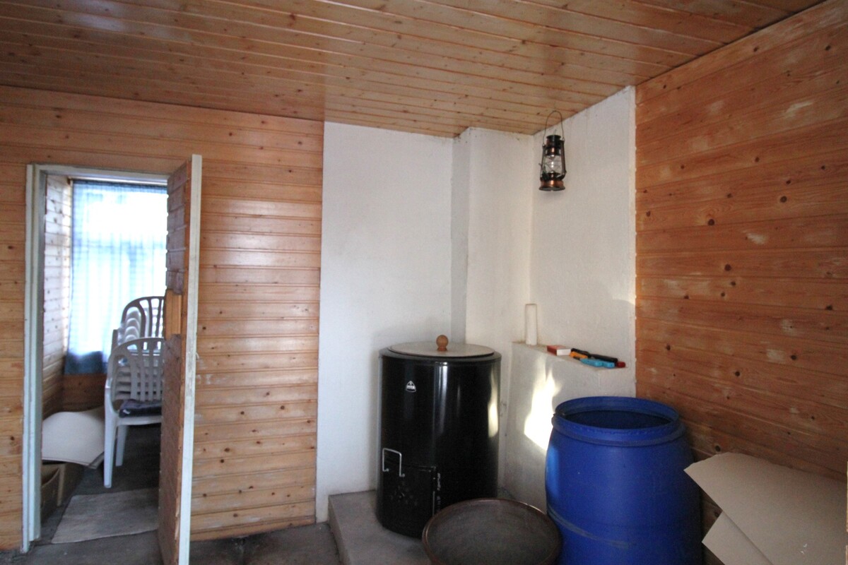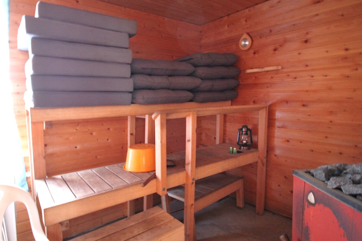 Erillinen saunarakennus, jossa vesipata ja puulämmitteinen kiuas