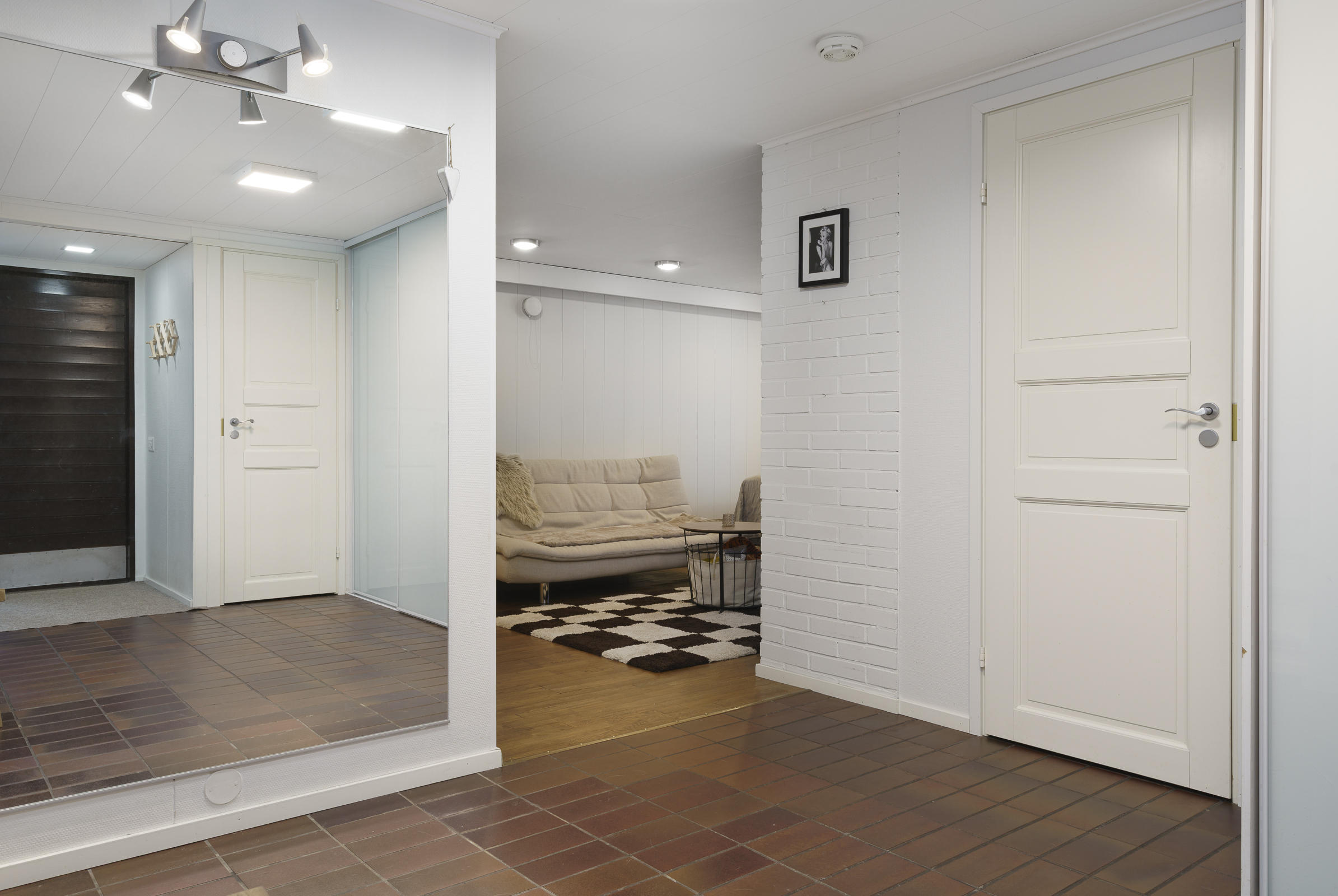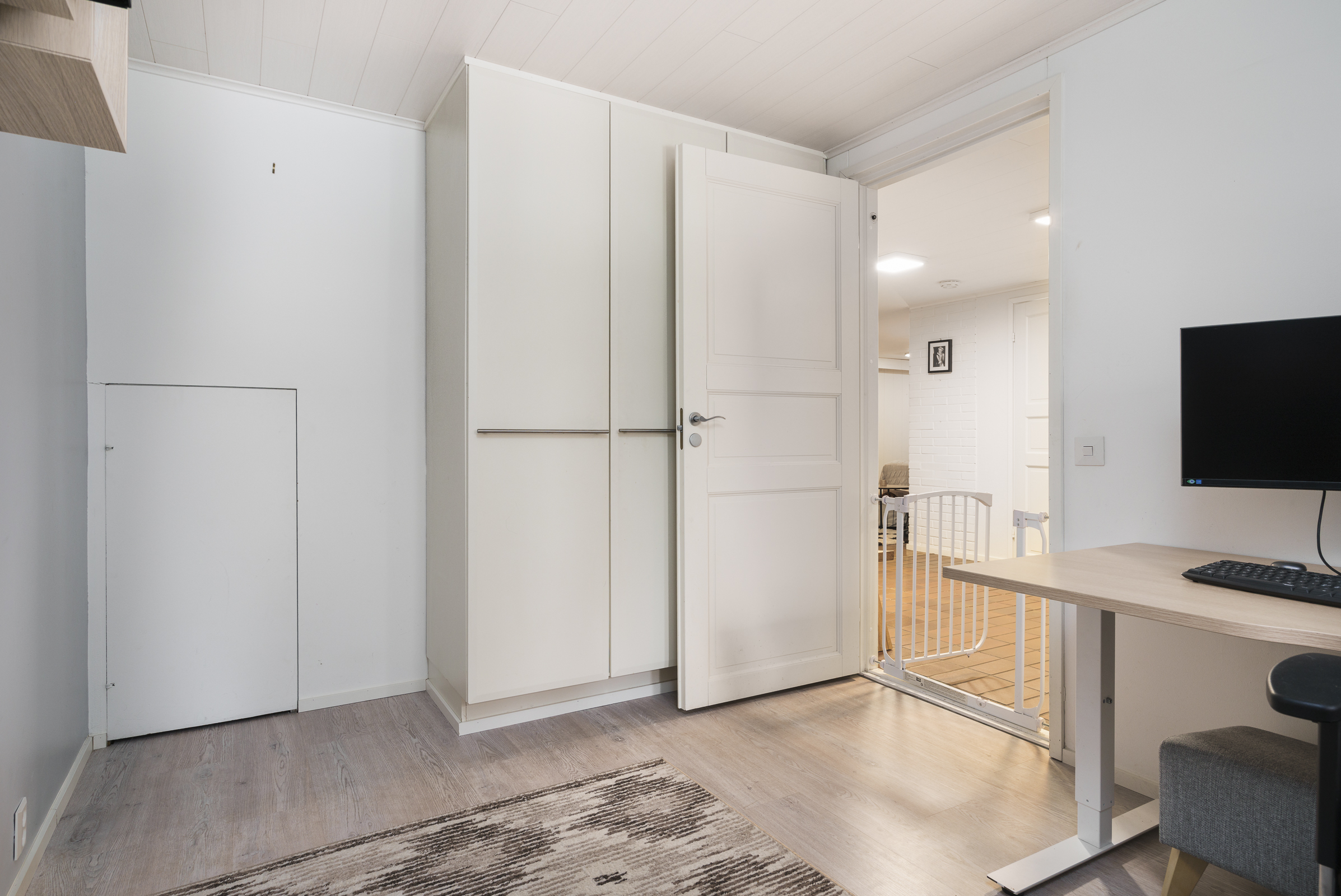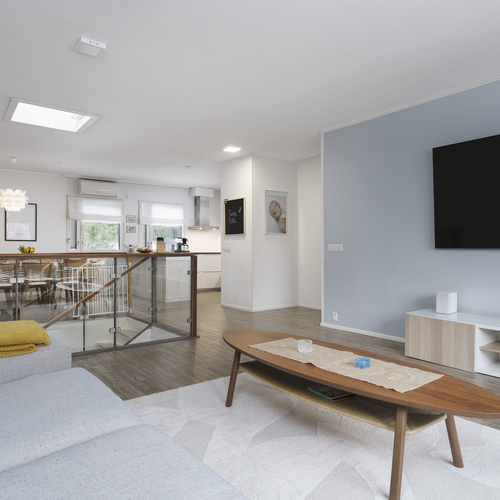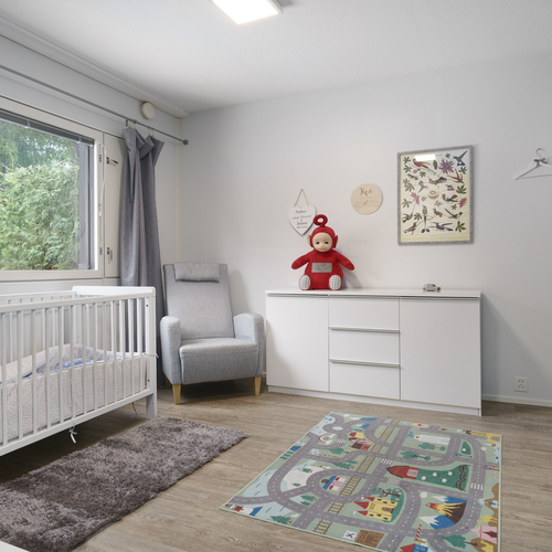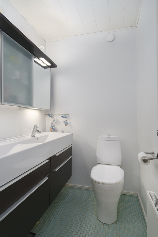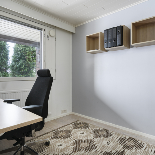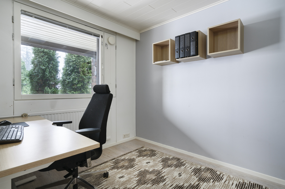 Pintamateriaalit: Alakerran makuuhuoneessa laminaattilattia, takkahuoneessa parketti. Yläkerrassa on vinyylikorkkilattia, joka kestää kosteutta, elämisen jälkiä ja on hiljainen. Seinät tapetoitu tai maalattu.