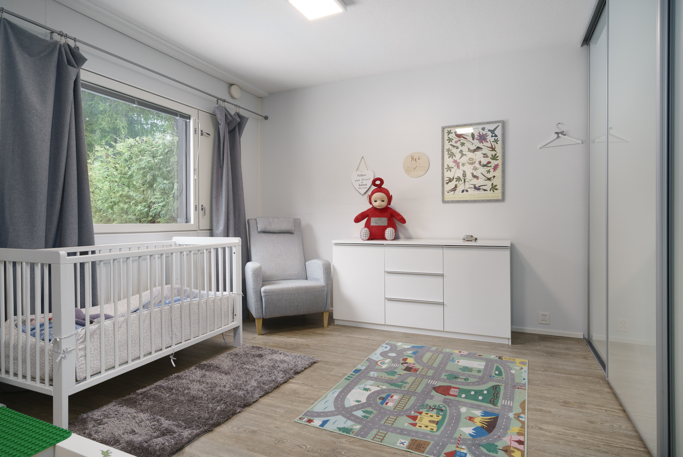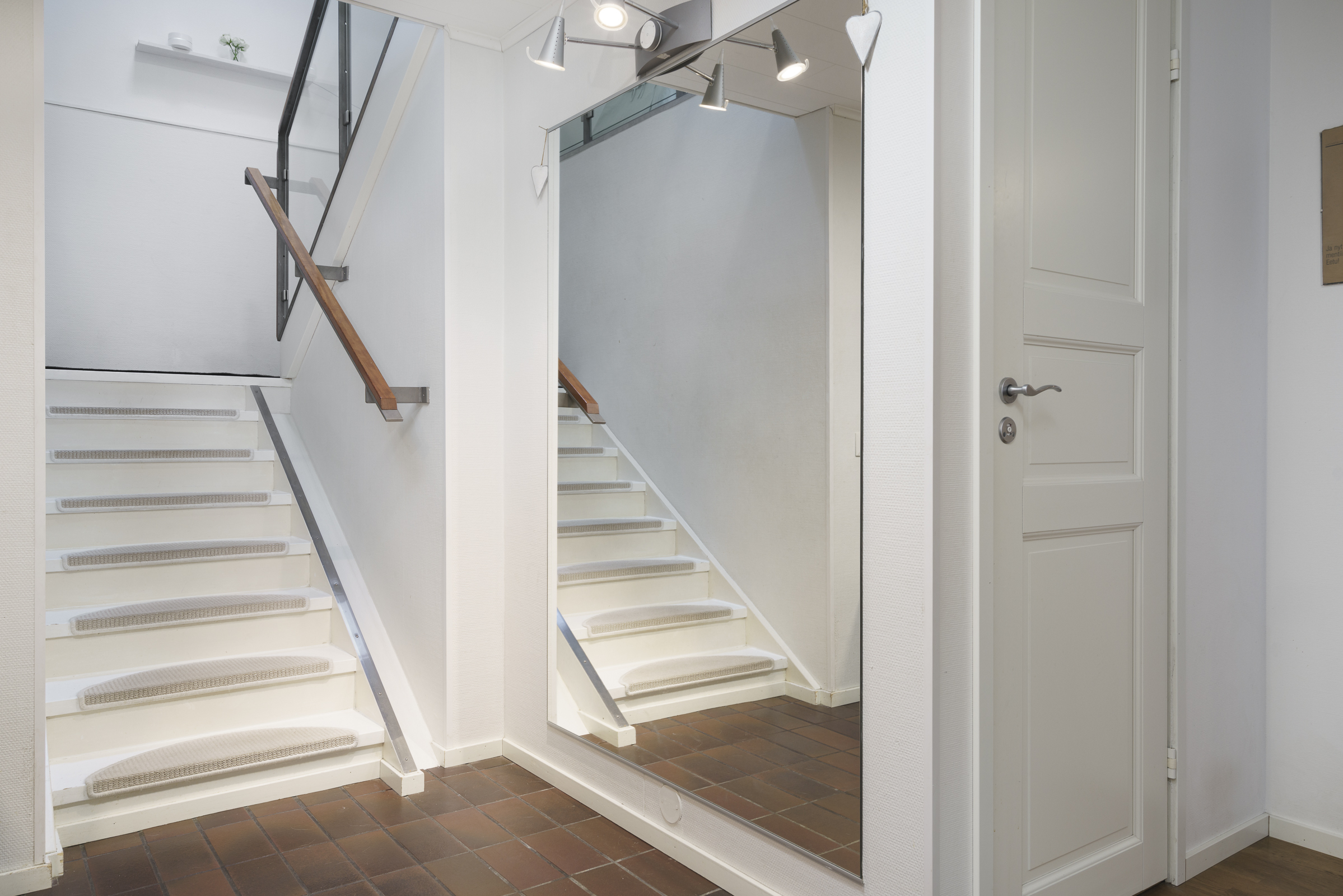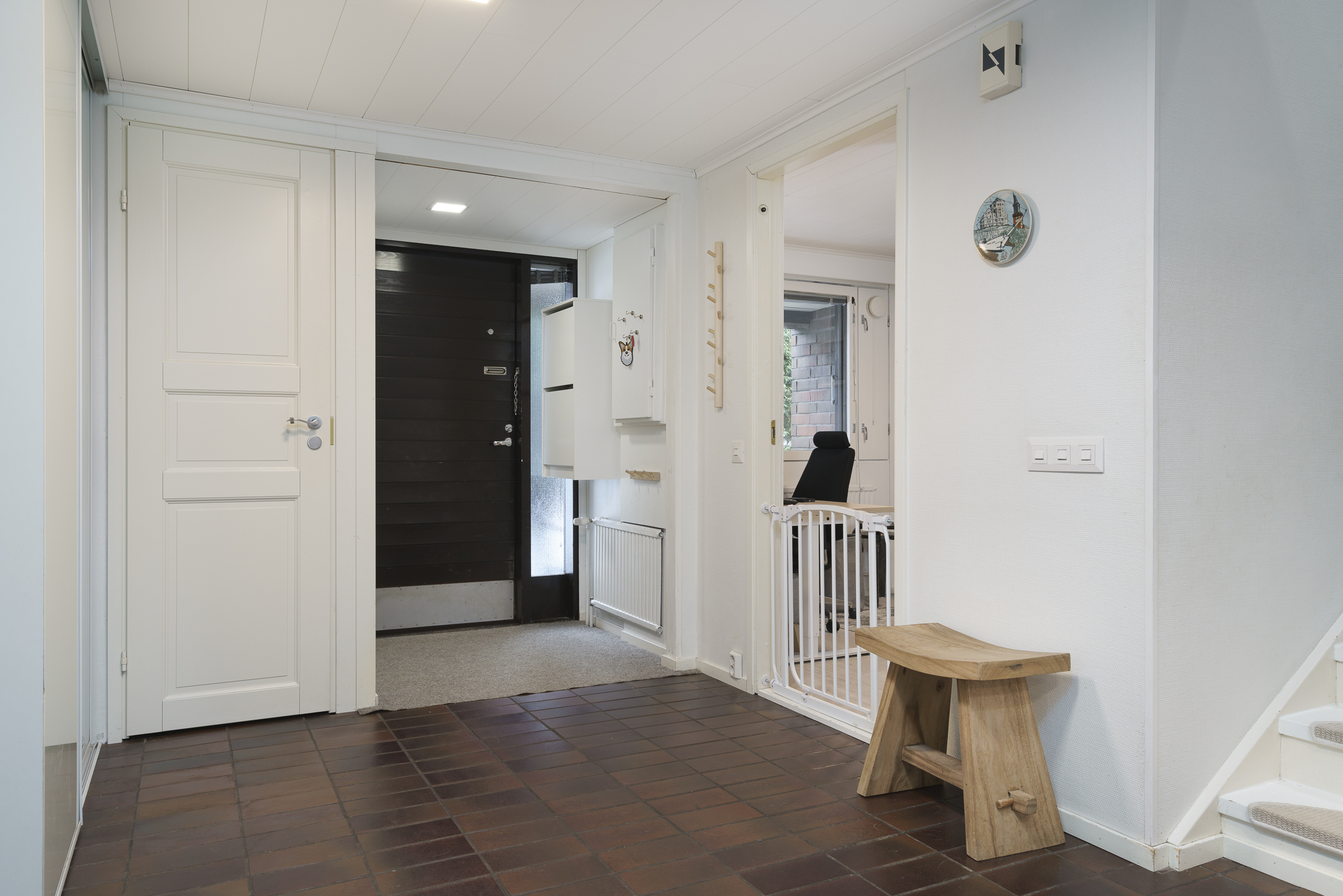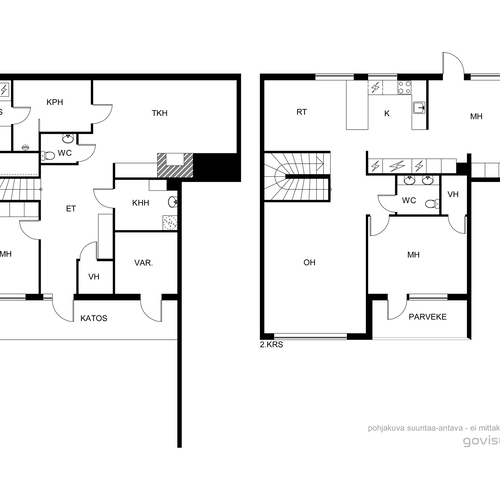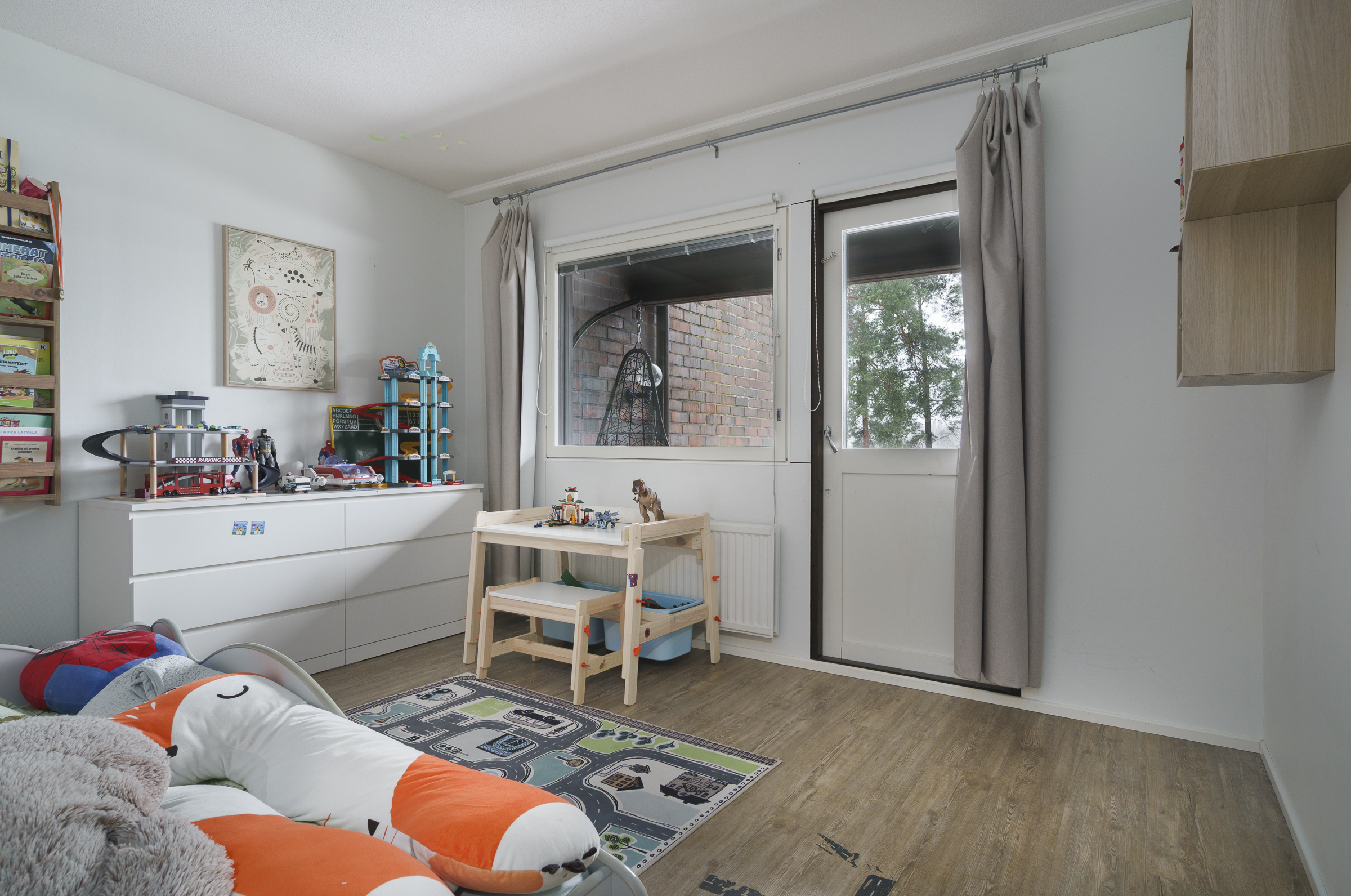 Pintamateriaalit: Alakerran makuuhuoneessa laminaattilattia, takkahuoneessa parketti. Yläkerrassa on vinyylikorkkilattia, joka kestää kosteutta, elämisen jälkiä ja on hiljainen. Seinät tapetoitu tai maalattu.