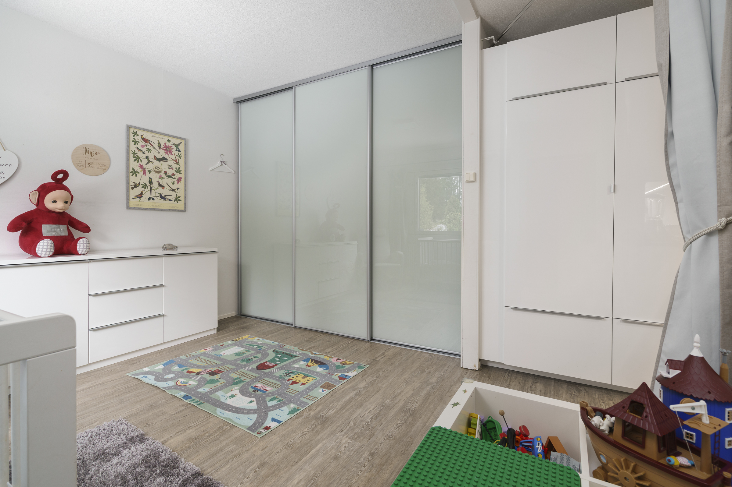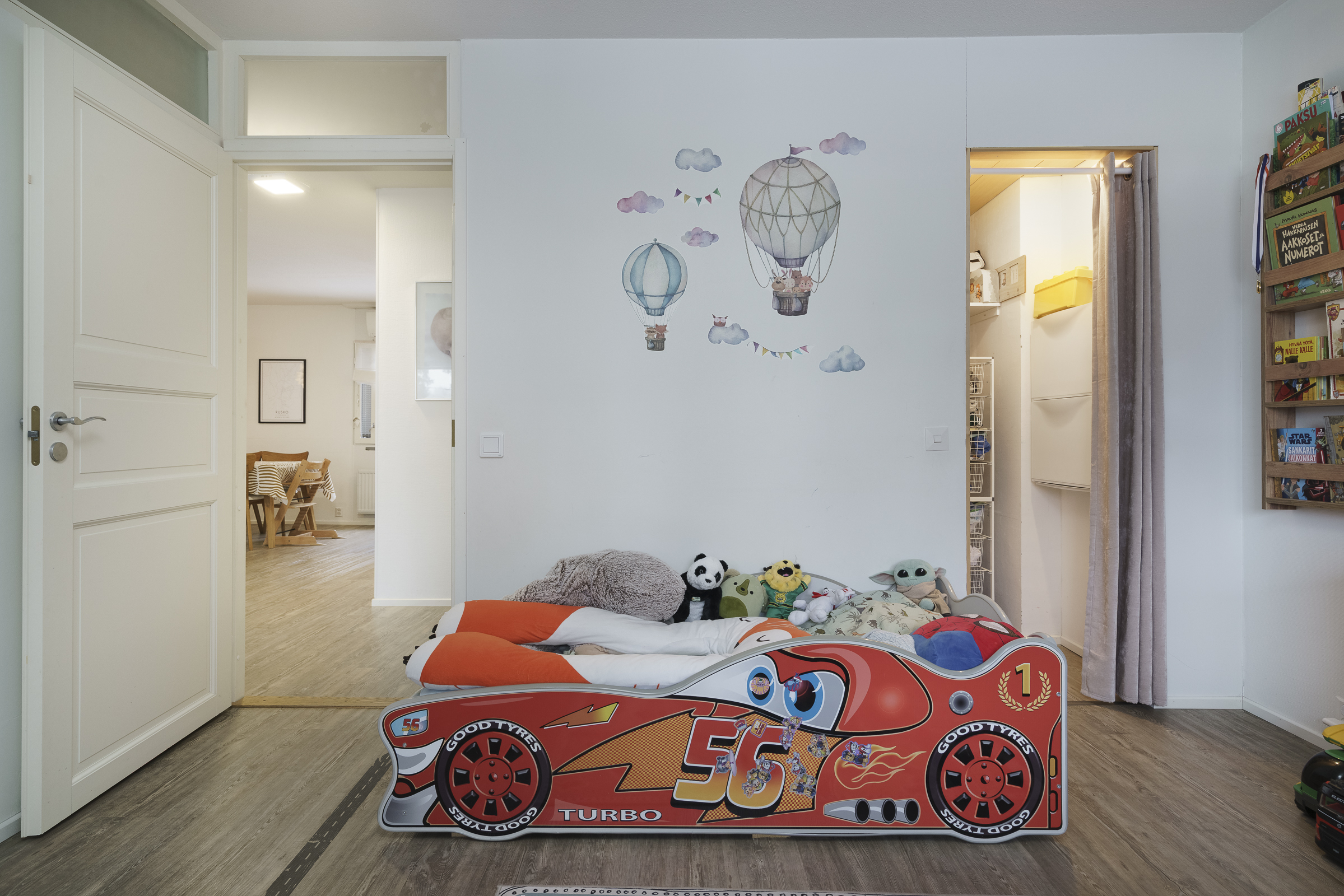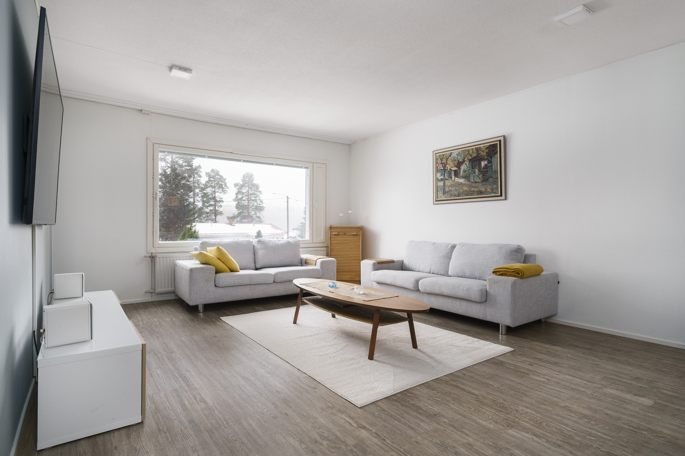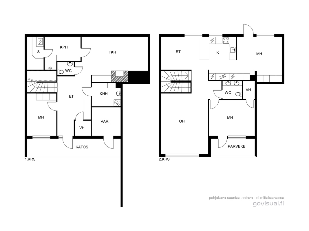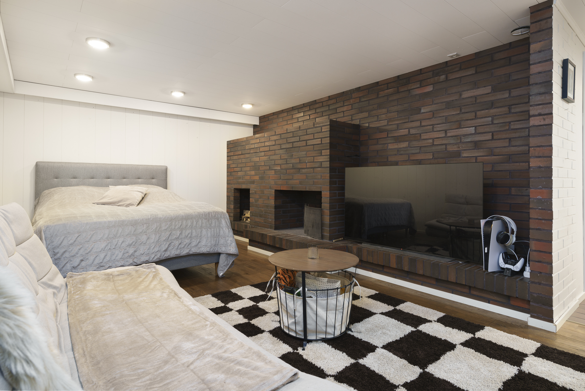 Pintamateriaalit: Alakerran makuuhuoneessa laminaattilattia, takkahuoneessa parketti. Yläkerrassa on vinyylikorkkilattia, joka kestää kosteutta, elämisen jälkiä ja on hiljainen. Seinät tapetoitu tai maalattu.