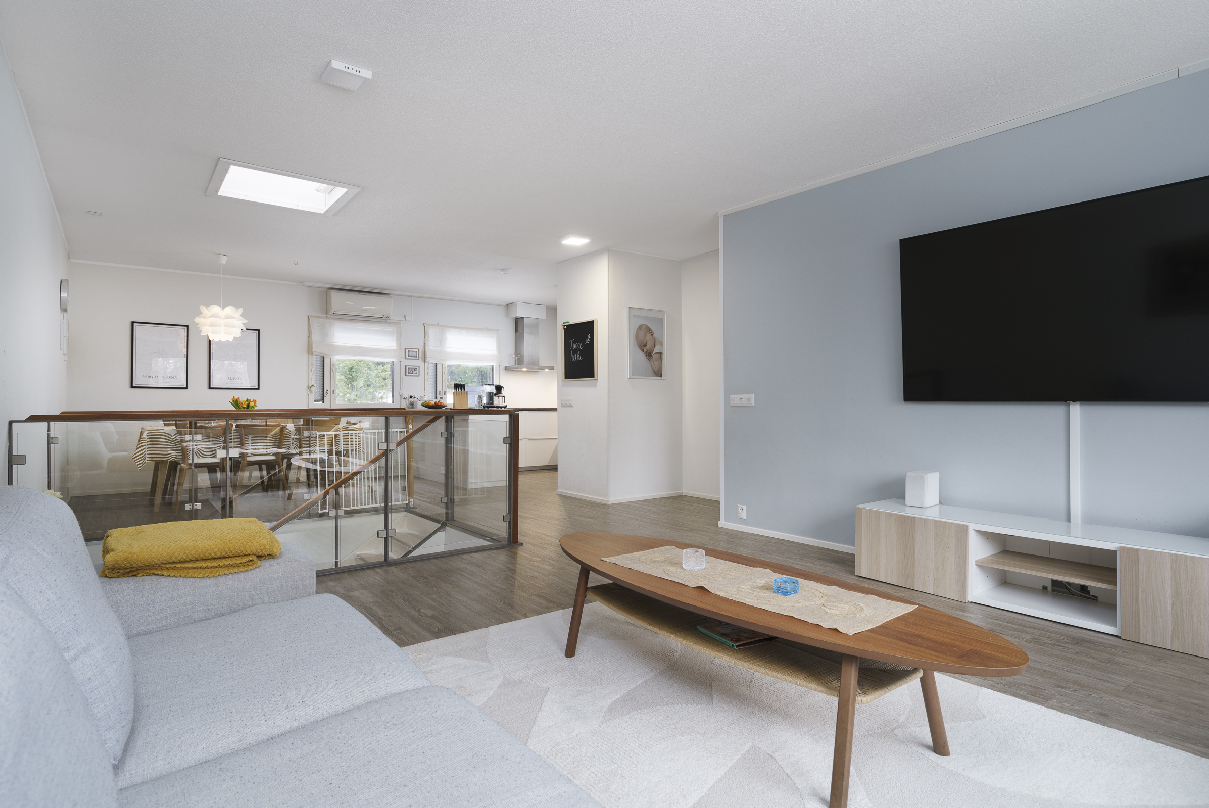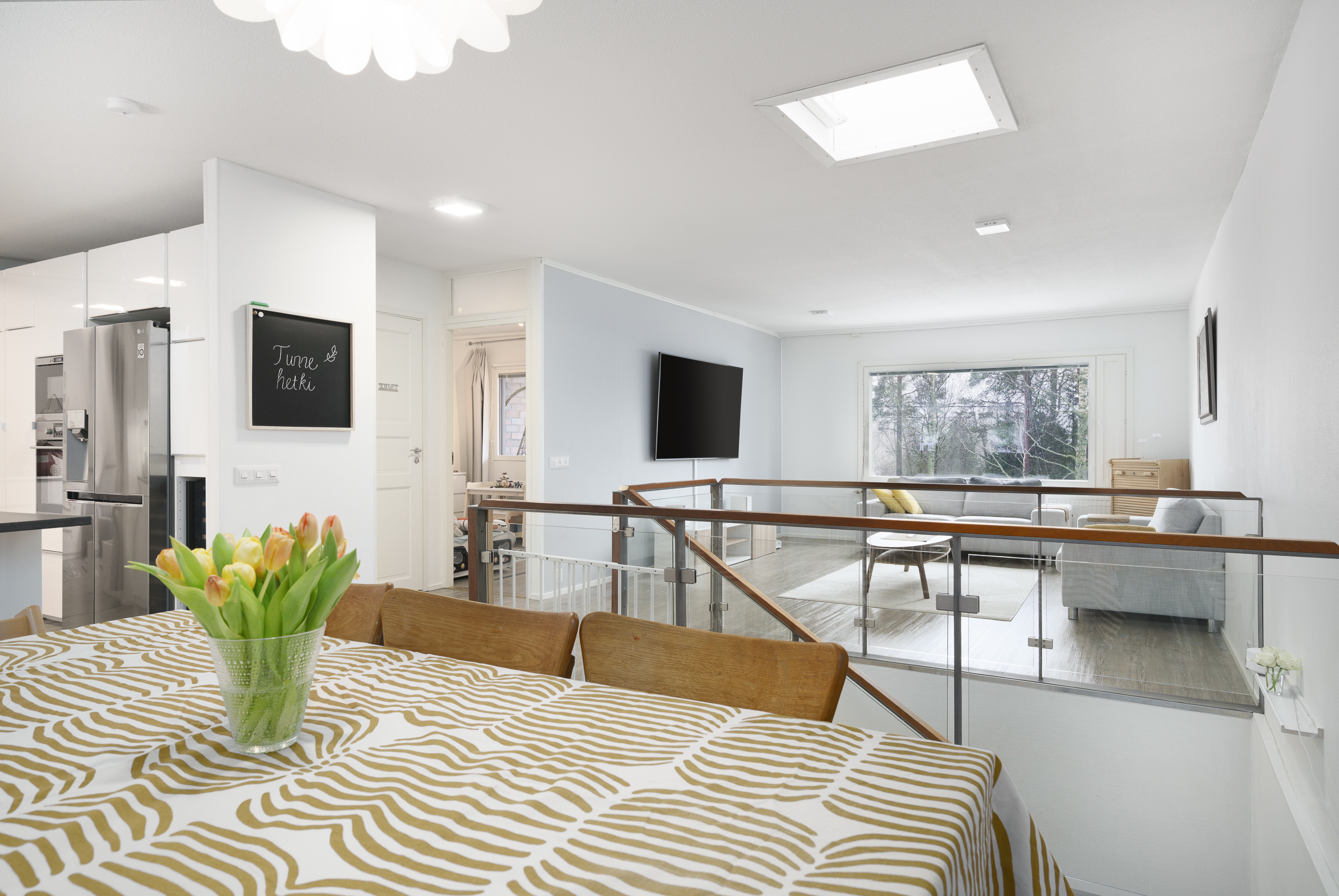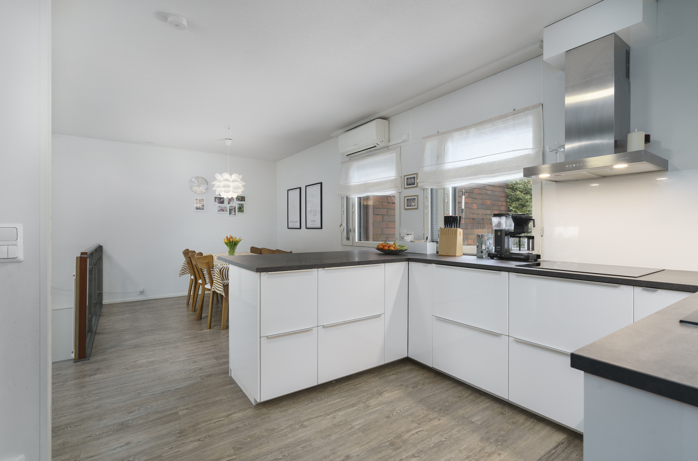 Avokeittiö, rst-kodinkoneet: Jääkaappi-pakastin, erillisuuni ja -liesitaso, kylmäkeskus, mikro ja viinikaappi. Integroitu astianpesukone.