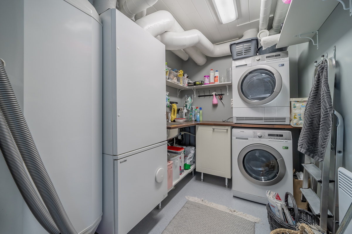 Lämminvesivaraaja, ilmanvaihtokone, pyykinpesukone, kuivausrumpu, allas, kaapistoa, seinillä maali, betonilattia
