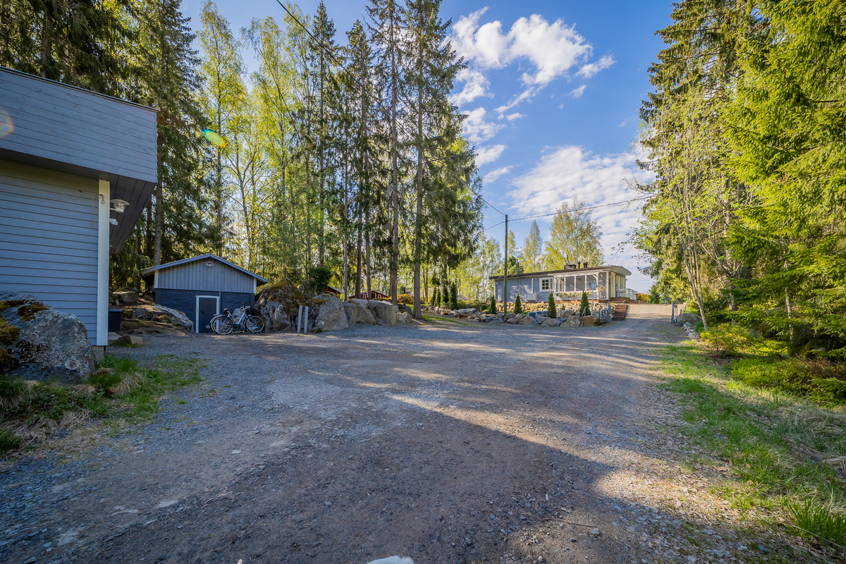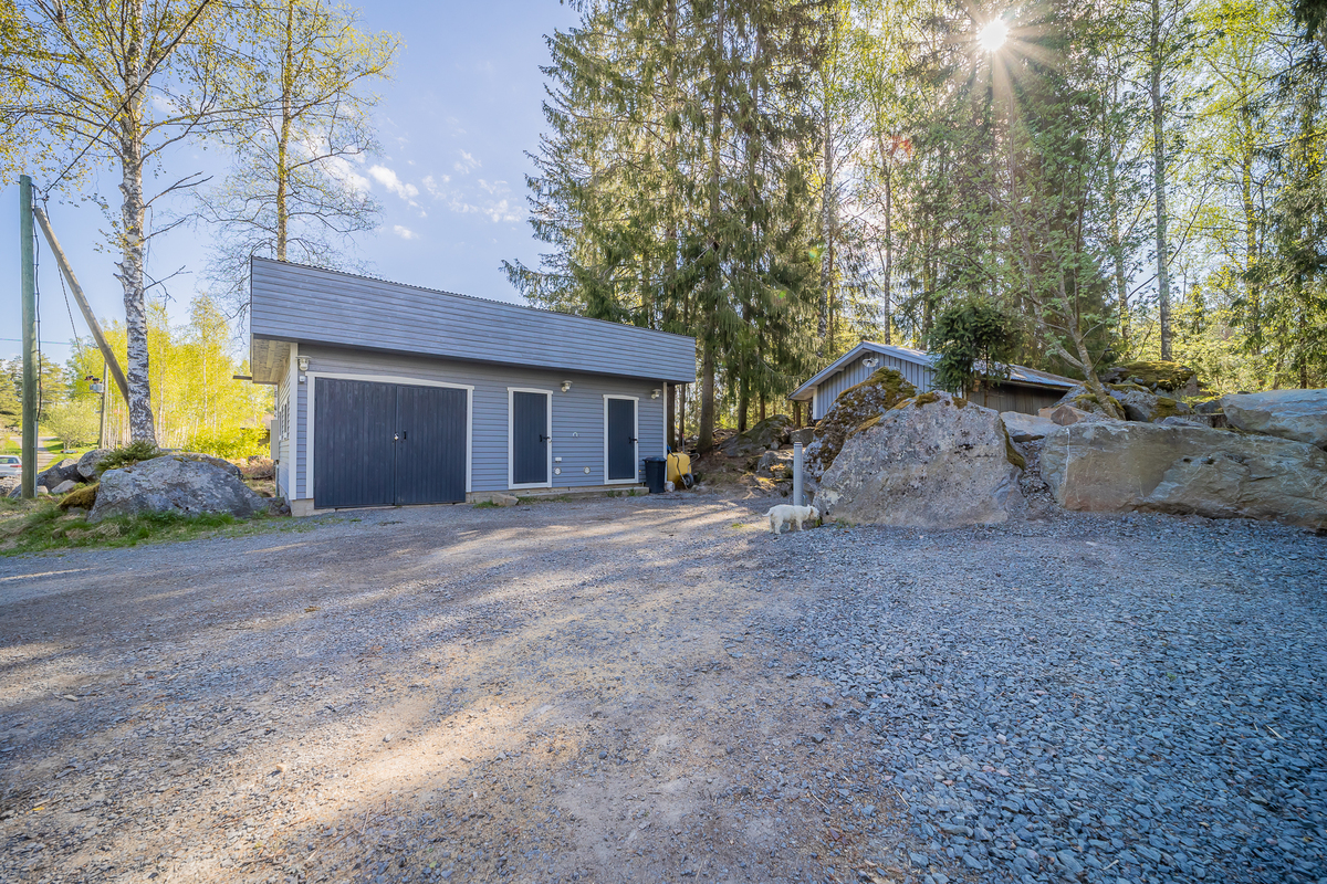 Piha-alueelle saavuttaessa on autotalli varastotiloineen sekä maakellari.