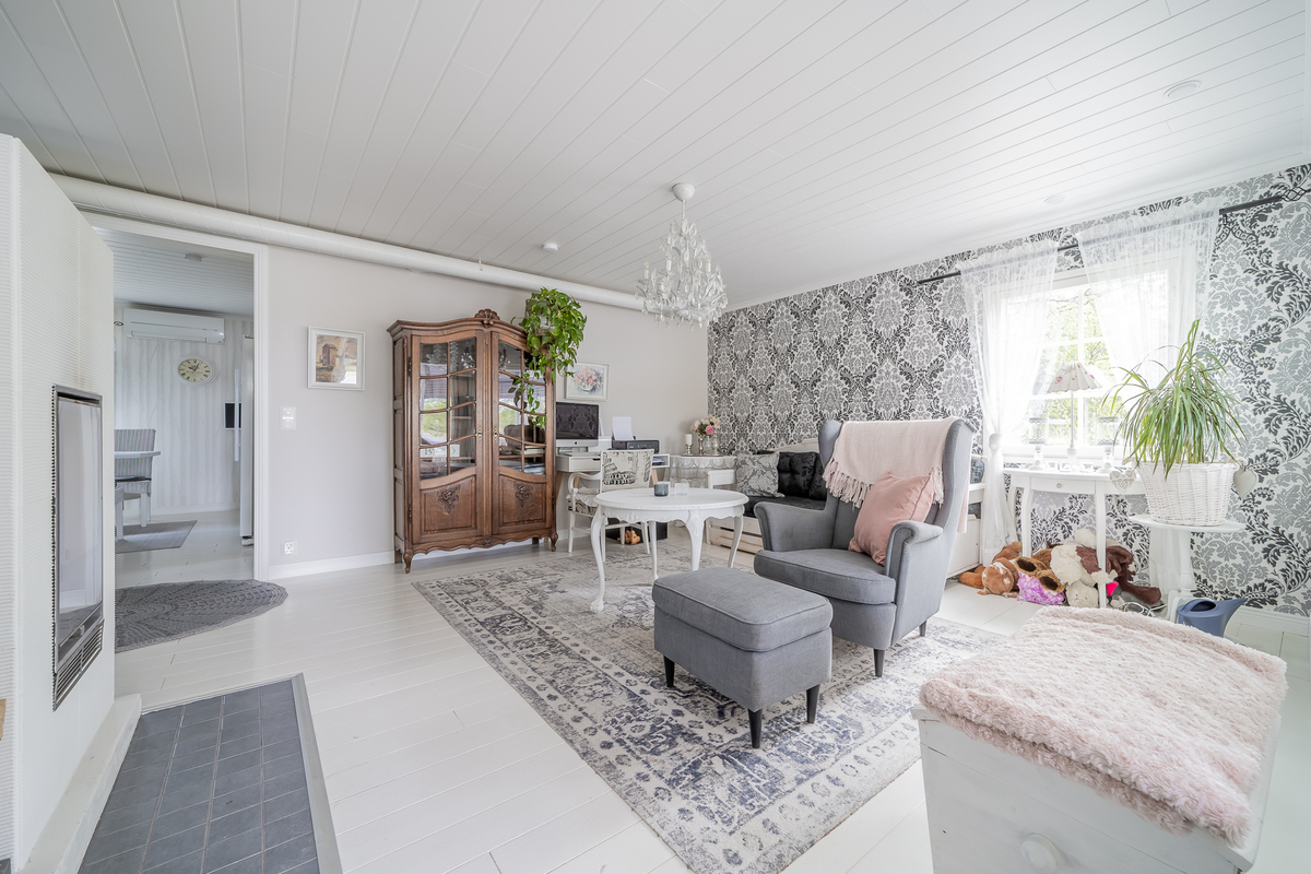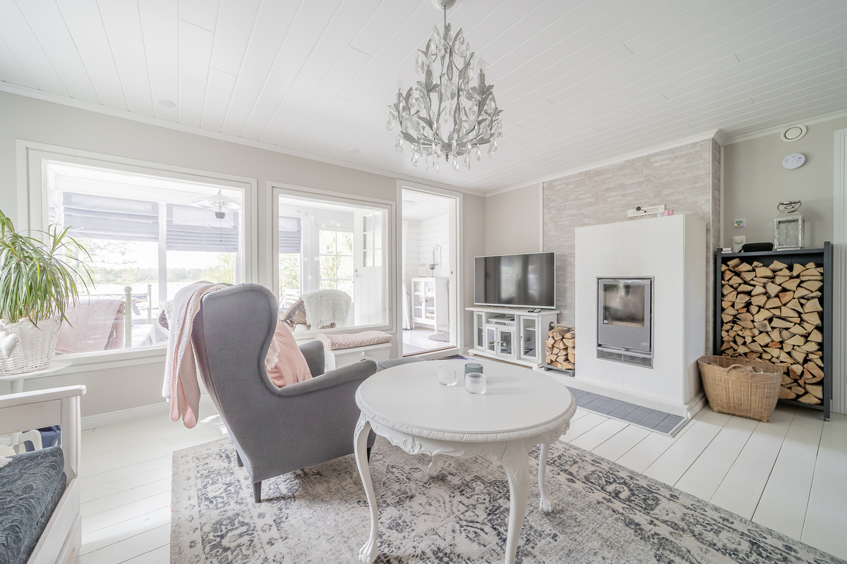 Tilavassa ja valoisassa olohuoneessa on kaunis Tulikiven varaava takka. Olohuoneesta on käynti kodinhoitohuoneeseen, jossa valmiina odottaa pyykinpesukone ja kuivausrumpu. Olohuoneesta on käynti lasiterassille. Lasiterassilta on käynti pukuhuoneeseen ja upeaan puulämmitteiseen ja suihkulla varustettuun saunaan.