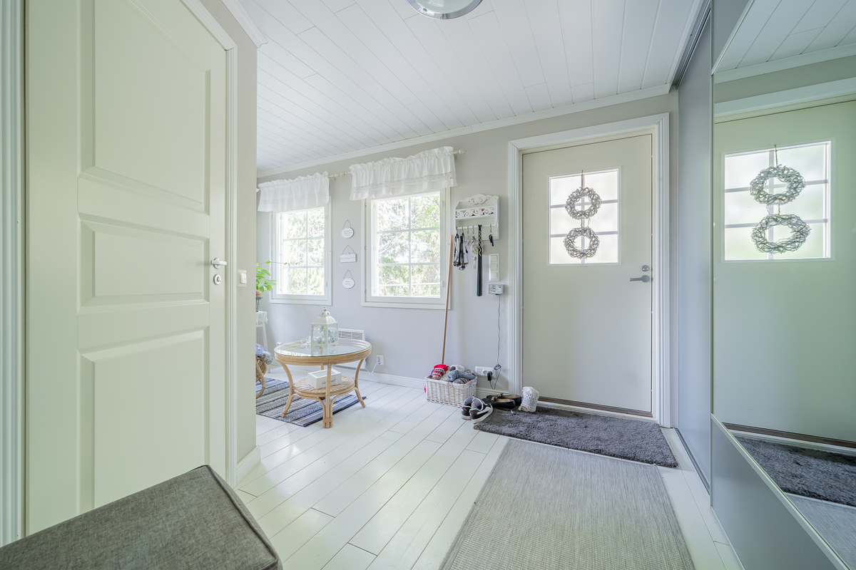 Tilava, upein liukuovin ja monin ikkunoin varustettu eteistila toivottaa tulijansa tervetulleeksi, joten käydään peremmälle… eteistilassa on myös kalustettu wc.