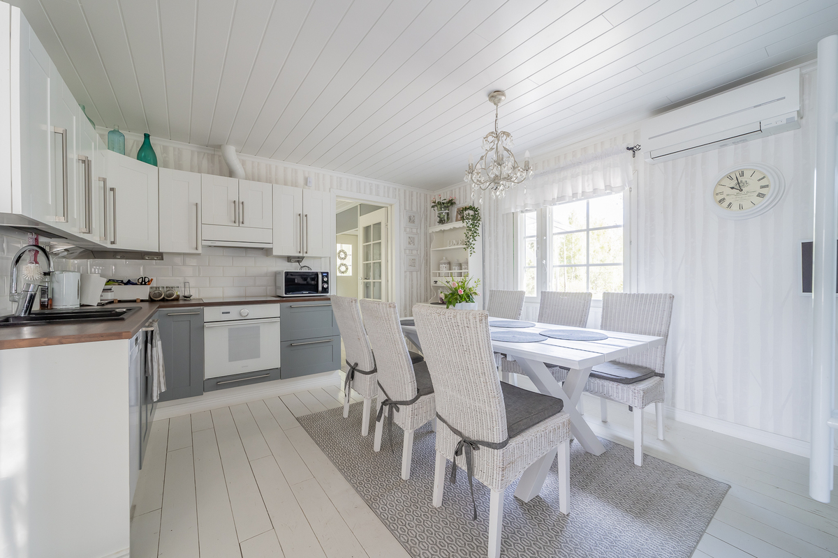 Vaaleasävyinen iso keittiö, jääkaappipakastin, induktioliesitaso, erillisuuni, liesituuletin, astianpesukone, ilmalämpöpumppu, keittiöön mahtuu iso ruokapöytä, seinillä tapetti, lautalattia