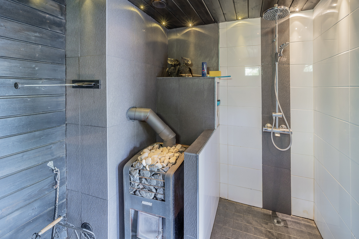 Saunassa puulämmitteinen kiuas, ikkuna, suihku, suihkuseinä, seinillä paneeli, laattalattia, lattialämmitys; saunakamarissa lautalattia, seinillä paneeli/koristelaatta, ikkuna
