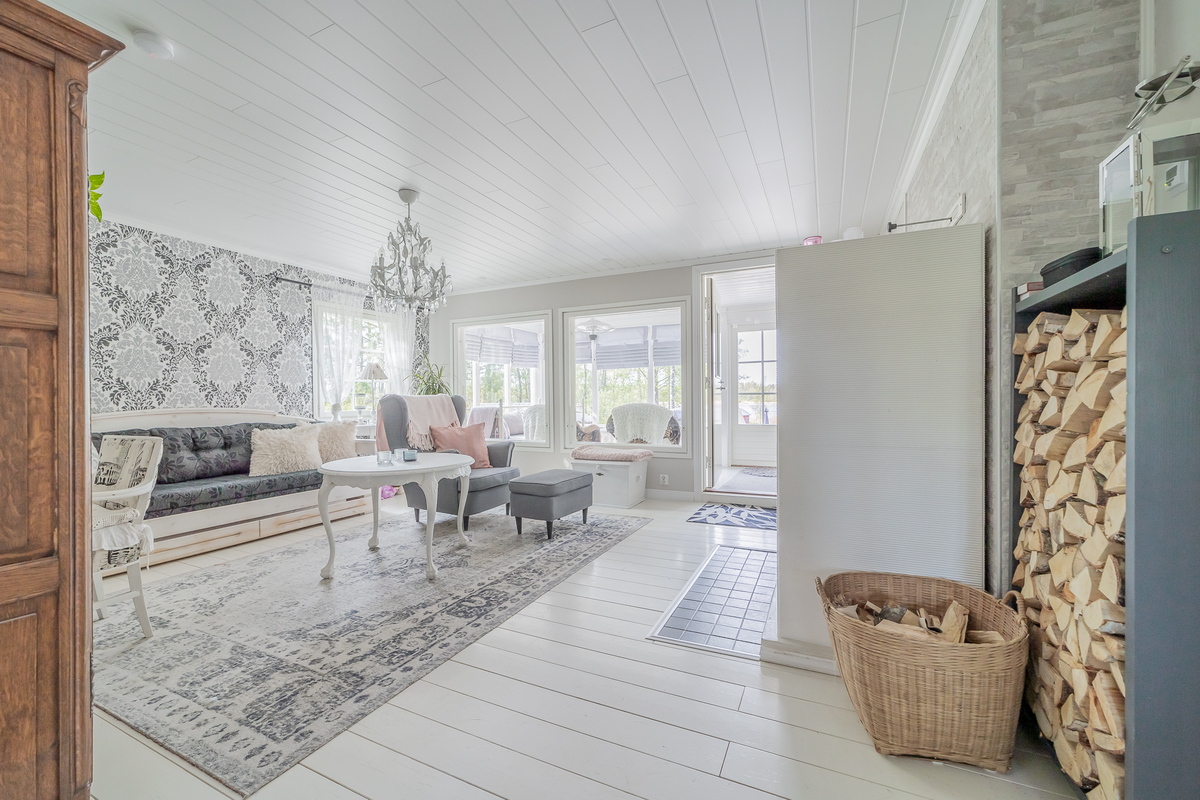 Olohuoneessa varaava Tulikiven takka, seinillä tapetti, lautalattia, olohuoneesta käynti isolle lasiterassille