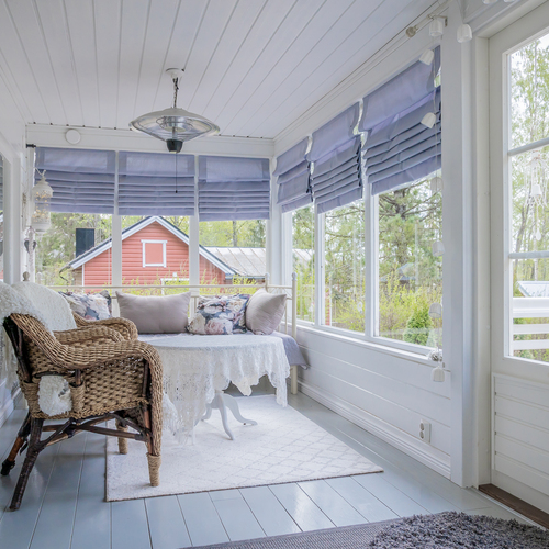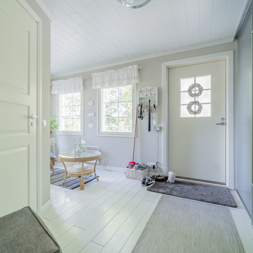 Iso eteishalli/kuisti, paljon ikkunoita, seinillä maali, lautalattia
