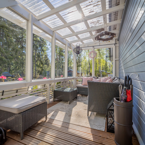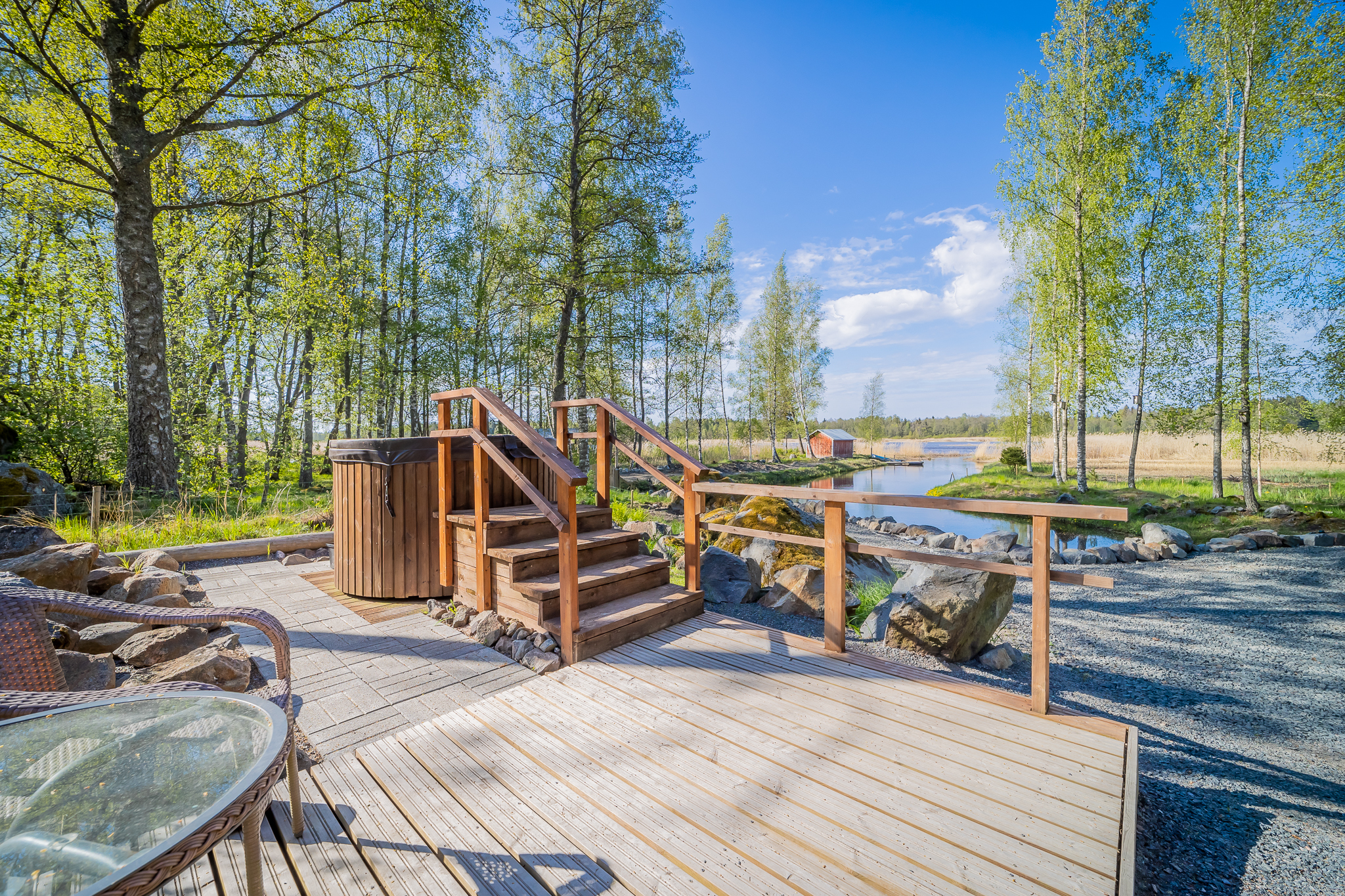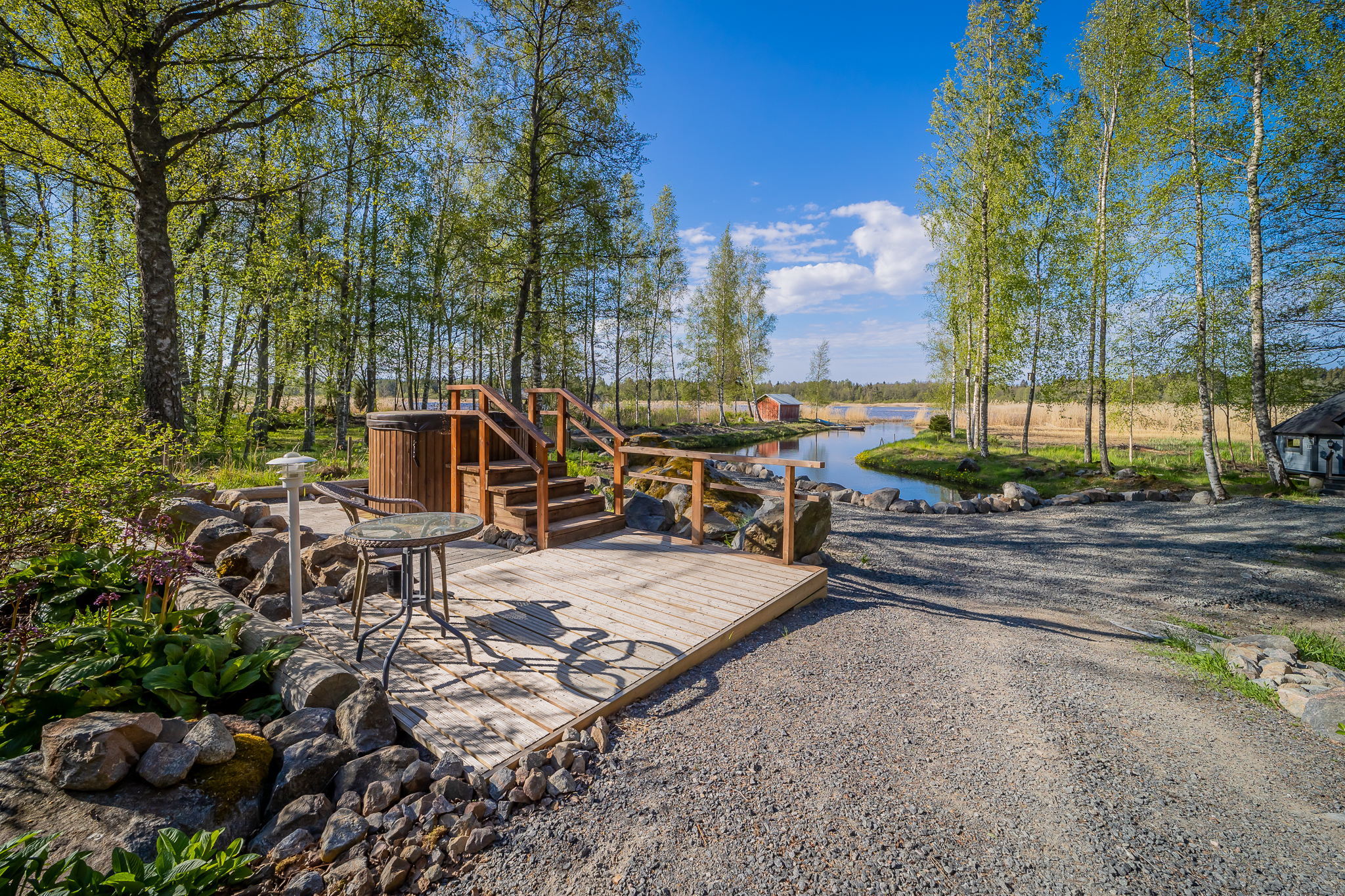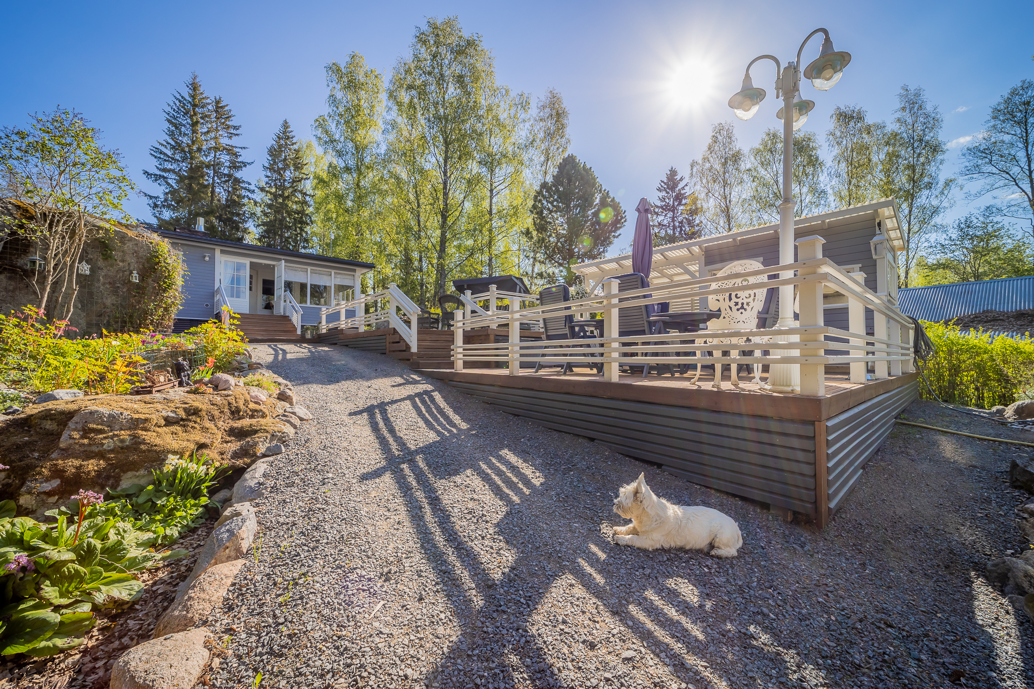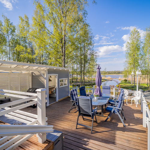 Asunnon edessä on katettu lasiterassi ja pihanpuolella se hieman isompi versio. Pihanpuolen lasiterassilta portaat alas ja sitten onkin terassia, ensimmäisellä tasolla oleskeluterassi, muutamaa askelmaa alempana upea kesäkeittiö terasseineen. Näitä terasseja alempana on vielä terassi, jonka yhteydessä on kaasulämmitteinen kylpytynnyri.