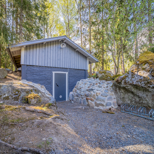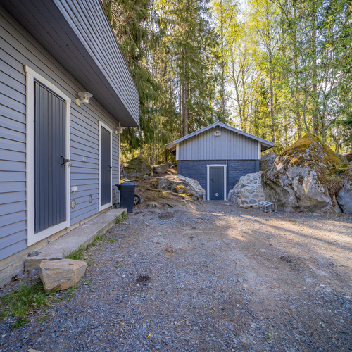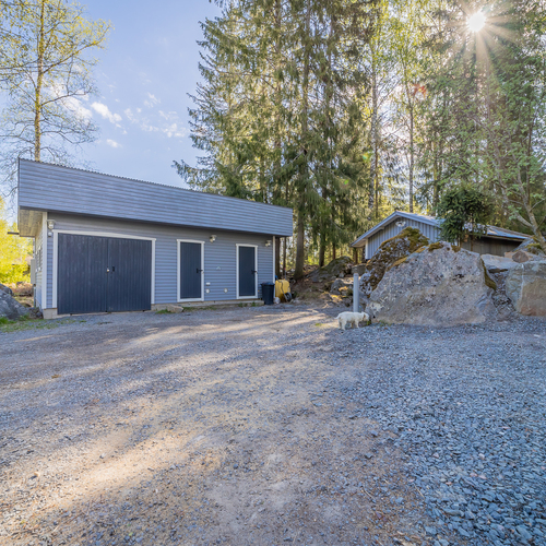 Piha-alueelle saavuttaessa on autotalli varastotiloineen sekä maakellari.